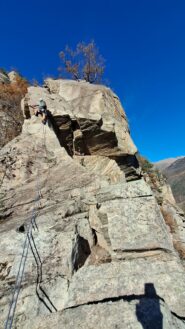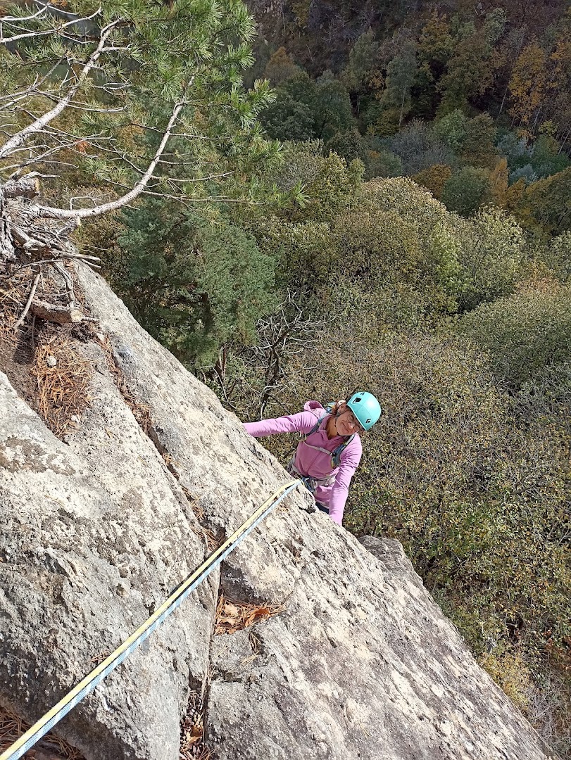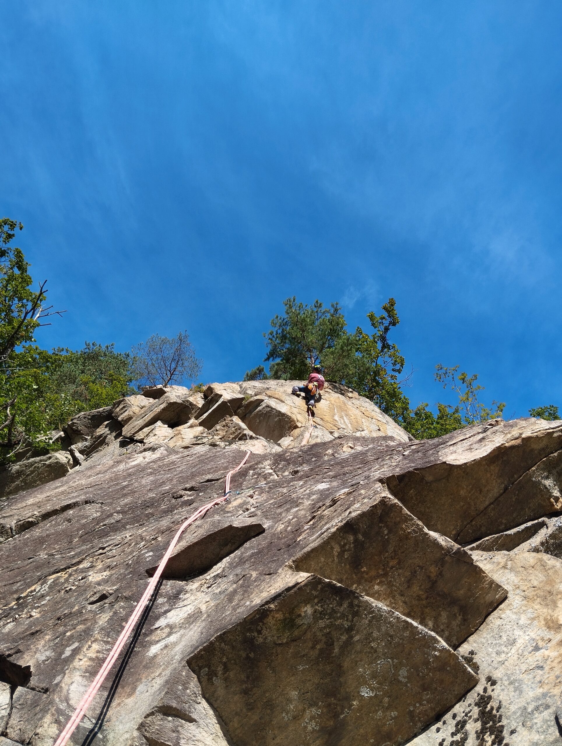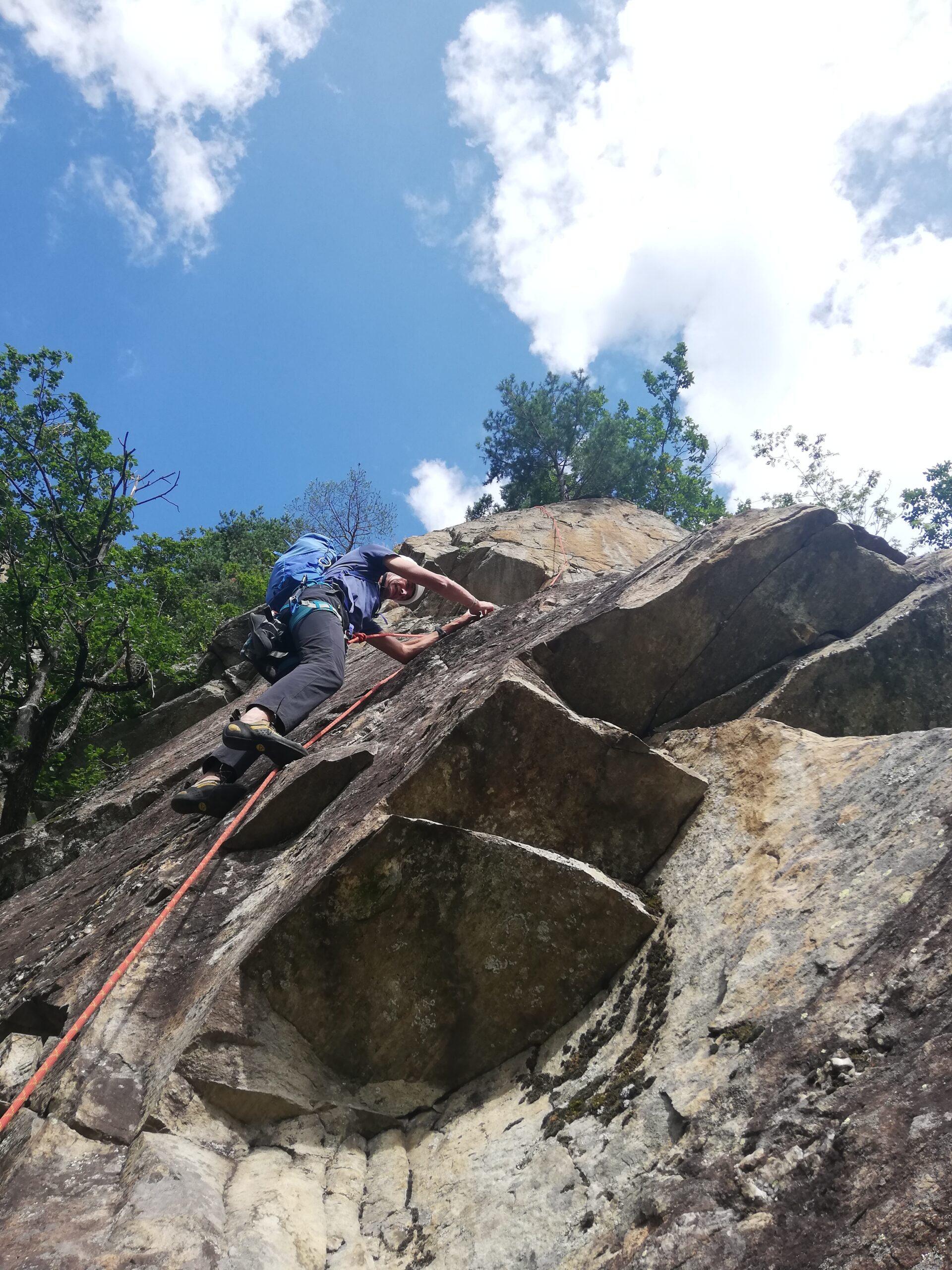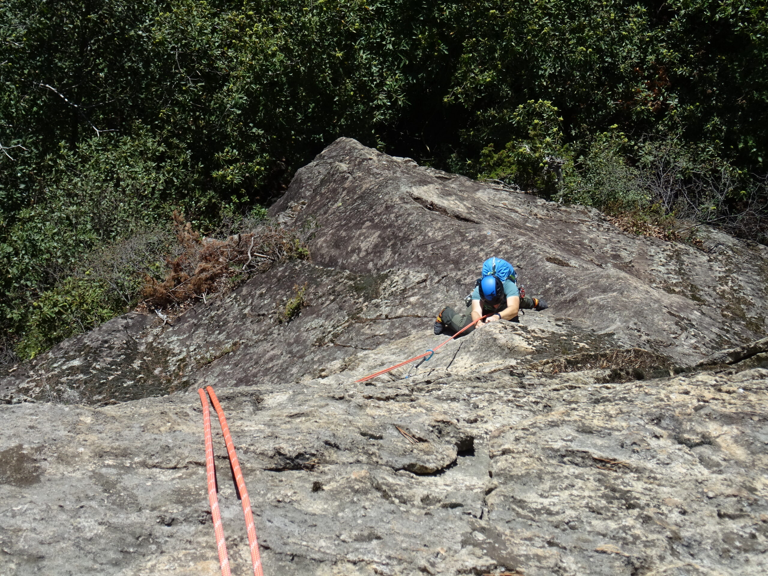 - L2: superare una placca sulla sx della sosta, quindi salire uno spigolino, un risalto più ripido (passo di 6a+) e quindi un muro arancione a grosse prese; 5b