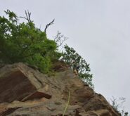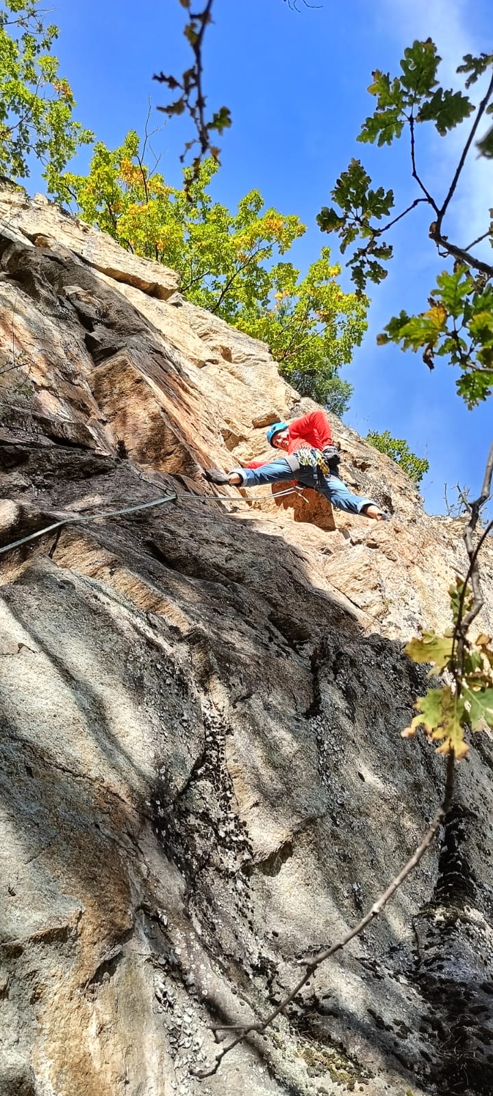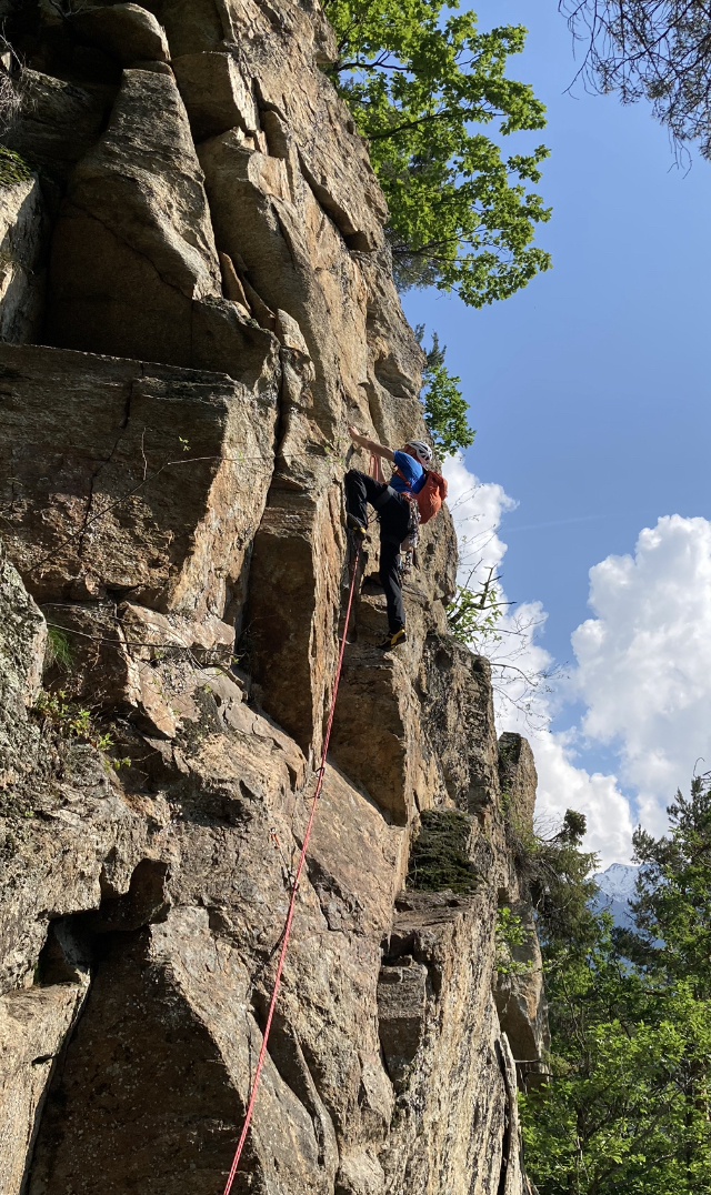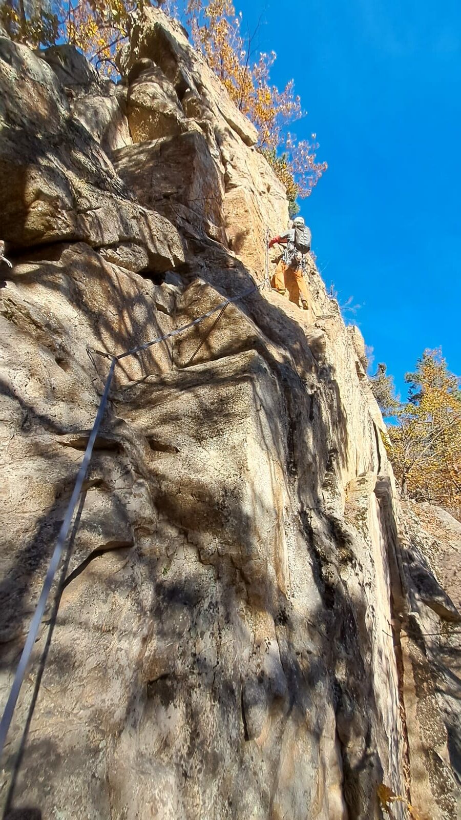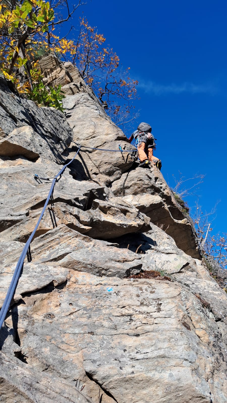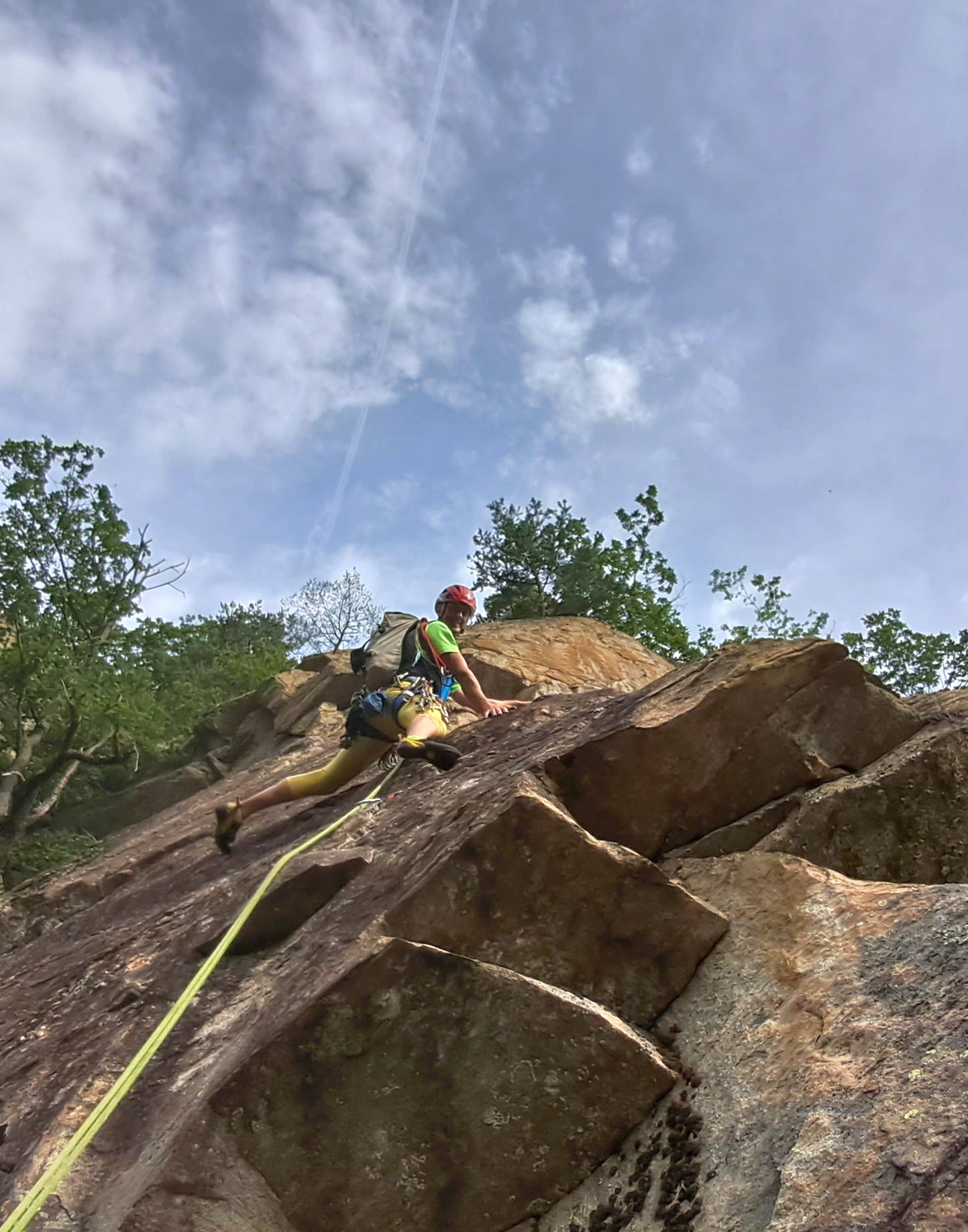 - L2: superare una placca sulla sx della sosta, quindi salire uno spigolino, un risalto più ripido (passo di 6a+) e quindi un muro arancione a grosse prese; 5b