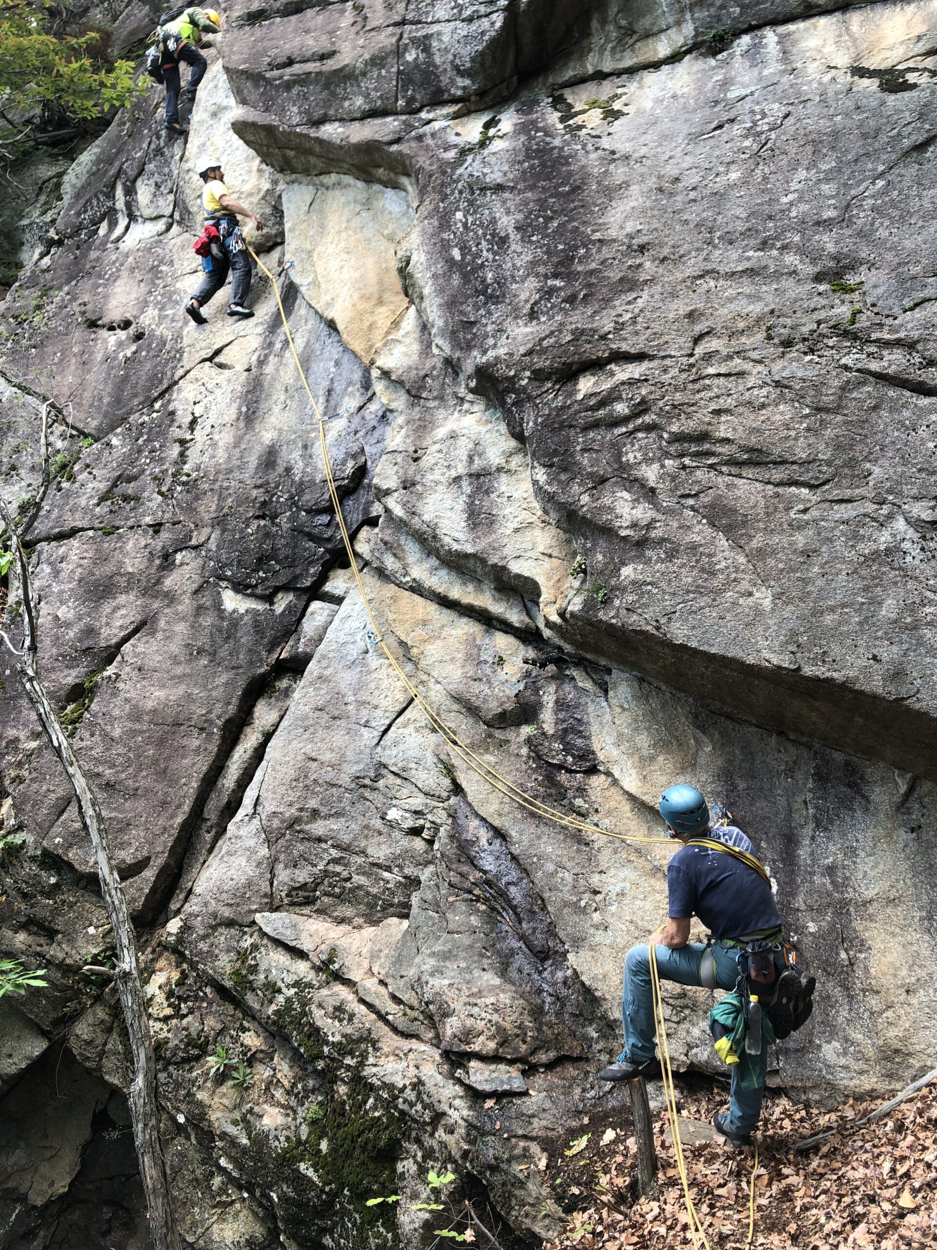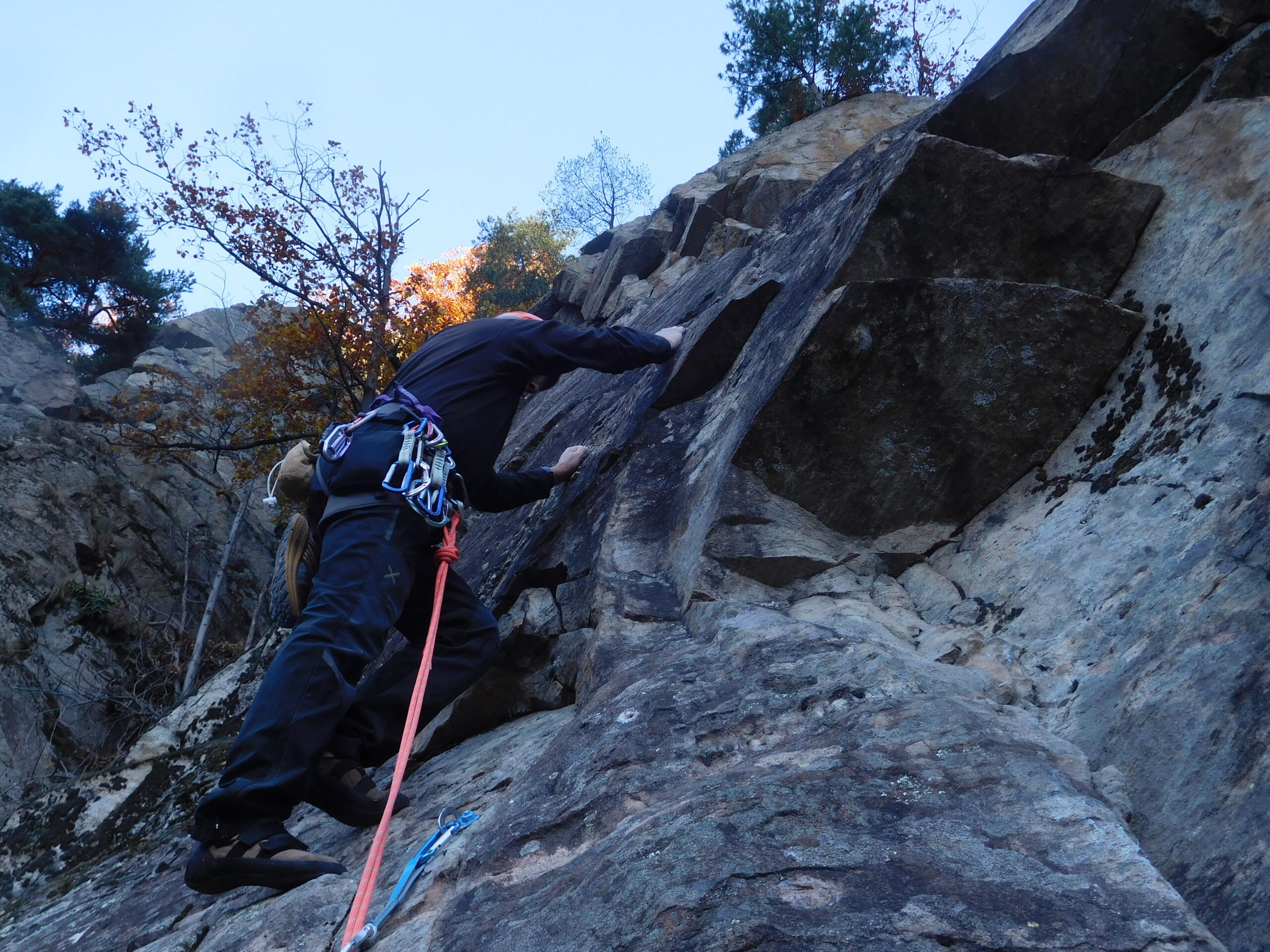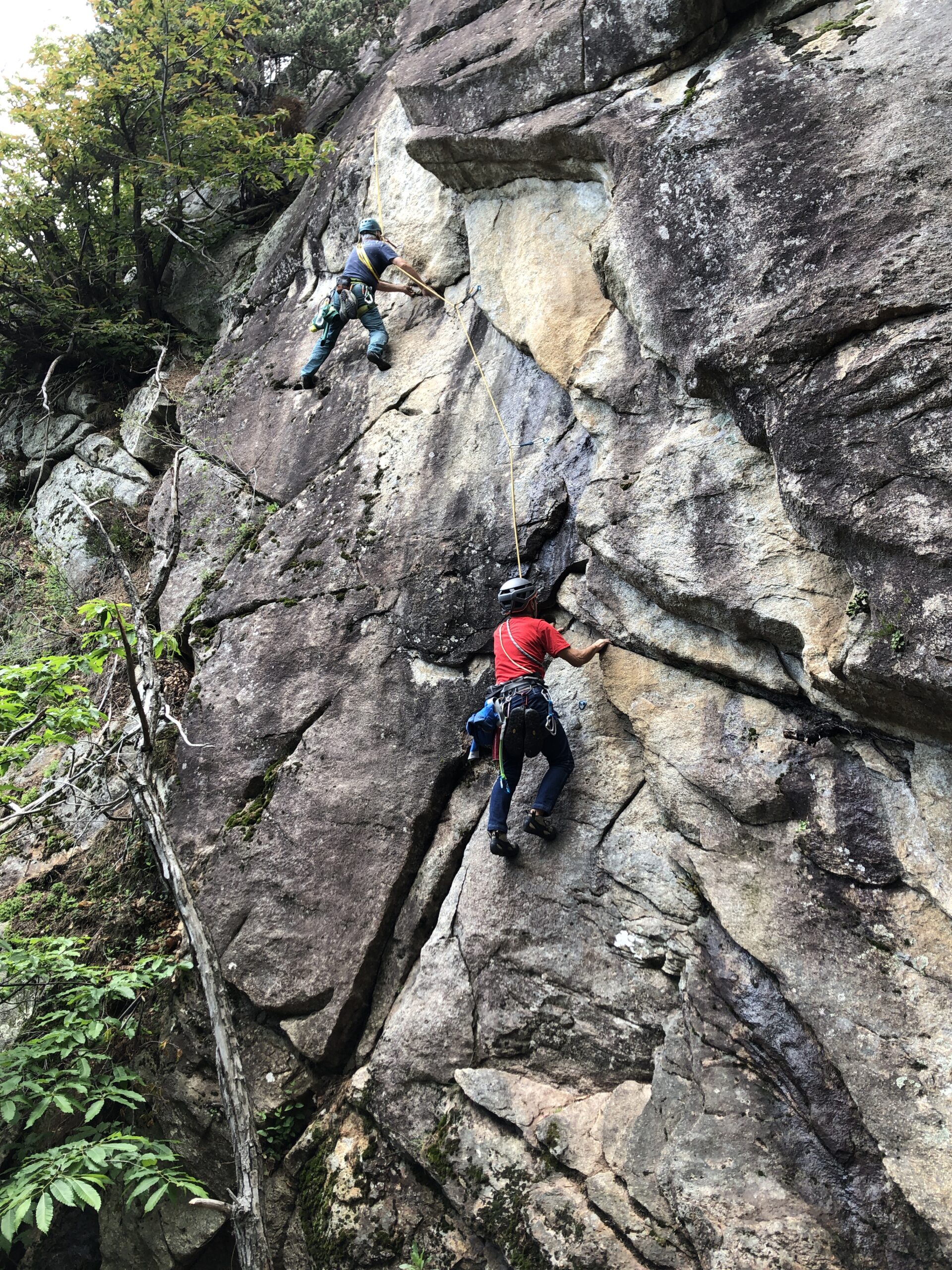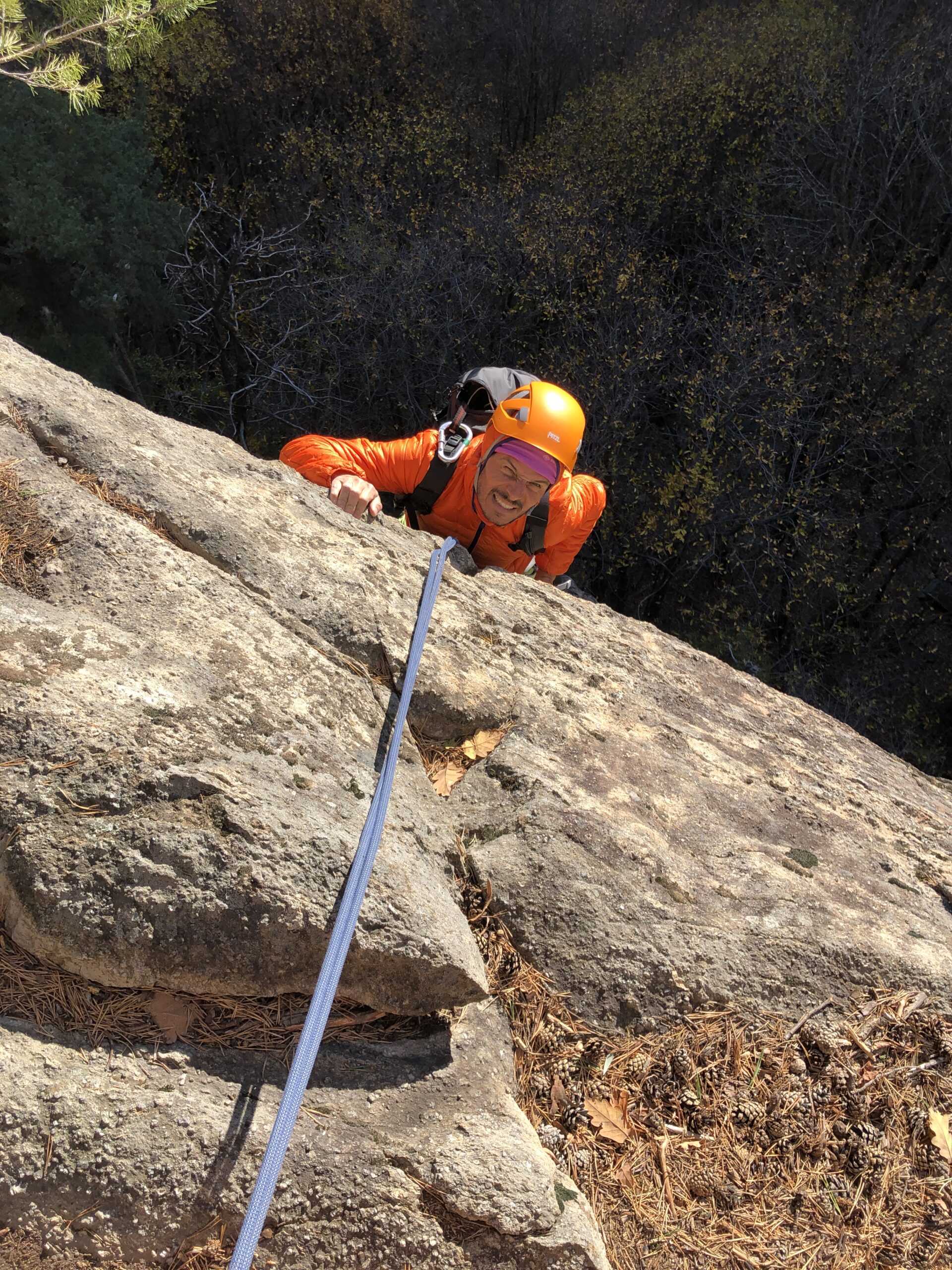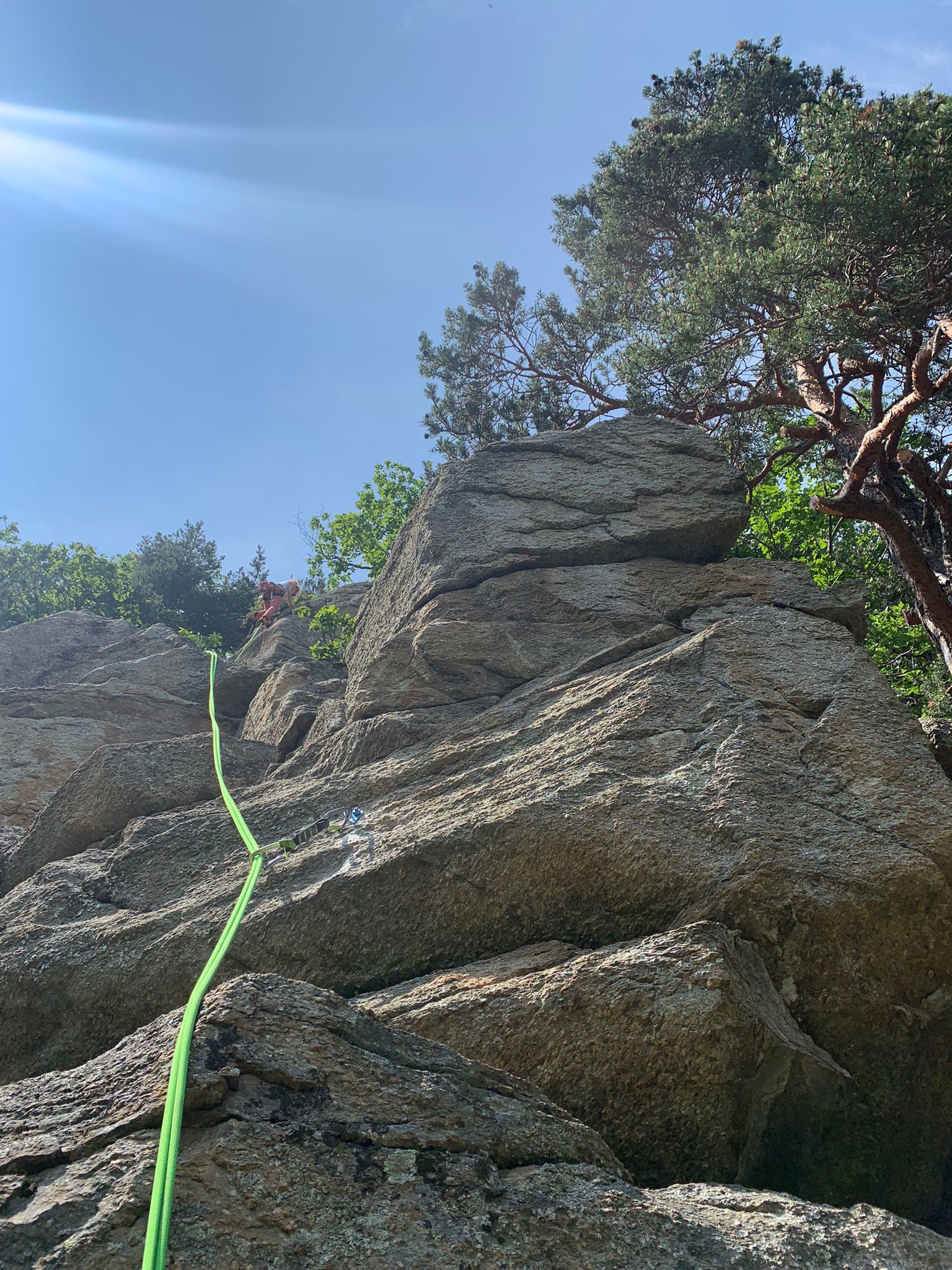 - L2: superare una placca sulla sx della sosta, quindi salire uno spigolino, un risalto più ripido (passo di 6a+) e quindi un muro arancione a grosse prese; 5b