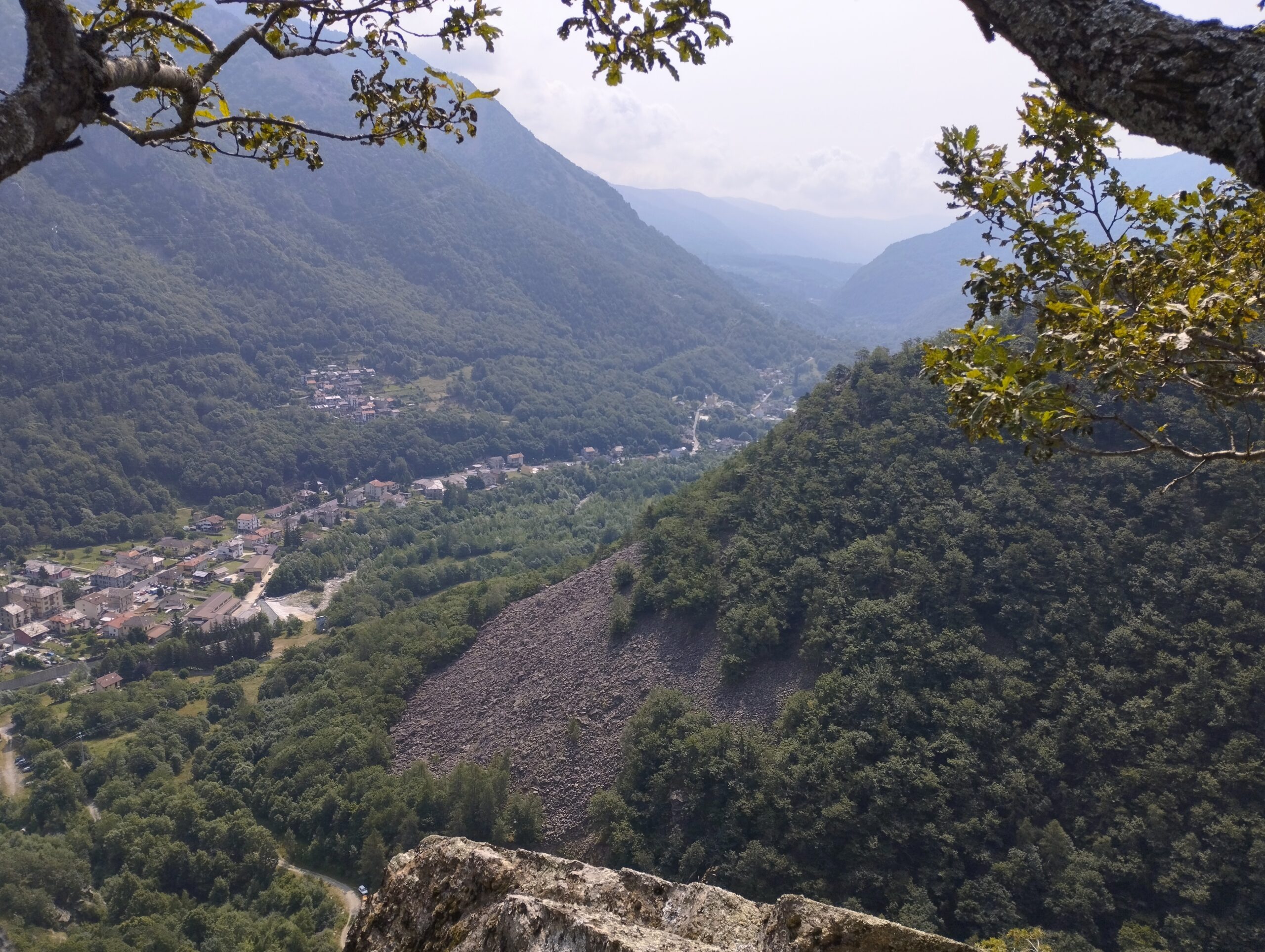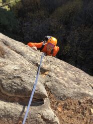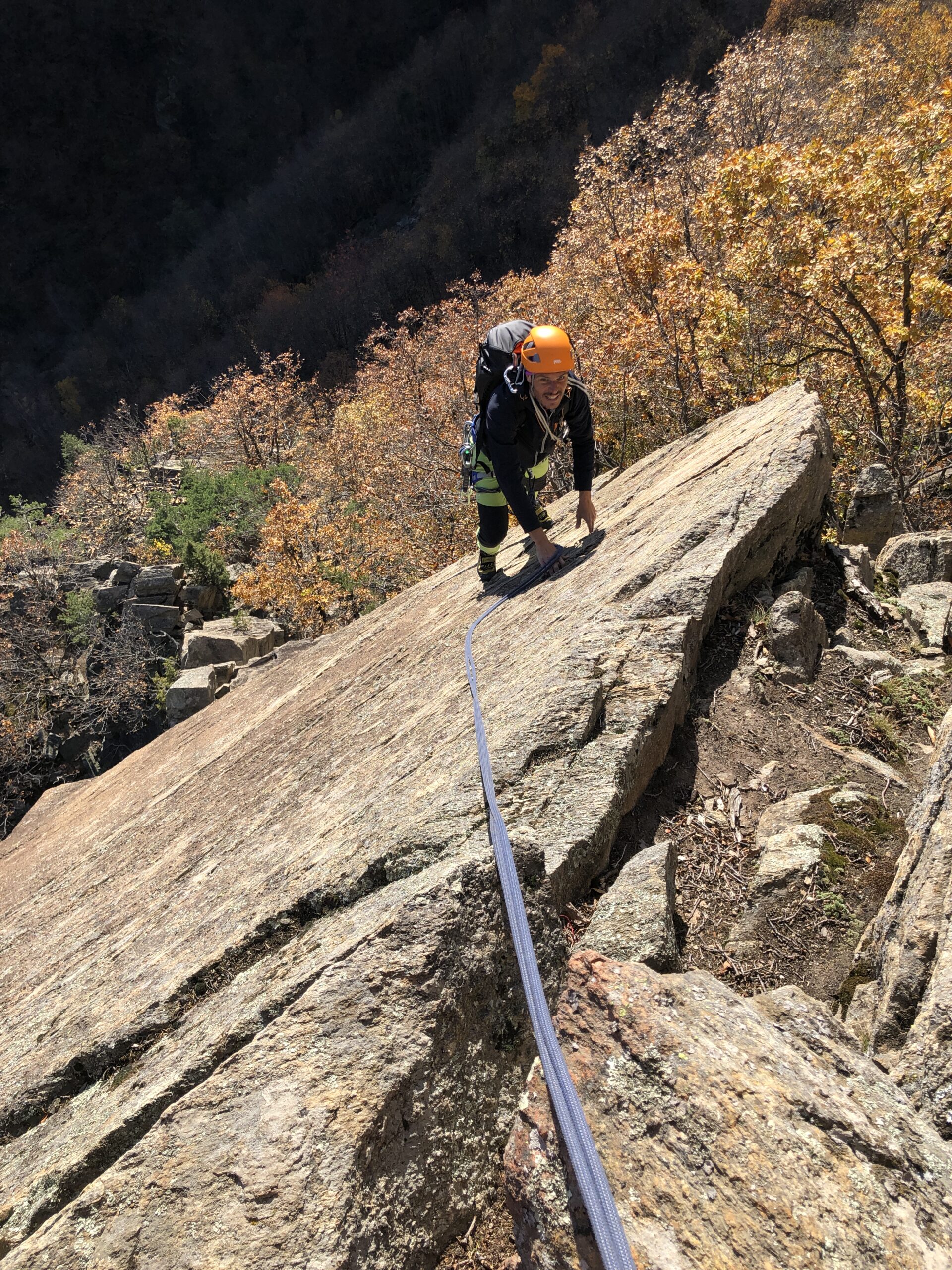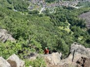DISCESA: Tre doppie da 30 metri (la prima seguendo il tiro finale fino alla penultima sosta, la seconda sulla parete lato Val Chisone e la terza attrezzata su piante), poi a piedi nel bosco per cenge e canaloni fino a ritornare all’attacco della via (ometti e segni di vernice).