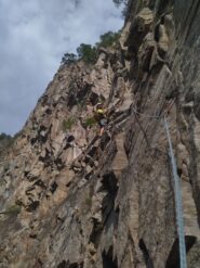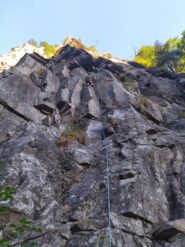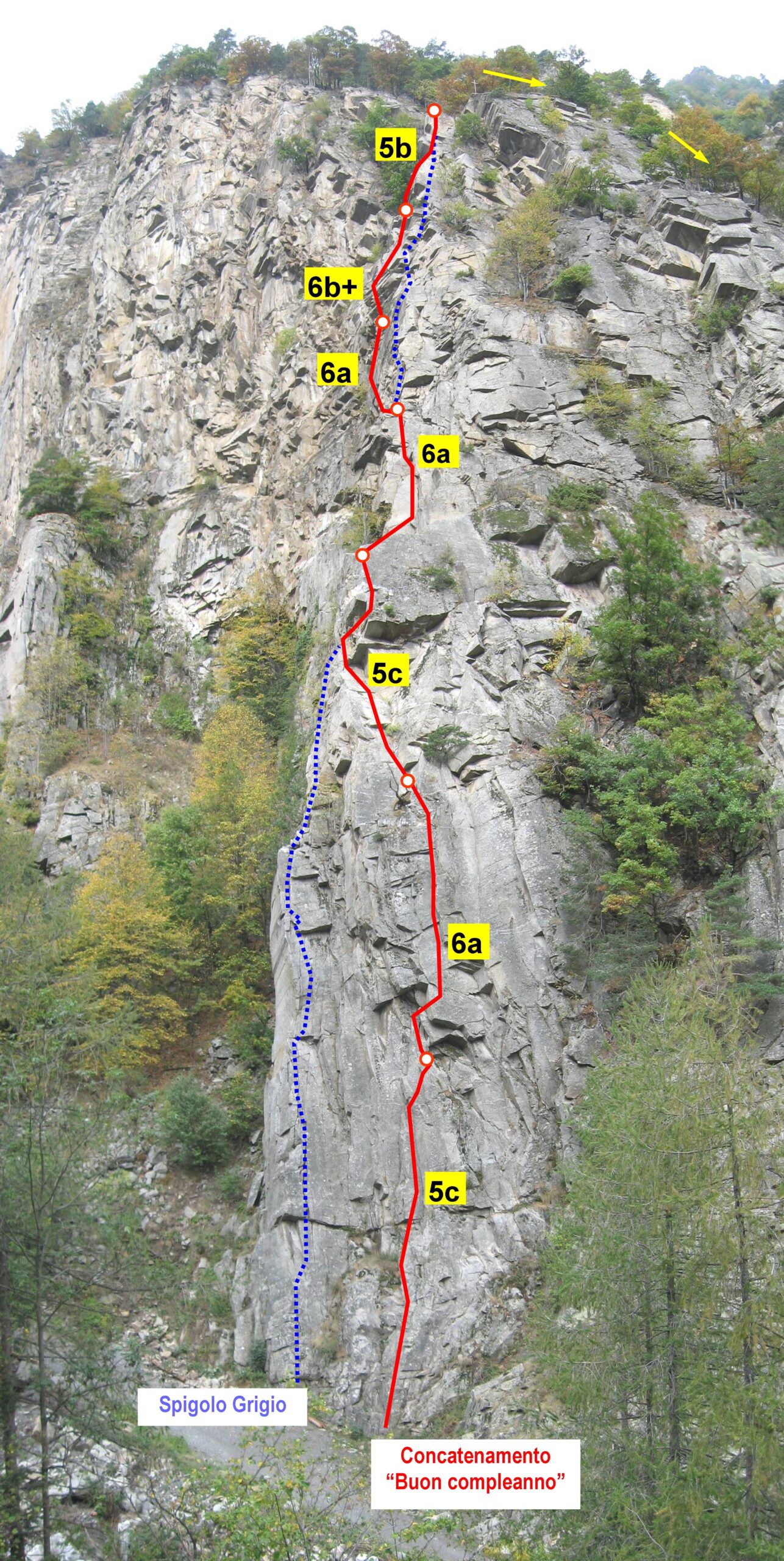 Salire i tre tiri della Variante dello Spigolo Grigio; al terrazzino con albero portarsi di fronte verso il camino del quarto tiro dello Spigolo grigio e salire la lunghezza integralmente; superare la sosta e spostarsi di qualche metro a sinistra (sosta su due spit con cordone) per affrontare successivamente gli ultimi 3 splendidi tiri della via “ Michelin – Martinelli” (l’ultimo tiro termina sull’uscita dello Spigolo grigio).