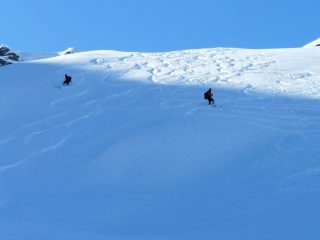 la prima parte di discesa al sole piuttosto molle e umida,poi discreta e ben sciabile,un pò lavorata dal vento.