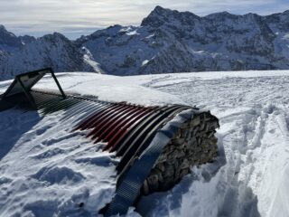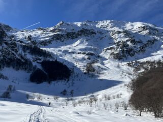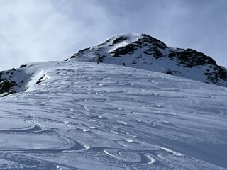 Oggi parecchi skialp sul percorso, ora ben tracciato sia in salita che in discesa. Condizioni molto buone con bella neve farinosa che tende a trasformate sui versanti al sole. Il traverso in alto che porta sul costone finale è sicuro.
