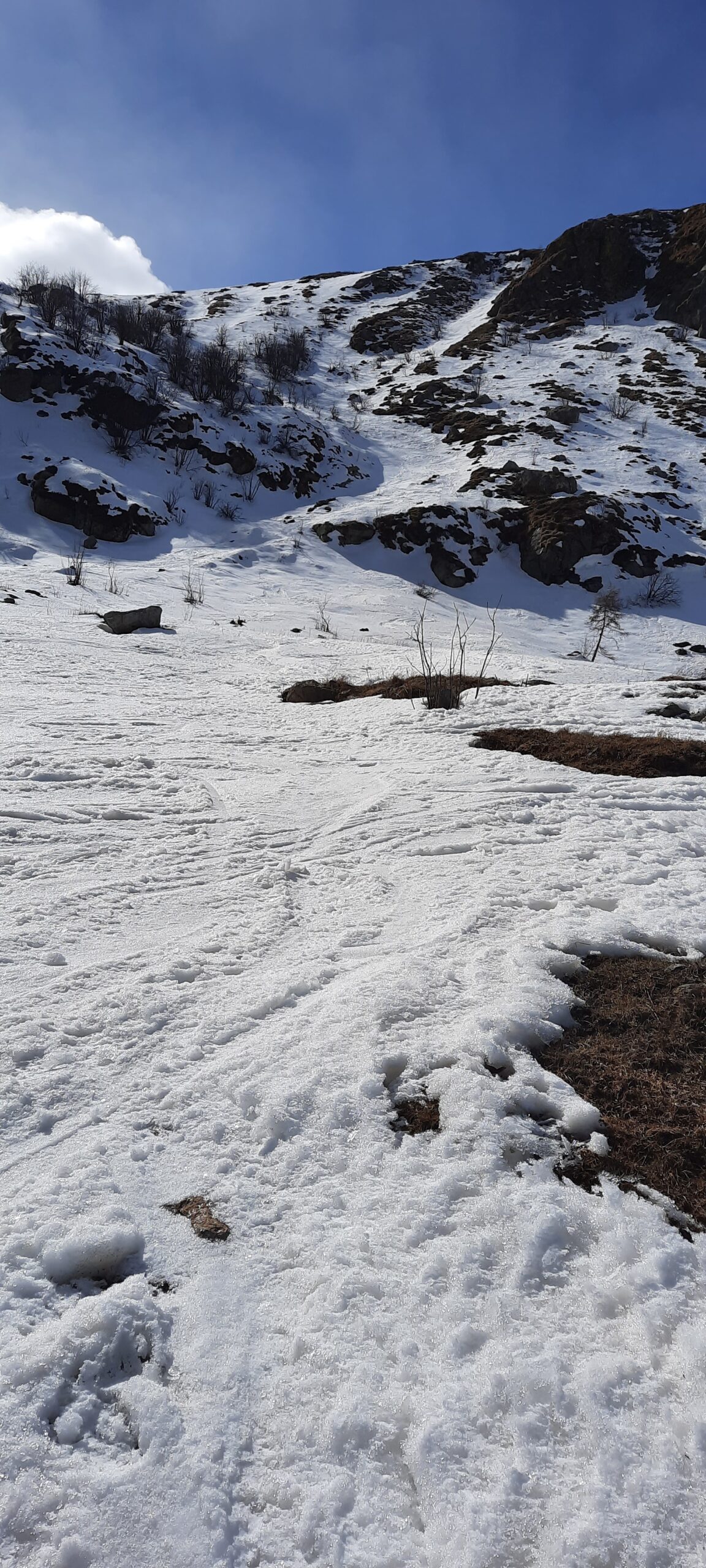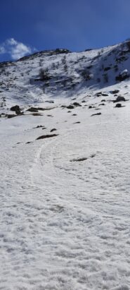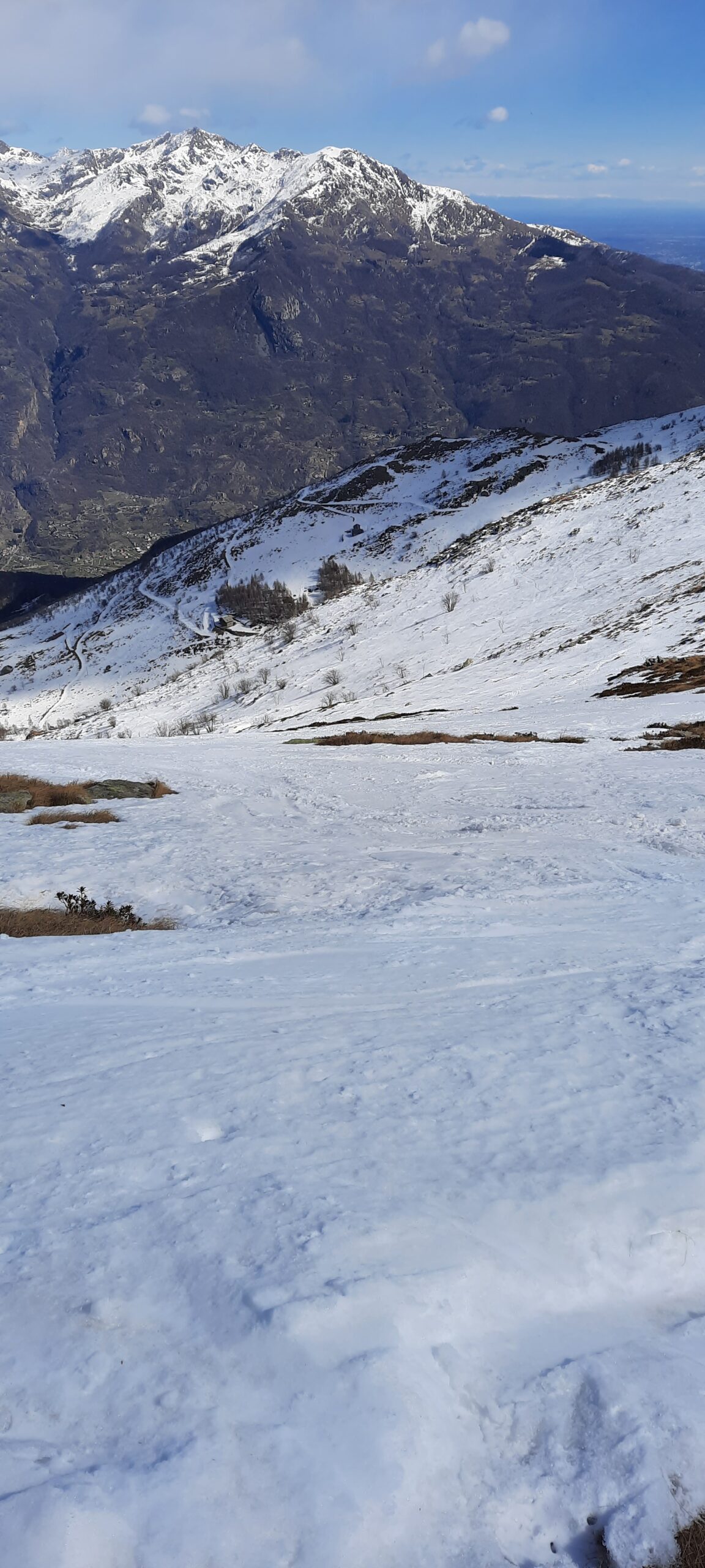 Si prosegue in direzione Sud imboccando uno dei 2 evidenti canali che ci si presentano davanti, arrivando sui pendii sommitali, puntando al colletto a destra (salendo) della Cima Bracca sulla cresta spartiacque con val Chiusella.
