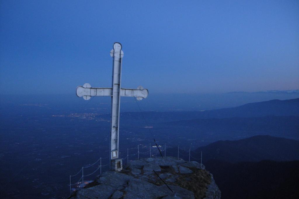 Salito con l’auto circa 1km dopo la fine del secondo tratto asfaltato. Partito alle 17:10, splendido panorama dalla Croce all’imbrunire, con le luci della pianura gia’ accese e un bagliore chiaro che si attardava facendo risaltare ad ovest le limpide cime delle Alpi.