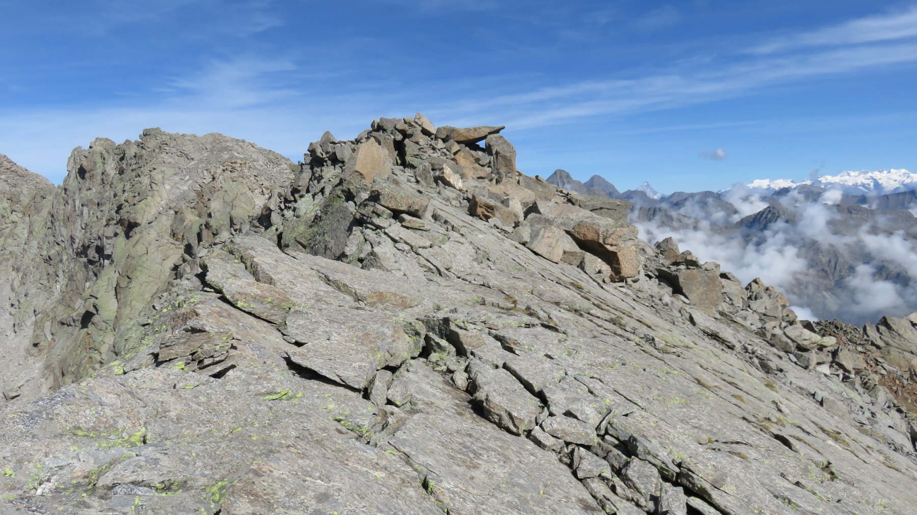 Ottimo panorama su Gialin, Moncimur e Gruppo Gran Paradiso. Dal passo piegare decisamente a destra percorrendo la cresta sud a lieve pendenza aggirando eventuali spuntoni e passando per la quota 2969, in breve si giunge alla base di un risalto a grossi blocchi che si supera a sinistra verso il lago ed in breve si tocca la massima sommità quota 3028, con tanto di triangolino posto dal CAI di Rivarolo Canavese.