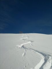 In alto sotto la cima ci sono ampi spazi pelati,ma tenendosi sulla sinistra,scendendo non si tocca. bella farina,a volte ventata ma scorrevole.Ripellato e tornati a quota 1945 ancora bella farina fino al combale,poi su strada ben battuta si arriva alla macchina con gli sci nei piedi.