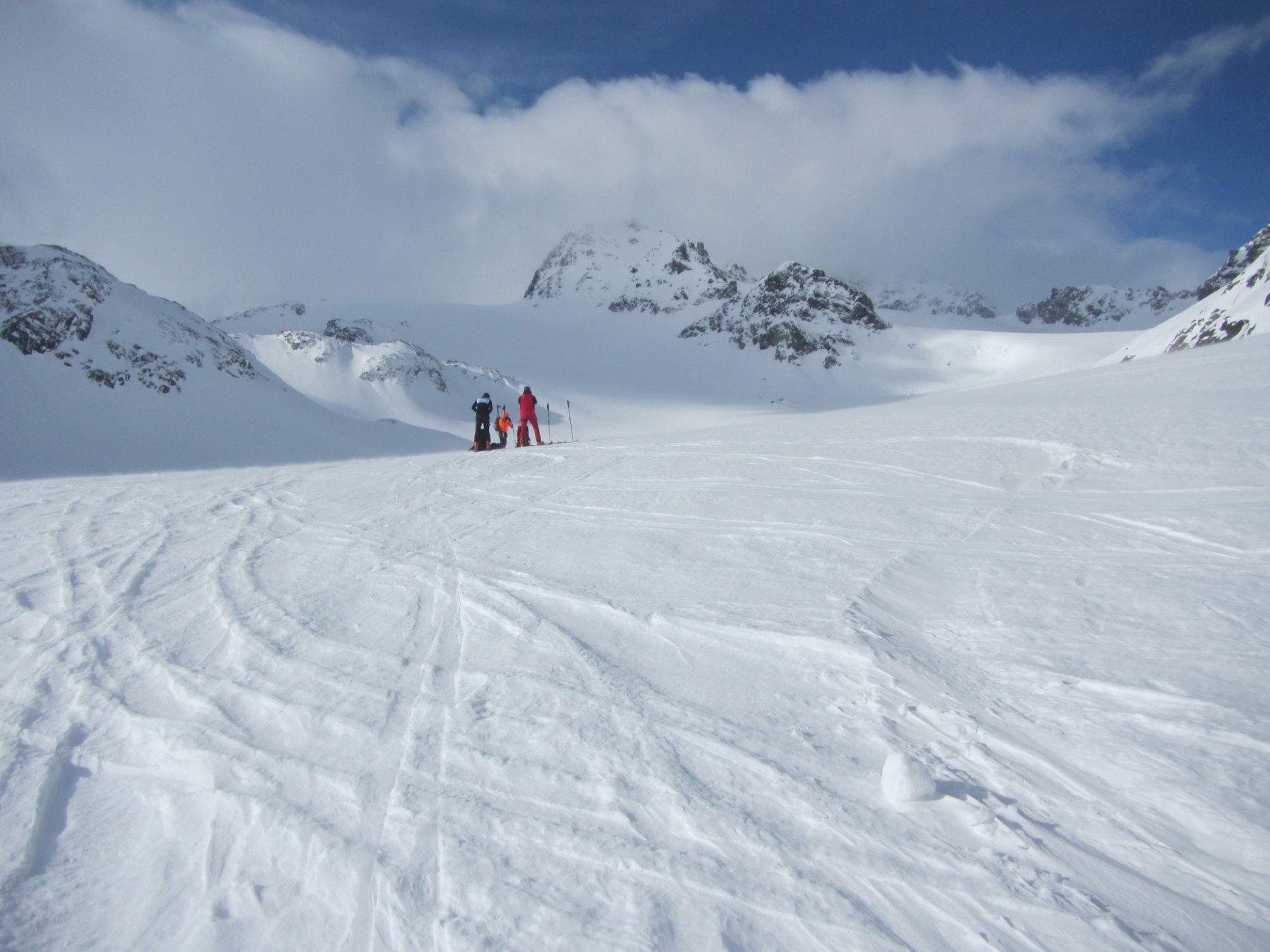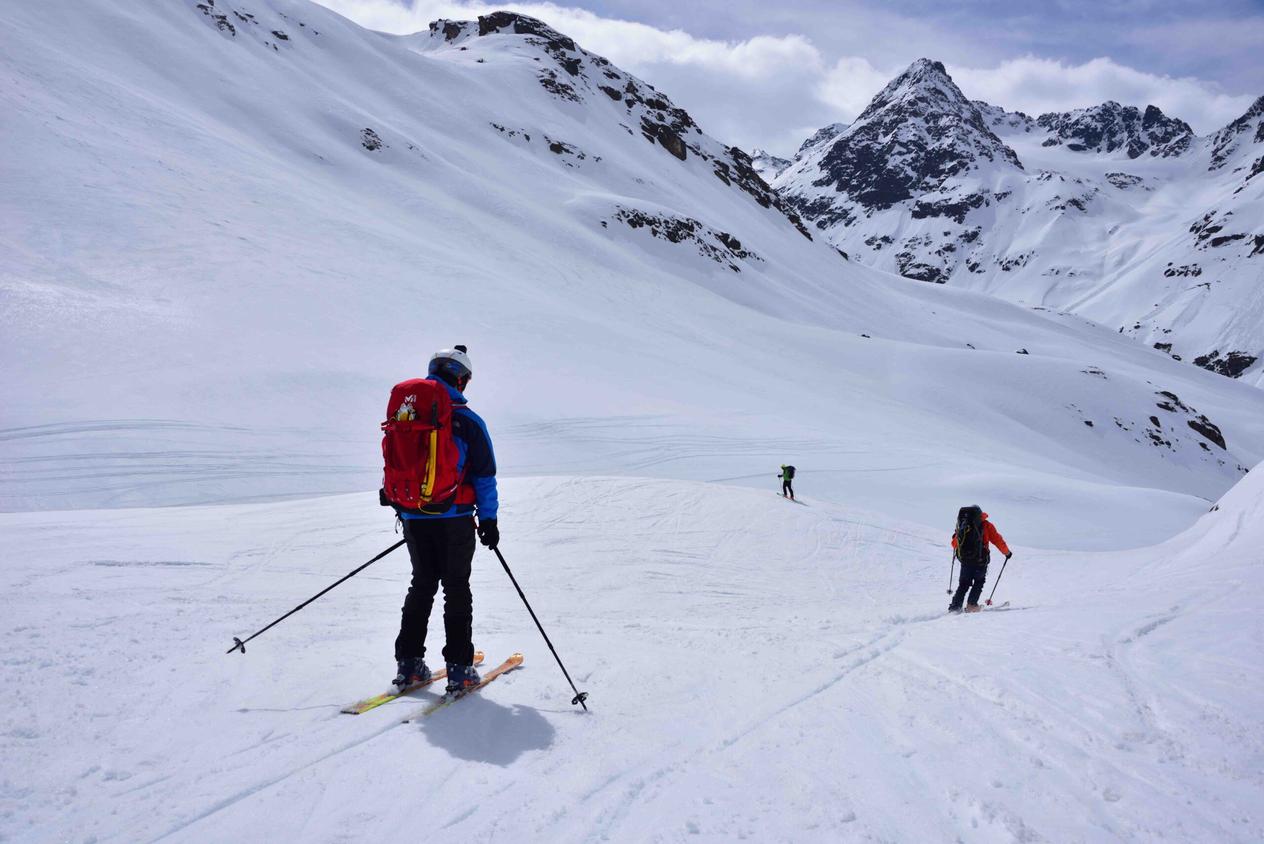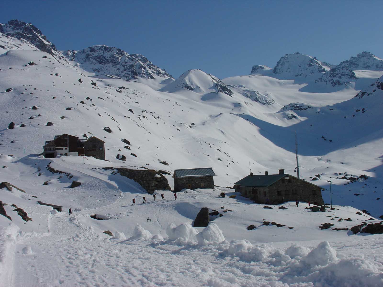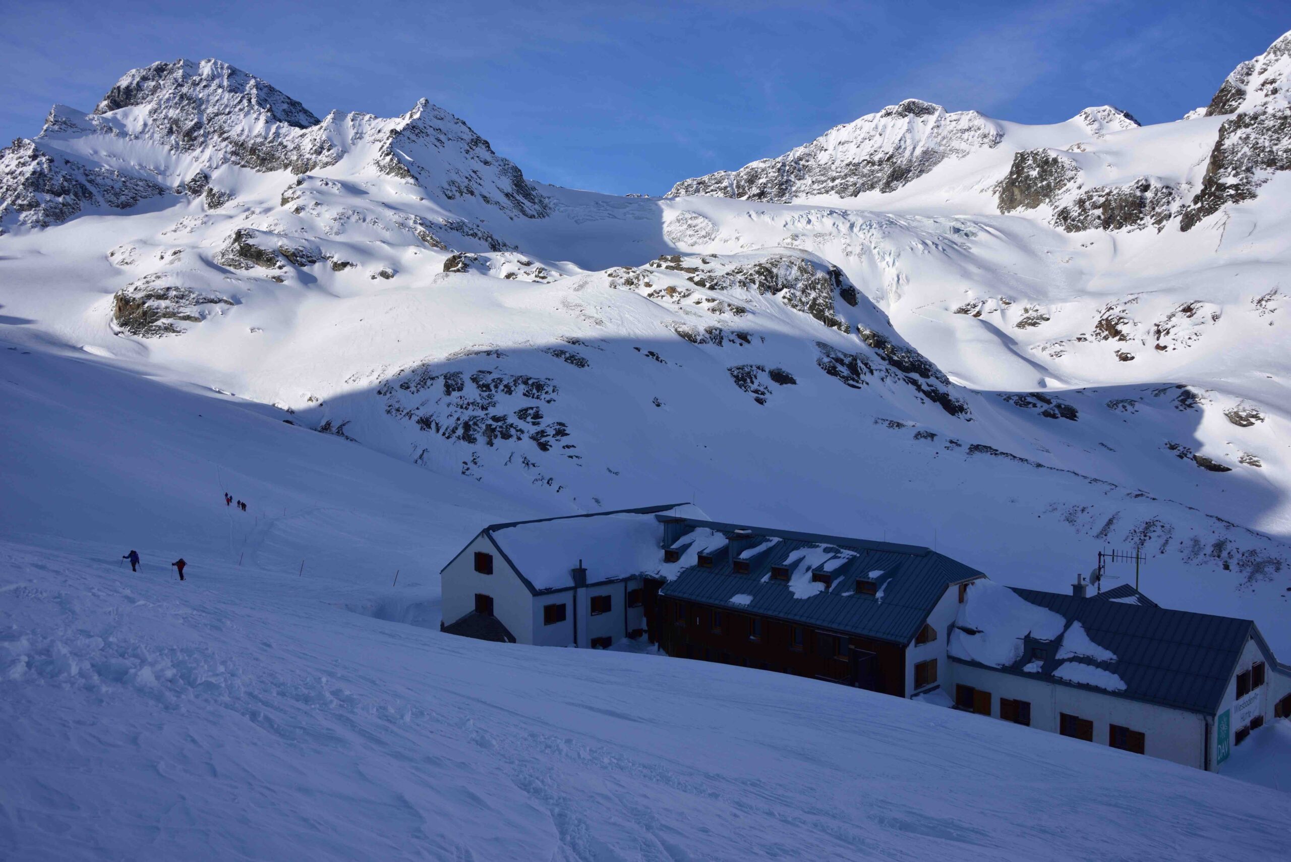 4° giorno: classica salita al Piz Buin 3312 m effettuando un semicerchio nella conca glaciale passando nei pressi del risalto roccioso Grune Kuppe 2579 m, attraversare in piano a destra la lingua del ghiacciaio Ochsentaler Gletscher e superare il risalto a lato della seraccata, portarsi quasi al centro dell’ampio pianoro glaciale e puntare alla sella Buinluke 3054 m, lasciare gli sci e con piccozza e ramponi salire al Piz Buin. In discesa seguire l’itinerario di salita fino al pendio a lato ed alla base della seraccata, quindi anzichè effettuare l’ampio traverso in semicerchio, scendere direttamente l’avvallamento fino a quota 2.300 e risalire con le pelli al rifugio.