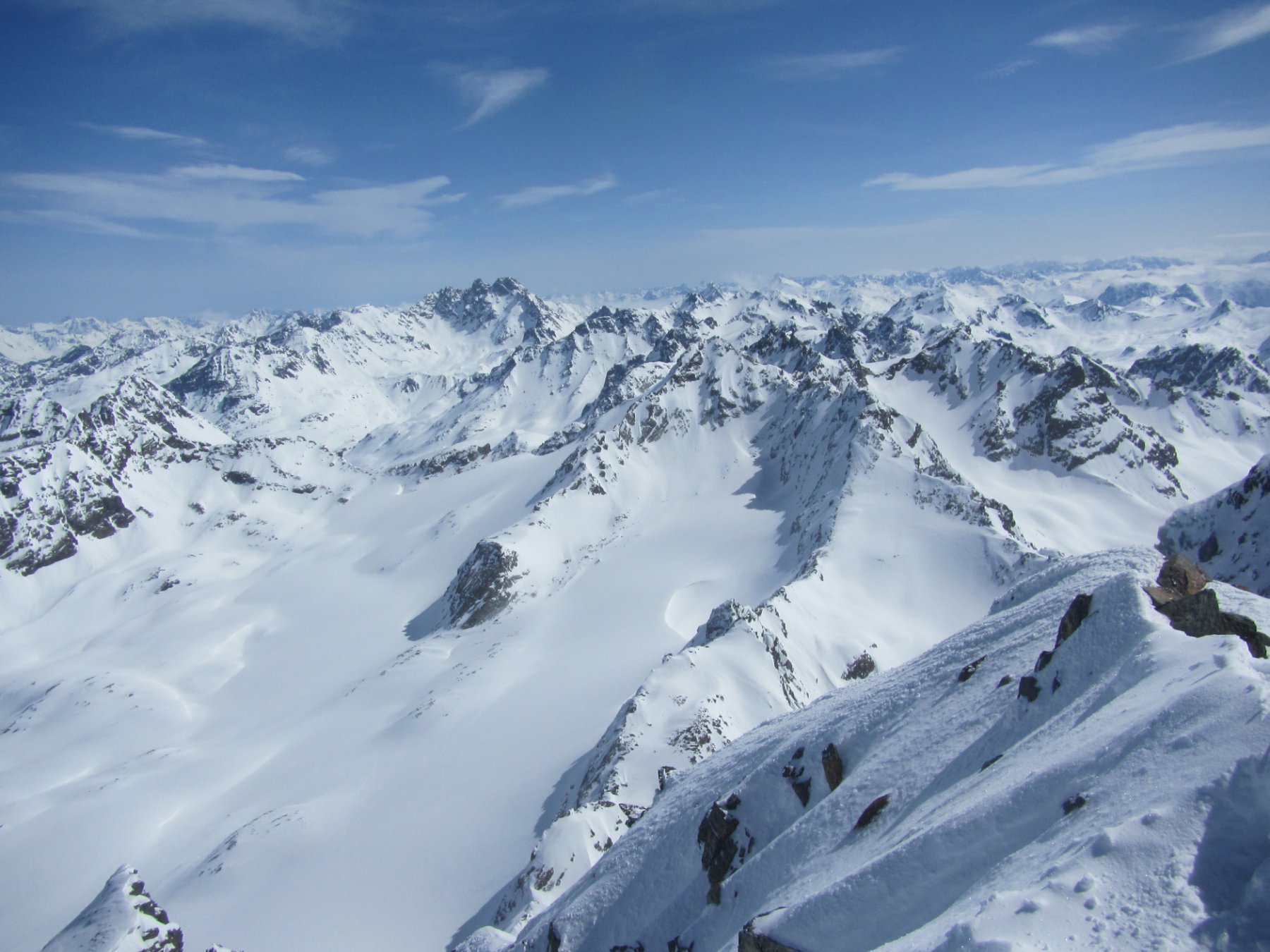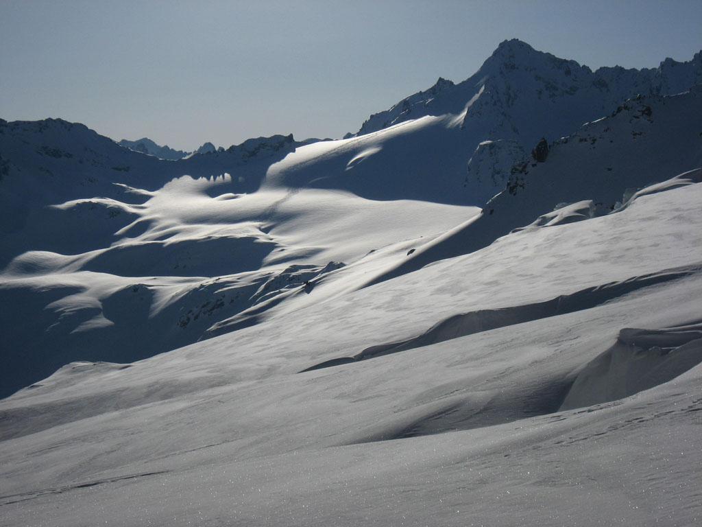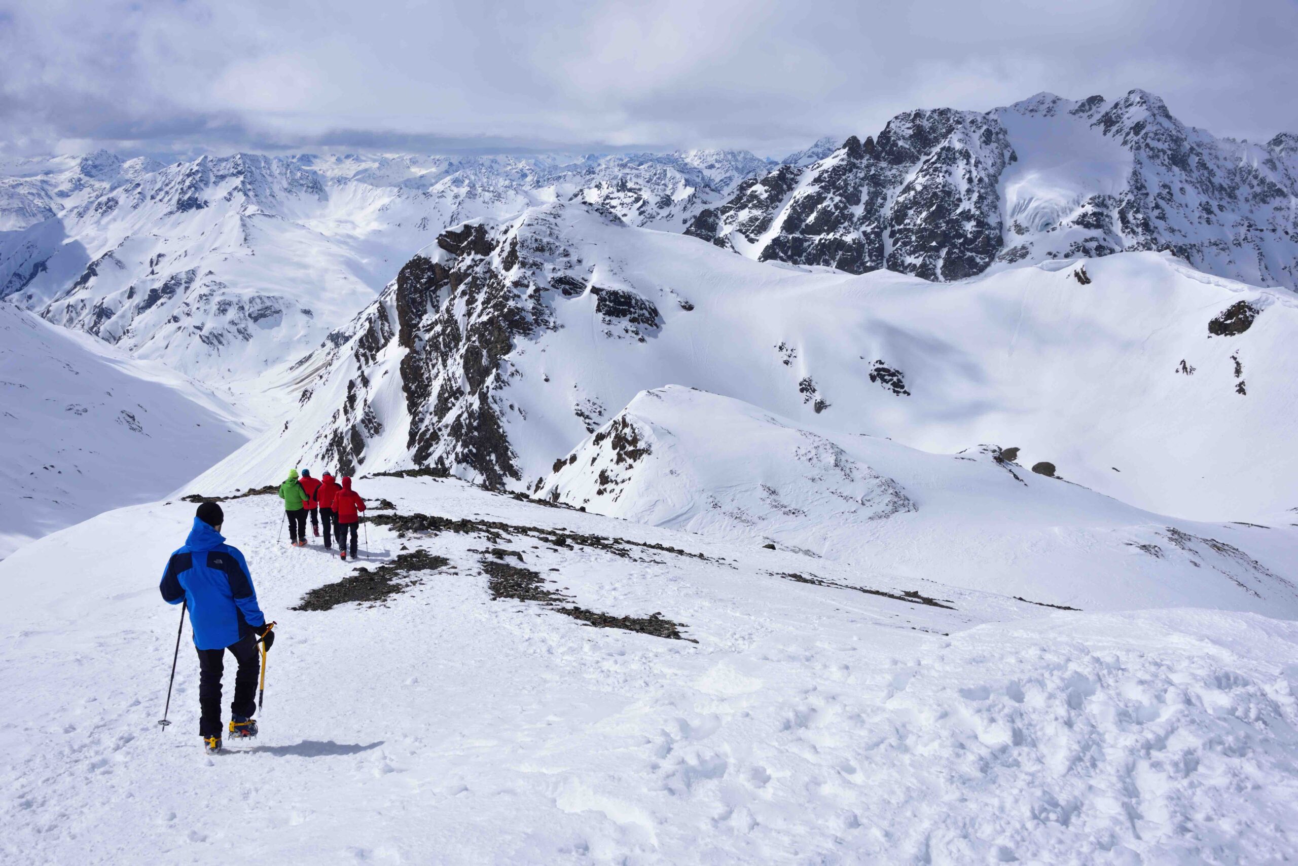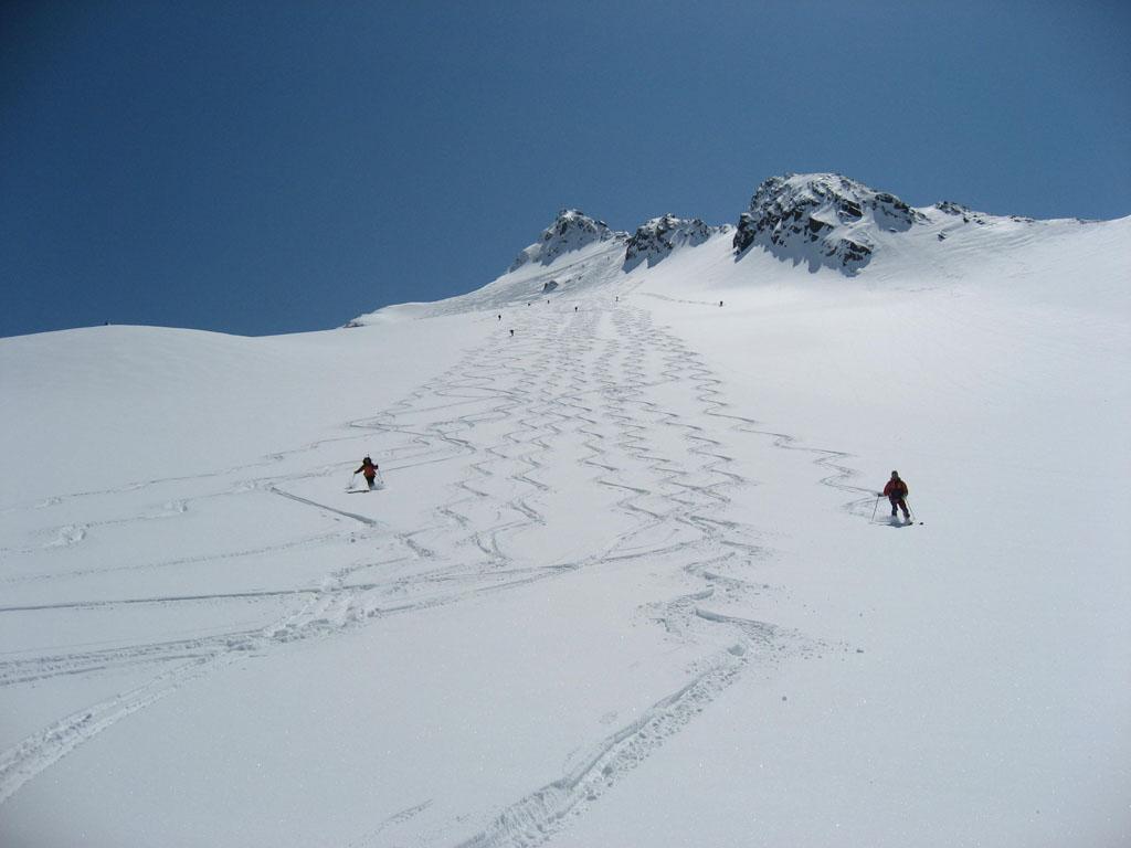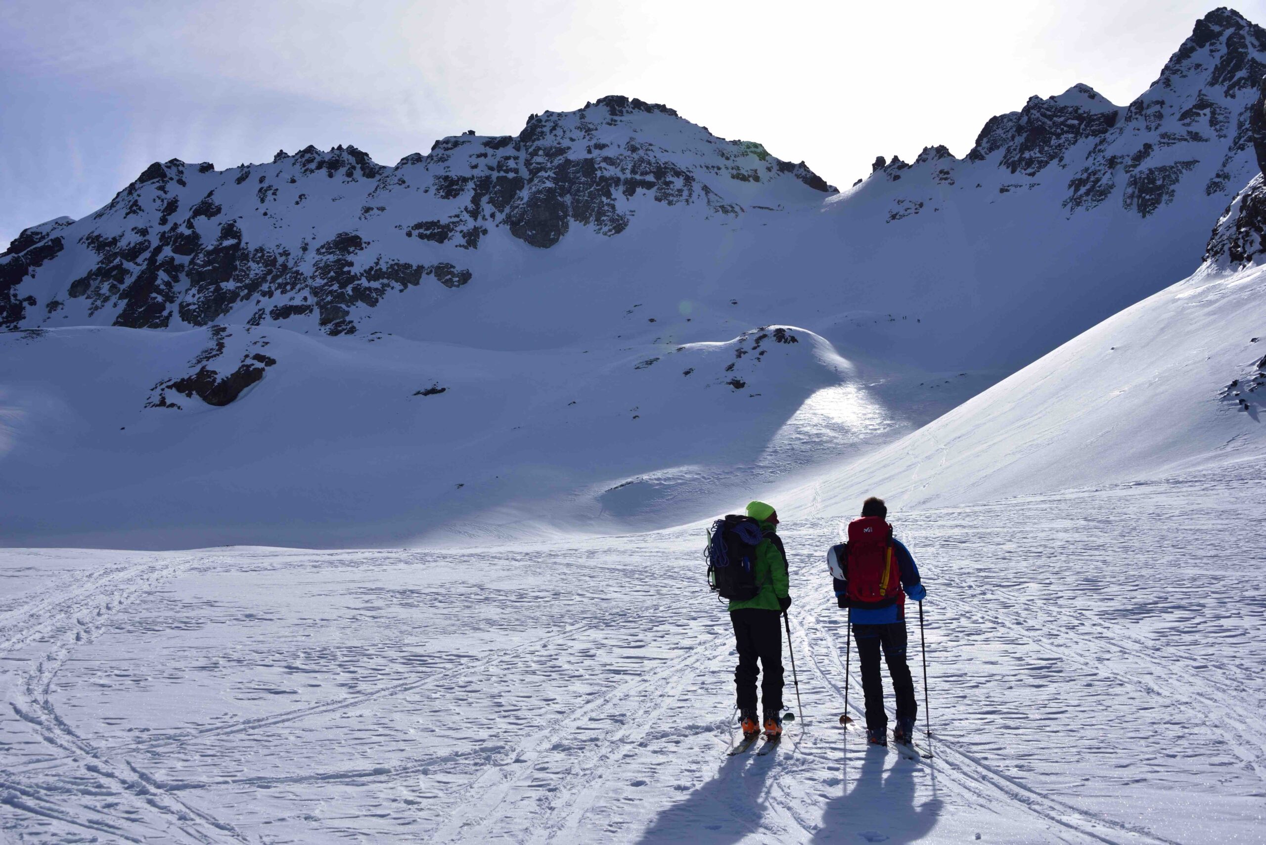 4° giorno: classica salita al Piz Buin 3312 m effettuando un semicerchio nella conca glaciale passando nei pressi del risalto roccioso Grune Kuppe 2579 m, attraversare in piano a destra la lingua del ghiacciaio Ochsentaler Gletscher e superare il risalto a lato della seraccata, portarsi quasi al centro dell’ampio pianoro glaciale e puntare alla sella Buinluke 3054 m, lasciare gli sci e con piccozza e ramponi salire al Piz Buin. In discesa seguire l’itinerario di salita fino al pendio a lato ed alla base della seraccata, quindi anzichè effettuare l’ampio traverso in semicerchio, scendere direttamente l’avvallamento fino a quota 2.300 e risalire con le pelli al rifugio.
