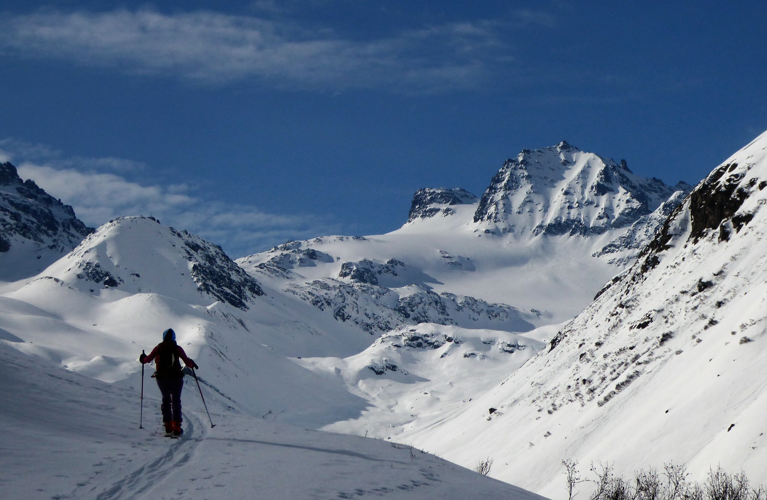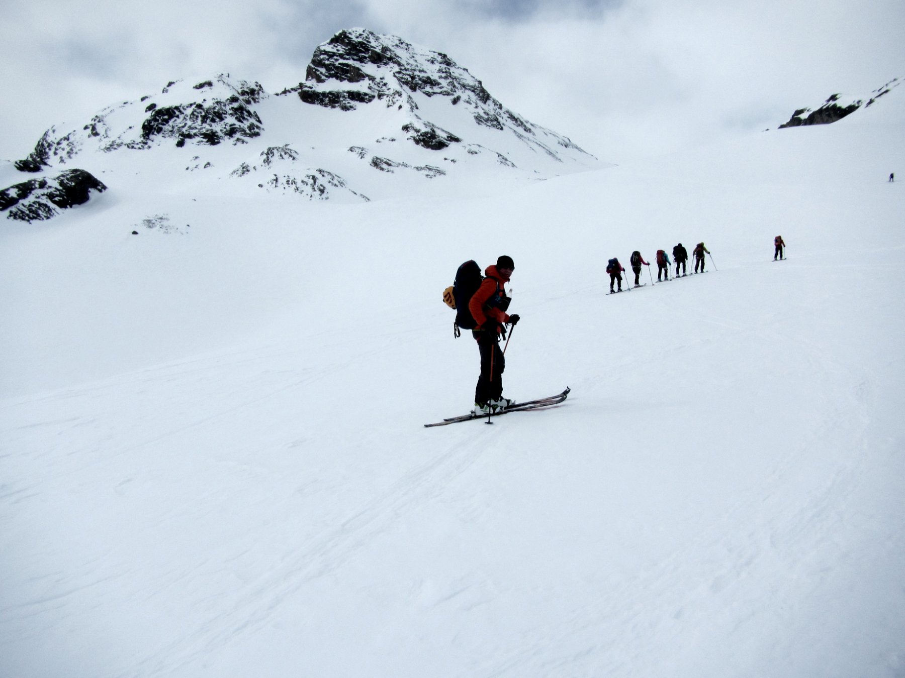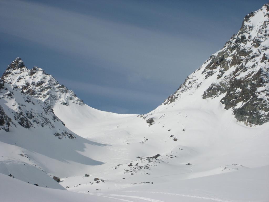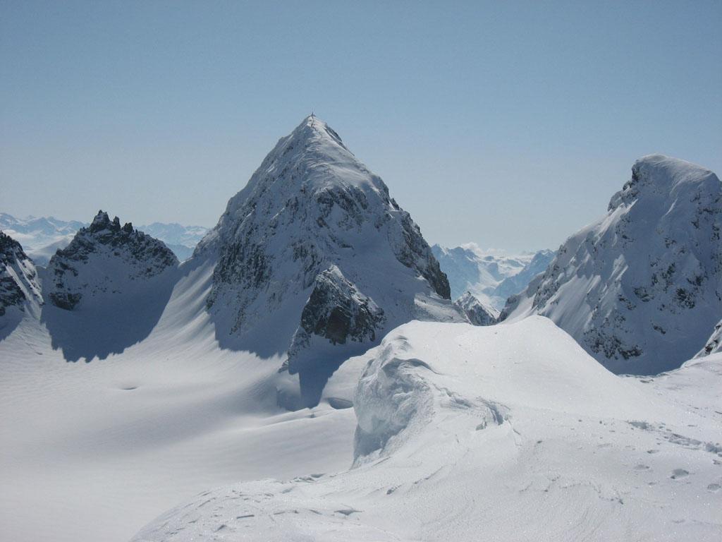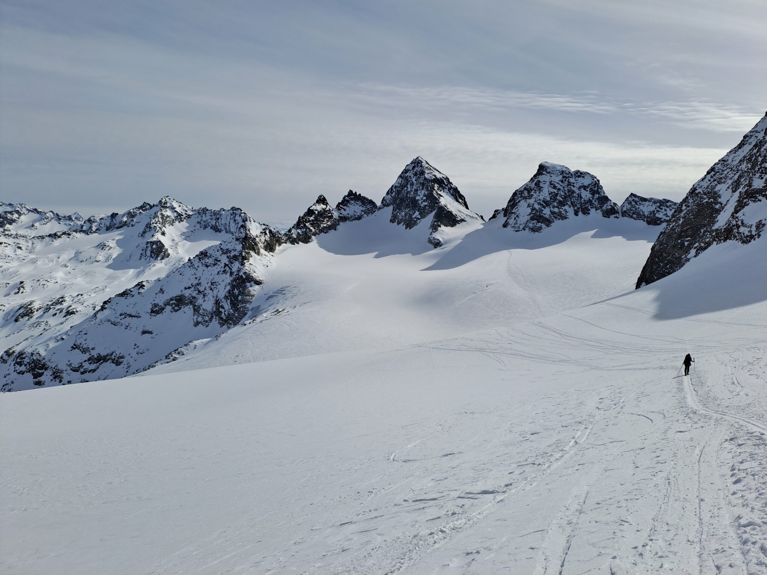 4° giorno: classica salita al Piz Buin 3312 m effettuando un semicerchio nella conca glaciale passando nei pressi del risalto roccioso Grune Kuppe 2579 m, attraversare in piano a destra la lingua del ghiacciaio Ochsentaler Gletscher e superare il risalto a lato della seraccata, portarsi quasi al centro dell’ampio pianoro glaciale e puntare alla sella Buinluke 3054 m, lasciare gli sci e con piccozza e ramponi salire al Piz Buin. In discesa seguire l’itinerario di salita fino al pendio a lato ed alla base della seraccata, quindi anzichè effettuare l’ampio traverso in semicerchio, scendere direttamente l’avvallamento fino a quota 2.300 e risalire con le pelli al rifugio.