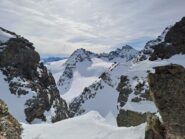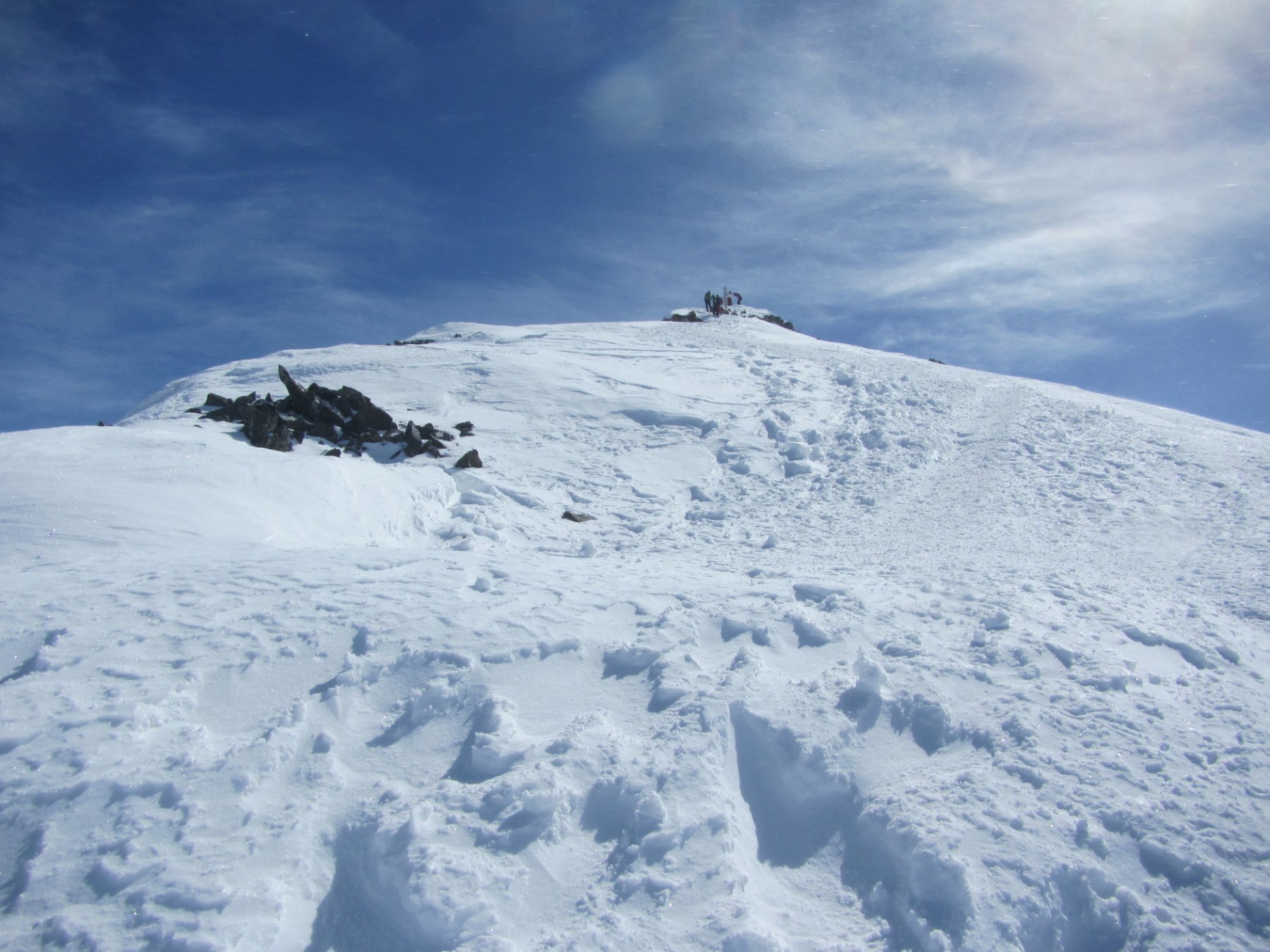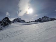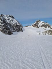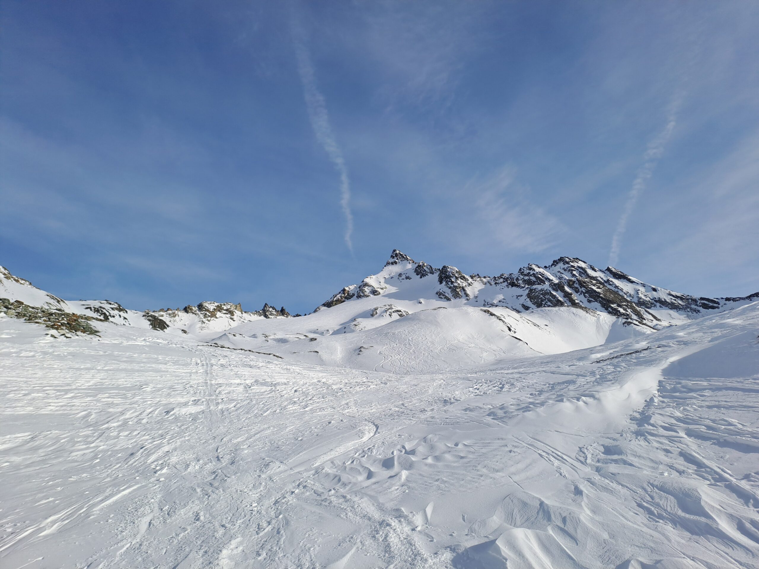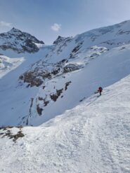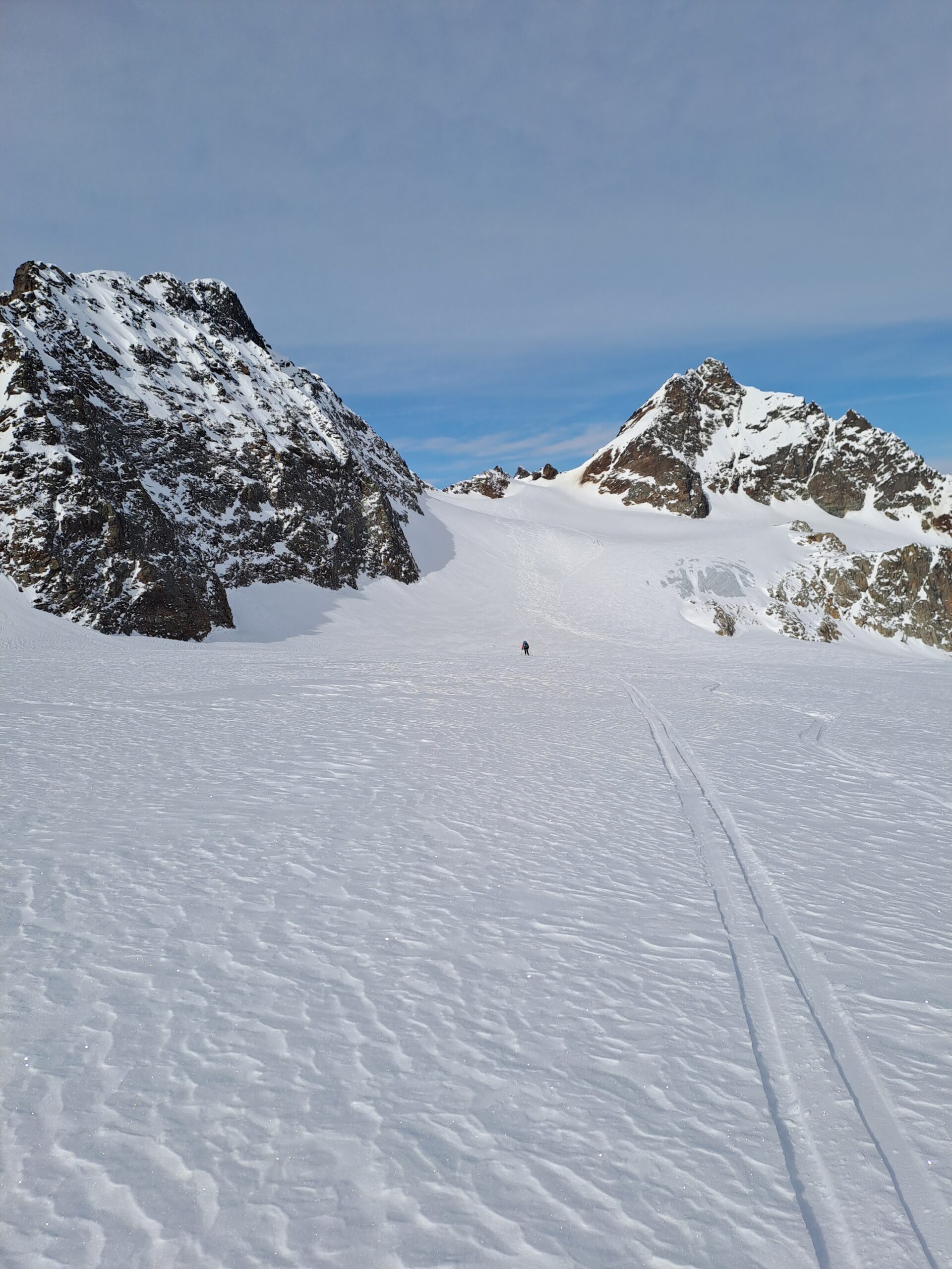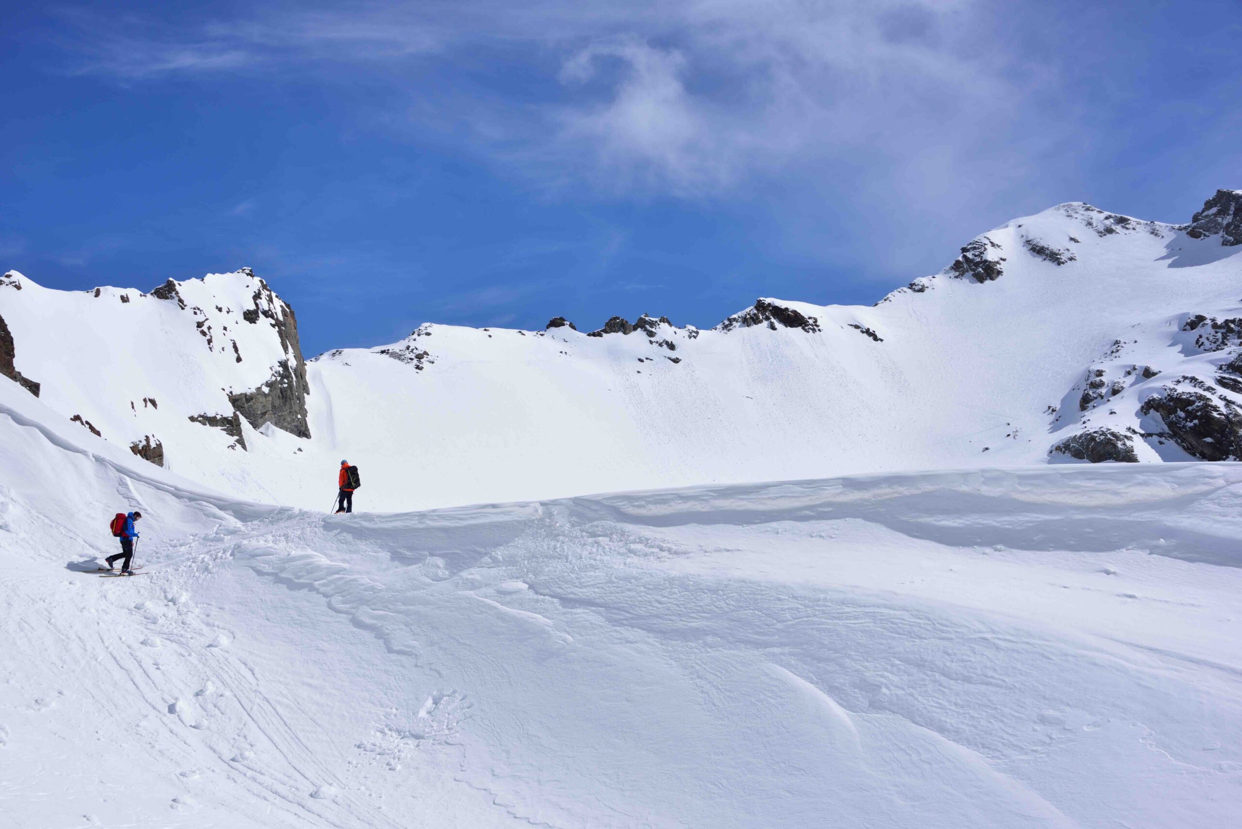 4° giorno: classica salita al Piz Buin 3312 m effettuando un semicerchio nella conca glaciale passando nei pressi del risalto roccioso Grune Kuppe 2579 m, attraversare in piano a destra la lingua del ghiacciaio Ochsentaler Gletscher e superare il risalto a lato della seraccata, portarsi quasi al centro dell’ampio pianoro glaciale e puntare alla sella Buinluke 3054 m, lasciare gli sci e con piccozza e ramponi salire al Piz Buin. In discesa seguire l’itinerario di salita fino al pendio a lato ed alla base della seraccata, quindi anzichè effettuare l’ampio traverso in semicerchio, scendere direttamente l’avvallamento fino a quota 2.300 e risalire con le pelli al rifugio.