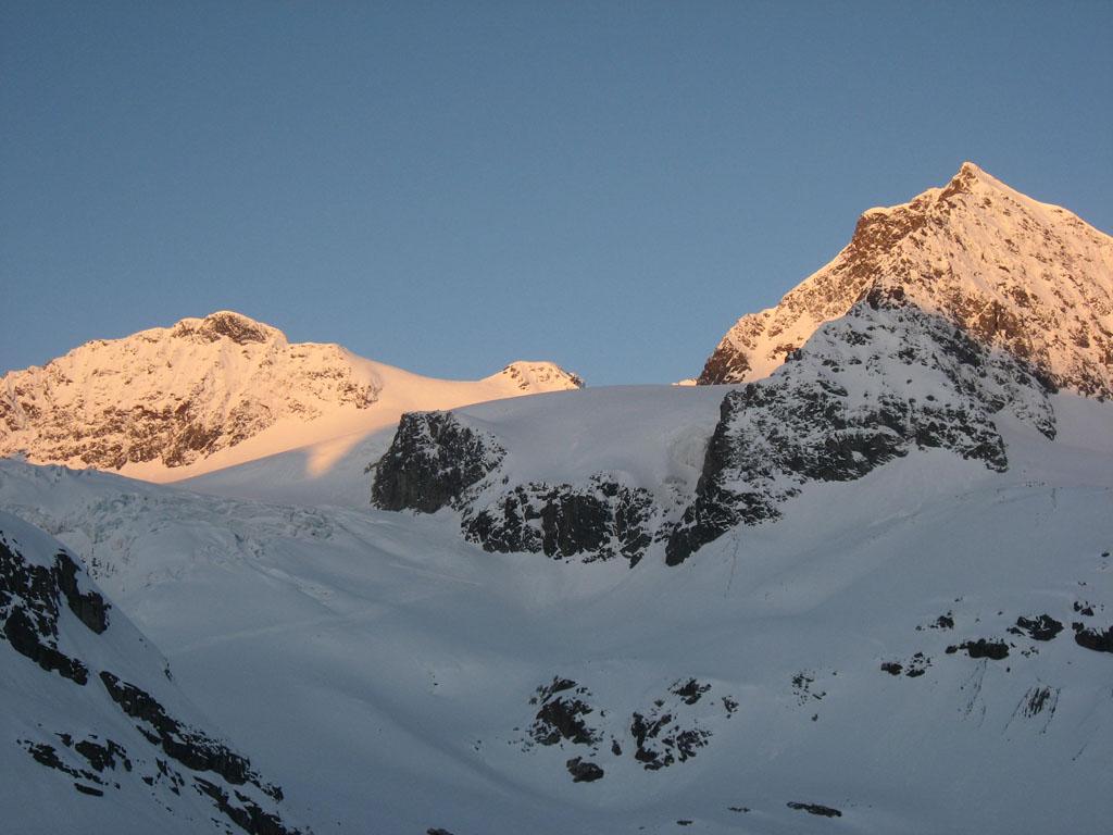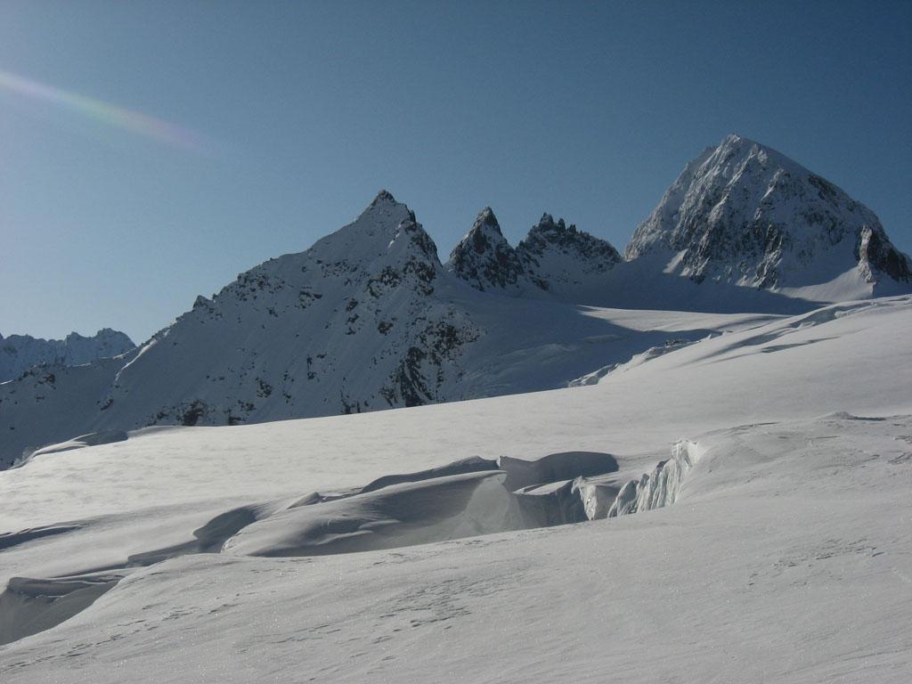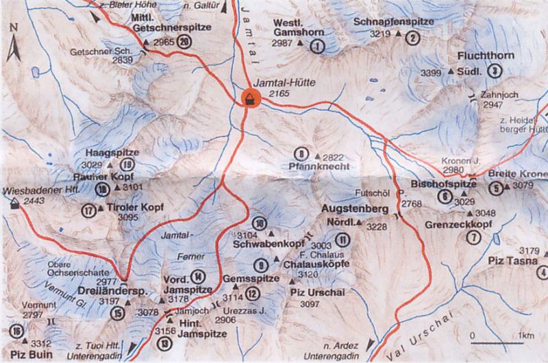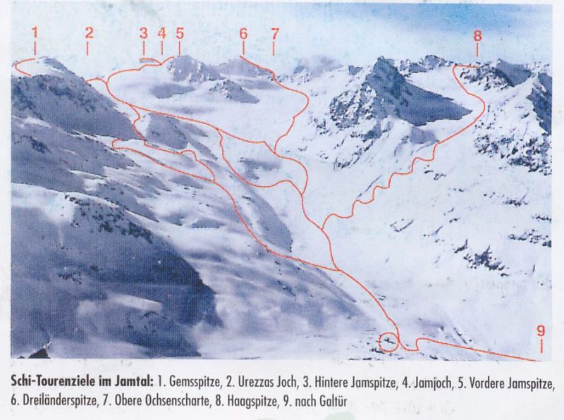 3° giorno: salita sul ghiacciaio Jamtalferner sinistra orografica, passaggio al colle Ochsencharte 2977 m e salita al Dreilander Spitz 3197 m; ultimi 70 metri senza sci ma con ramponi e piccozza. Alternativa più lunga: dal rifugio salire il ghiacciaio Jamtalferner sulla destra orografica, prima del colle Urezzaz Joch 2906 m svoltare a destra, salire un ampio dosso e raggiungere la sella Jamjoch 3078 m tra i due Jam Spitsz (Hintere e Verder), raggiungere una o entrambe le cime, attraversare il breve versante sud ovest (ripido, esposto) del Verder Jam Spitz e raggiungere una forcella, scenderla a nord (primi 20 metri a volte con i ramponi) attraversare il ghiacciaio sottocresta (crepacci) fino al colle Ochschensharte e salire al Dreilander Spitz.