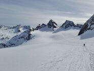 Discesa sul lato destro del ghiacciaio Vermuntgletscher, quindi in leggero traverso fino al rifugio Wiesbadener m. 2443 m.