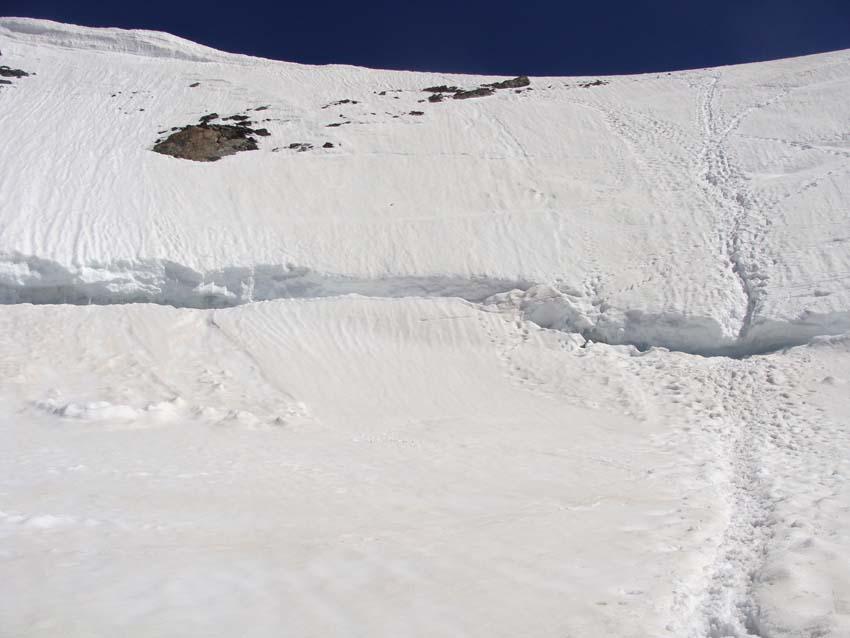 Partito da Plateau Rosa alle 8.15. Neve rigelata. Dato che l’occitentale l’ho già fatto altre volte oggi ho preso la traccia bassa diretta al Centrale ( era meglio farla in traversata dall’occidentale). La mia intenzione era di lascire gli sci quando i pendii diventavano più ripidi e proseguire con i ramponi. Arrivato a quota 4040 prima di uscire in cresta, c’è un crepaccio abbastanza largo e profondo. La traccia più marcata era inerrotta da un salto tra i due bordi del crepaccio ( non avevo attrezzatura per passarlo in sicurezza). Ho provato a passare su delle vecchie tracce e su un ponte di neve che non avrebbe tenuto, il bastoncino andava tutto dentro. Dato il caldo, la neve era già cotta, le nuvole stavano arrivando velocemente, sono tornato indietro. Bella sciata fino al plateau ormai nelle nuvole e nebbia quindi ho evitato di scendere per il ventina che è chiuso ma c’è ancora continuità fino a cime bianche con un tratto di 50 m senza neve vicino agli impianti. Oggi molti alpinisti non italiani ed uno skialp che è riuscito a salire con i ramponi e scendere con gli sci.