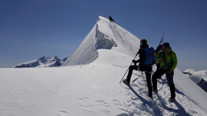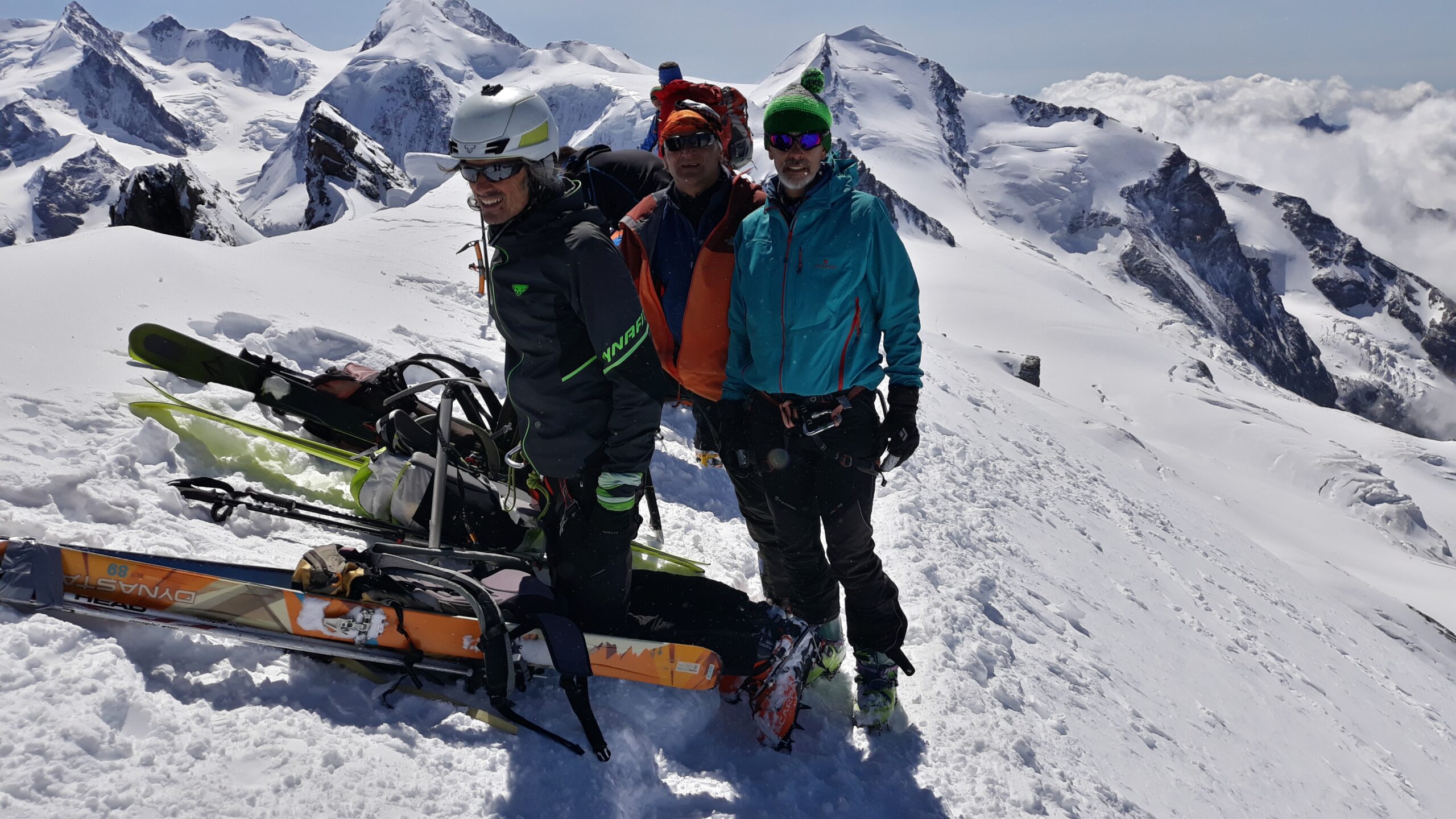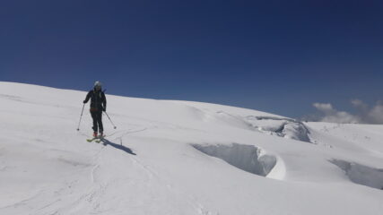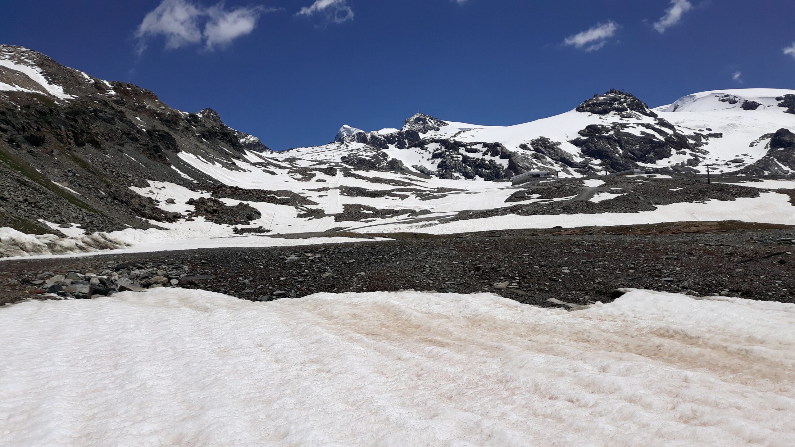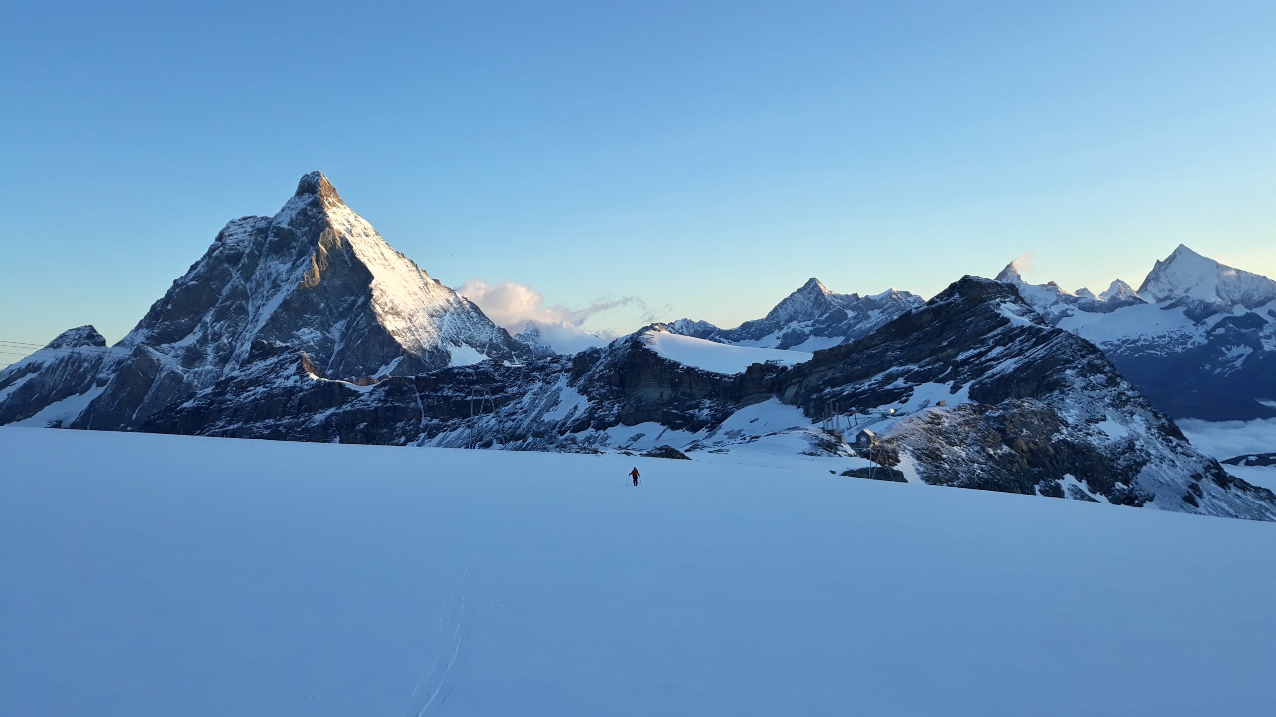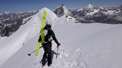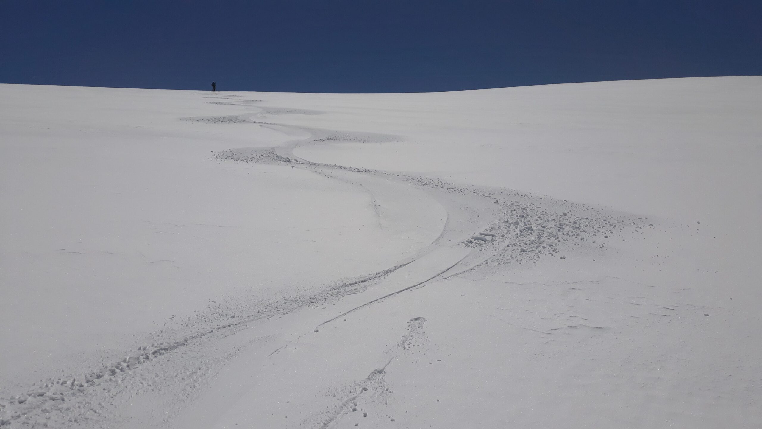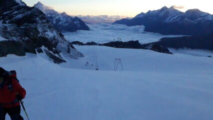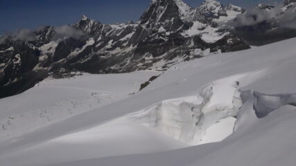 Splendido, peccato che la parete sud-ovest, nostro obiettivo, e’ troppo carica. 35 cm di neve fresca con crosta sopra, no buono. Allora discesa sulla spalla tra i 2 Breithorn, fondo duro con 2 dita di farina caduti nella notte. Spettacolare in una giornata che sembrava piu’ di fine primavera che estate. Ulteriore splendida chicca la discesa sul Teodulo e poi sulla pista Bontadini, su un firn da urlo sulla pista… con ancora le striscie dell’ultimo passaggio dei gatti; togliendo 2 volte gli sci per pochi metri… fino a 2700 circa. 20 minuti a piedi per arrivare a Plan Maison. Tanta gente in alto… nessuno sotto!