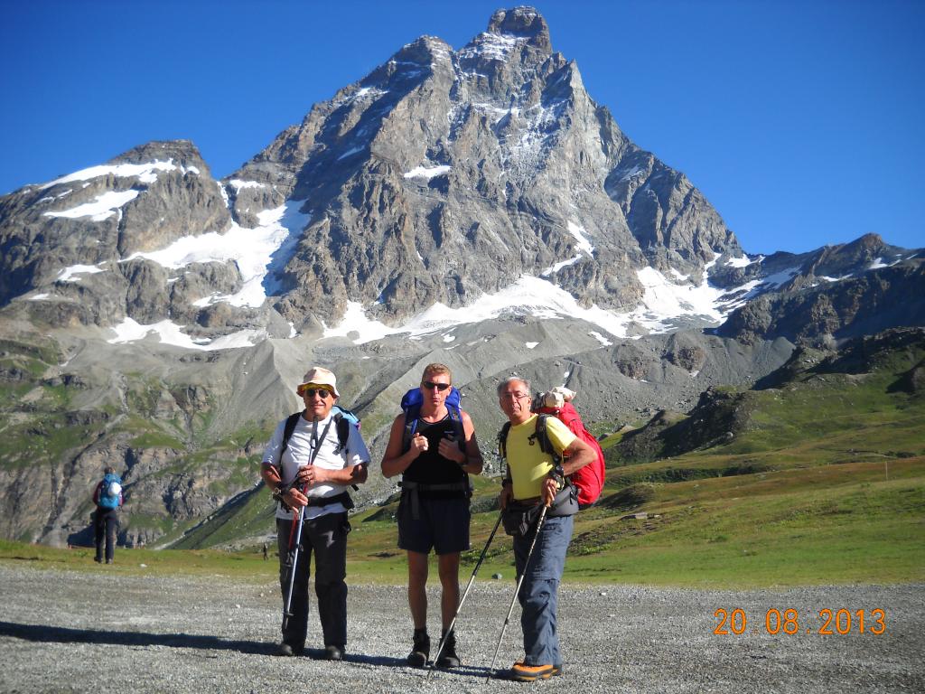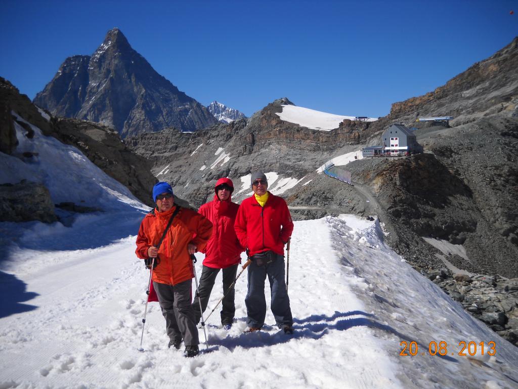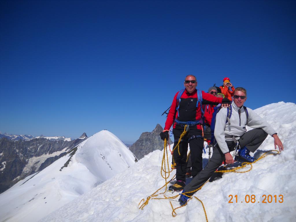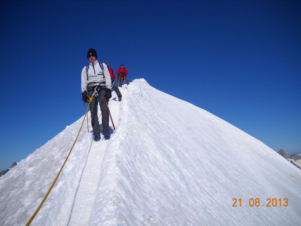saliti da plan maison 2447mt. fino al rif.Teodulo 3317mt pernottato. partiti alle ore sette zero gradi ottimo rigelo notturno saliti prima sul Breithorn occidentale poi la bella crestina a scendere per poi risalire al Breithorn centrale 4160mt. la cornice molto importante con una bella crepa in vetta, ridiscesi alla sella dei due Breithorn poi giu fino a Cervinia..