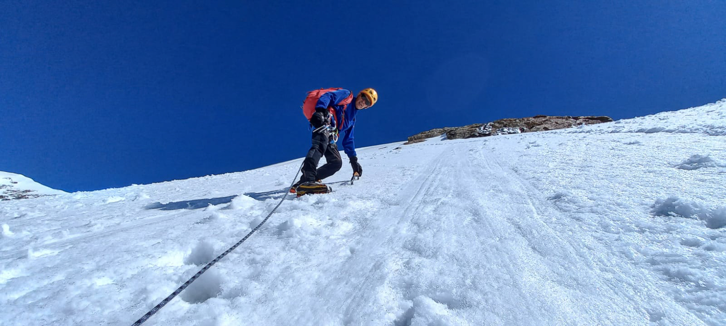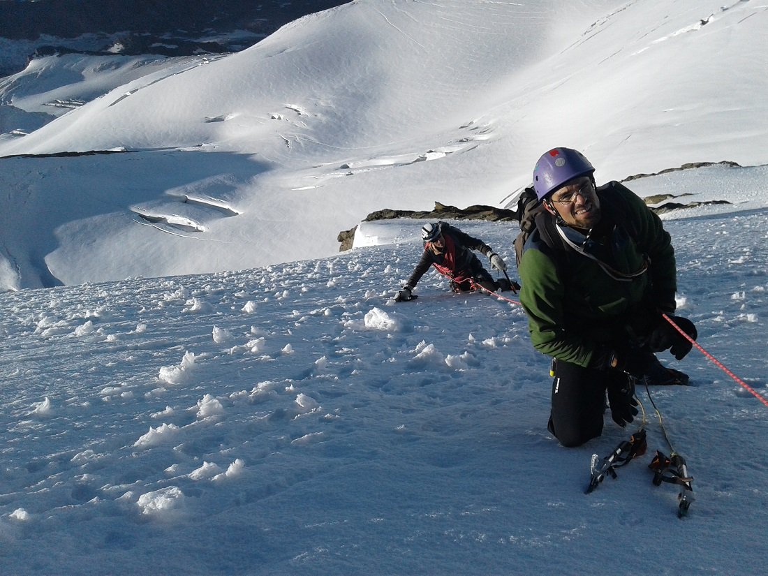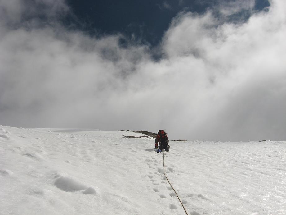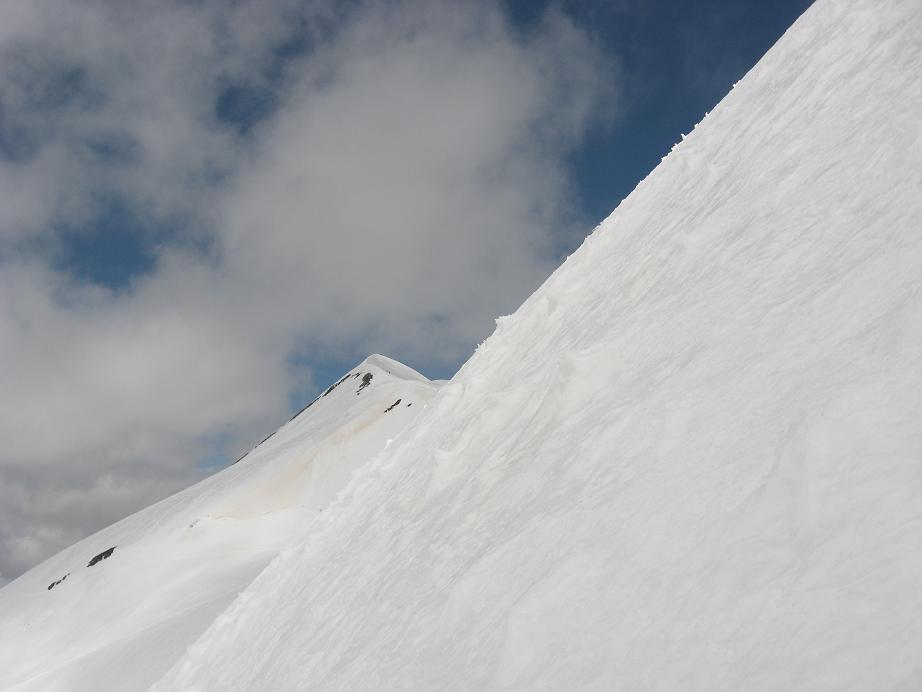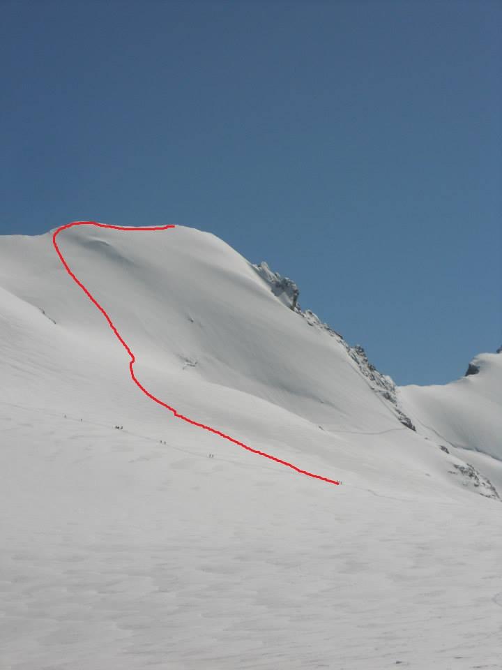 Da qui inizia la via, si risale il pendio sui 45/50° in conserva a sx dello sperone, a seconda delle condizioni dell’innevamento, se si dovesse presentare particolarmente ghiacciata è bene avere con se delle viti da ghiaccio, la parte centrale è più ripida (50°), passati questi cento metri più ripidi, la via porta su un ultimo pendio un po’ più adagiato che porta direttamente in vetta o sulla cresta a poco distanza da essa.
