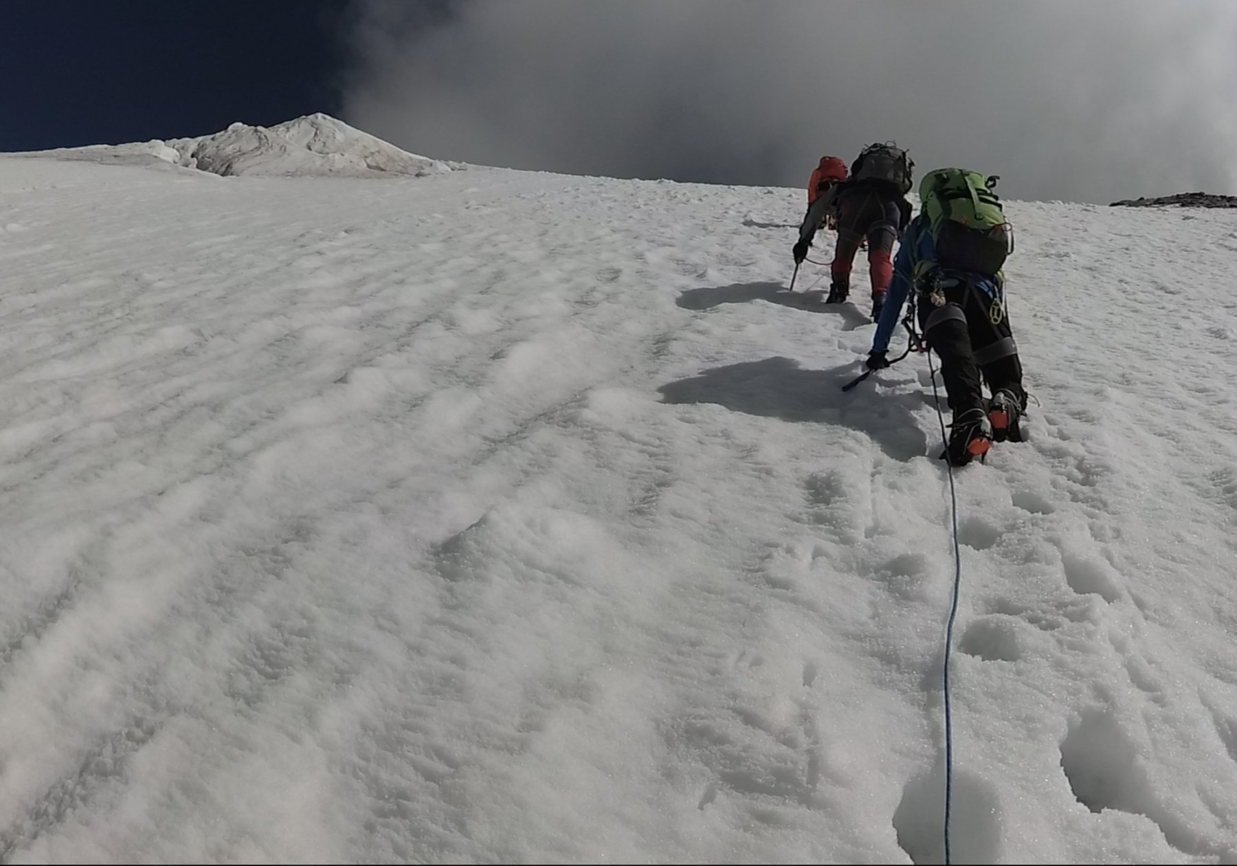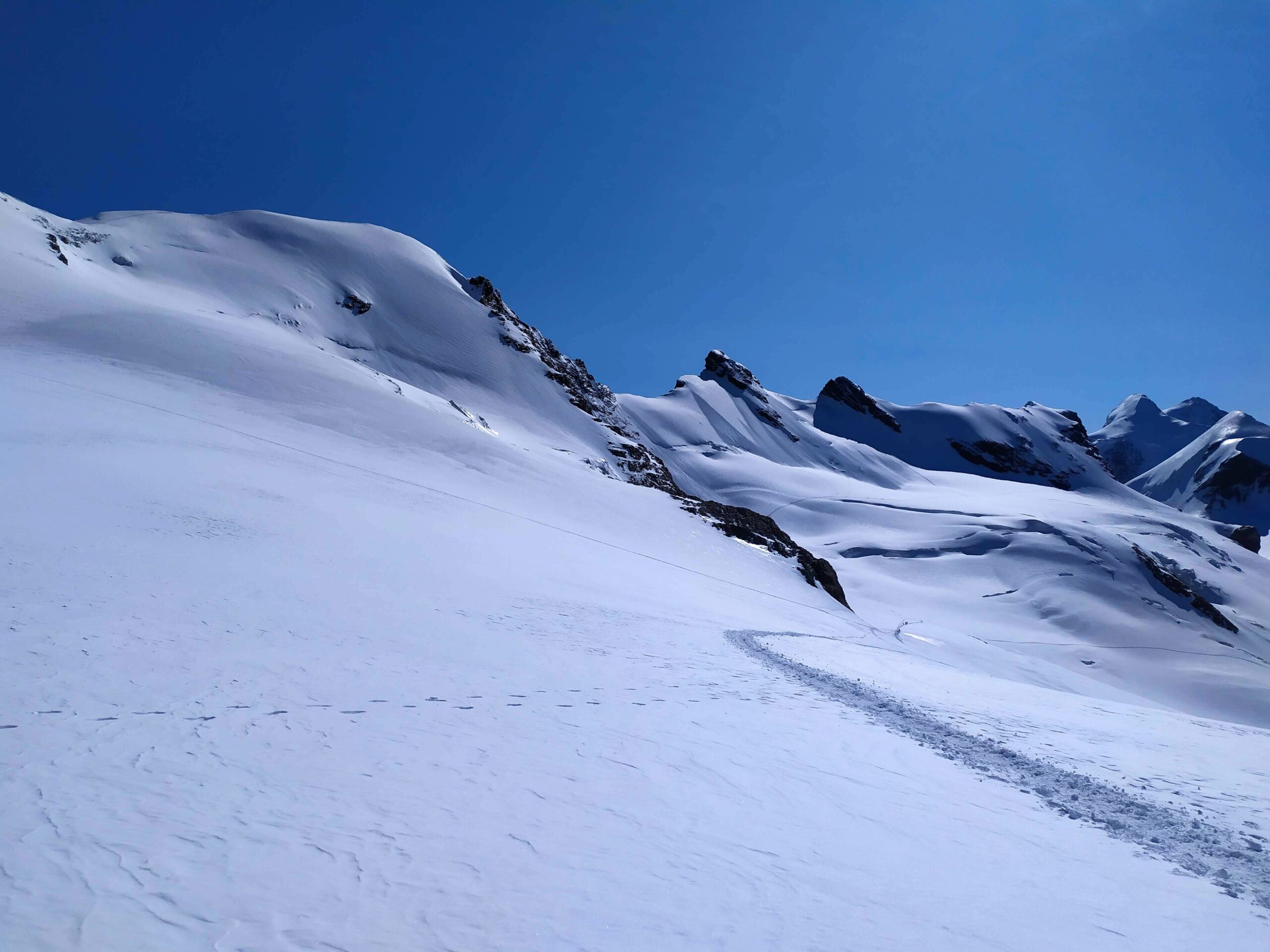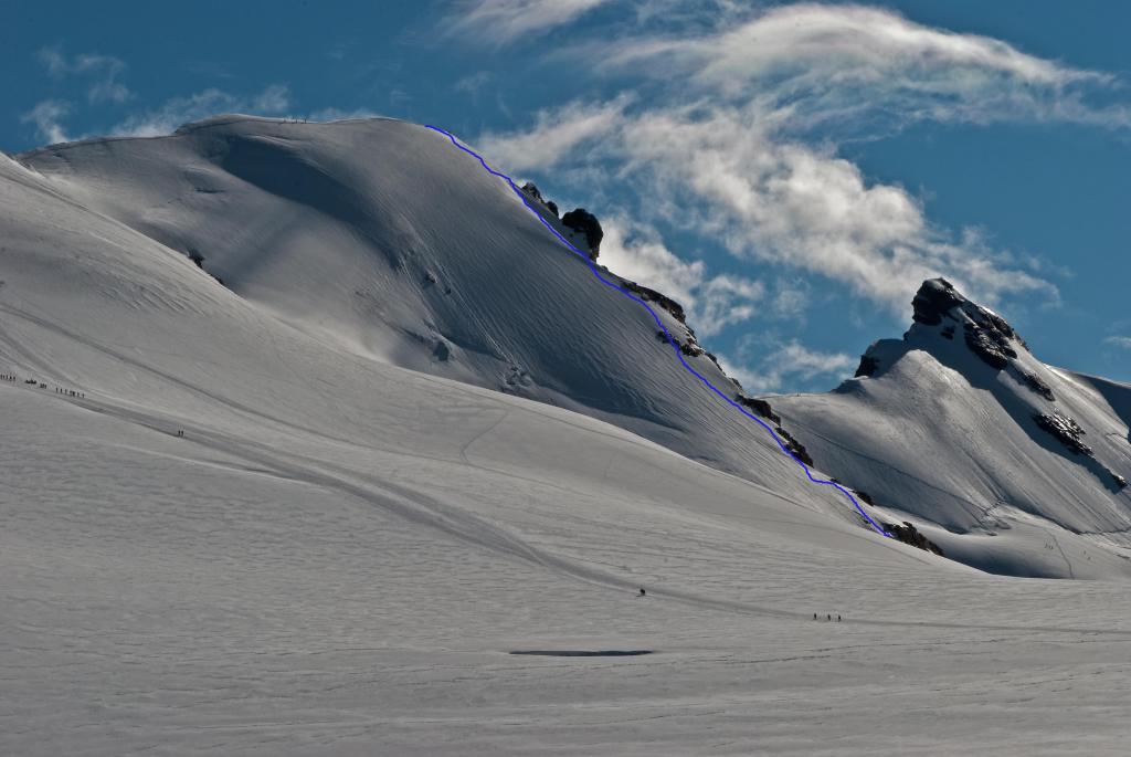 Da qui inizia la via, si risale il pendio sui 45/50° in conserva a sx dello sperone, a seconda delle condizioni dell’innevamento, se si dovesse presentare particolarmente ghiacciata è bene avere con se delle viti da ghiaccio, la parte centrale è più ripida (50°), passati questi cento metri più ripidi, la via porta su un ultimo pendio un po’ più adagiato che porta direttamente in vetta o sulla cresta a poco distanza da essa.