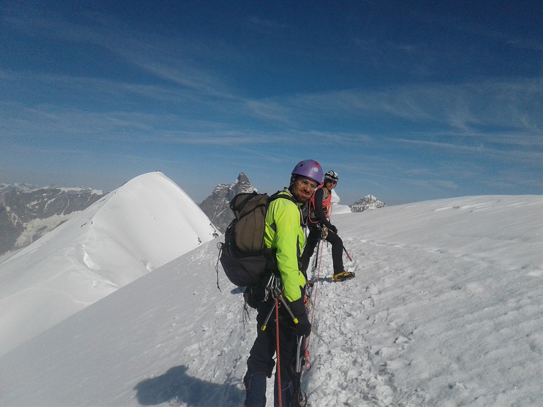 Gran bella via, oggi condizioni super, ottimo rigelo, zero vento, meteo spettacolare. La terminale si sta aprendo ma con attenzione si passa ancora abbastanza bene. Noi l’abbiamo superata leggermente sulla destra, dove è più stretta. Panorama mozzafiato su tutti i 4000, da quelli svizzeri a quelli del gruppo del Rosa. Oggi solo noi sulla KM, poi continuato in traversata verso l’affollatissimo Breithorn Occidentale, ma che offre una visuale di prim’ordine sul padrone di casa: sua maestà il Cervino. Con l’ottima compagnia di R66 e Stefano!