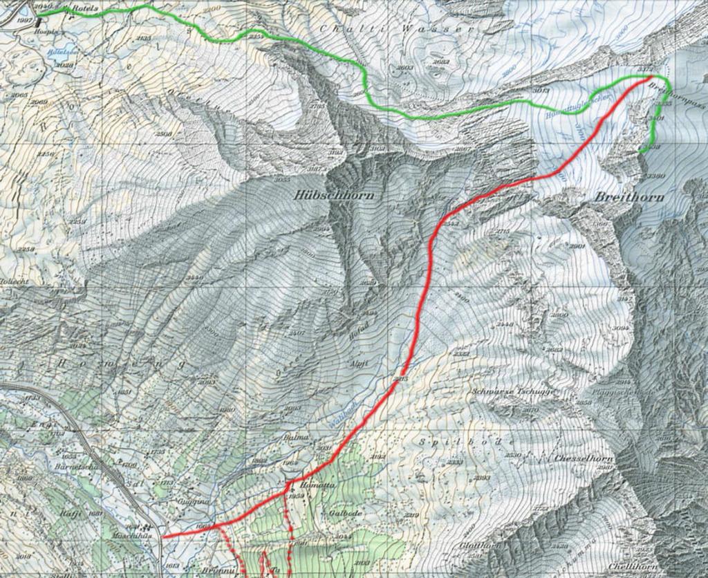 Salire in direzione Nord-Est tenendosi sulla sn orografica della valle fino a raggiungere un ampio pianoro. Proseguire nella stessa direzione puntando a un evidente masso sul fondo del vallone. Superare il ripido pendio sulla sn (per chi sale) sotto le pareti dell’ Hubschhorn e raggiungere lo scivolo sopra la fascia rocciosa che con pendenza sostenuta conduce all’ Homattupass.