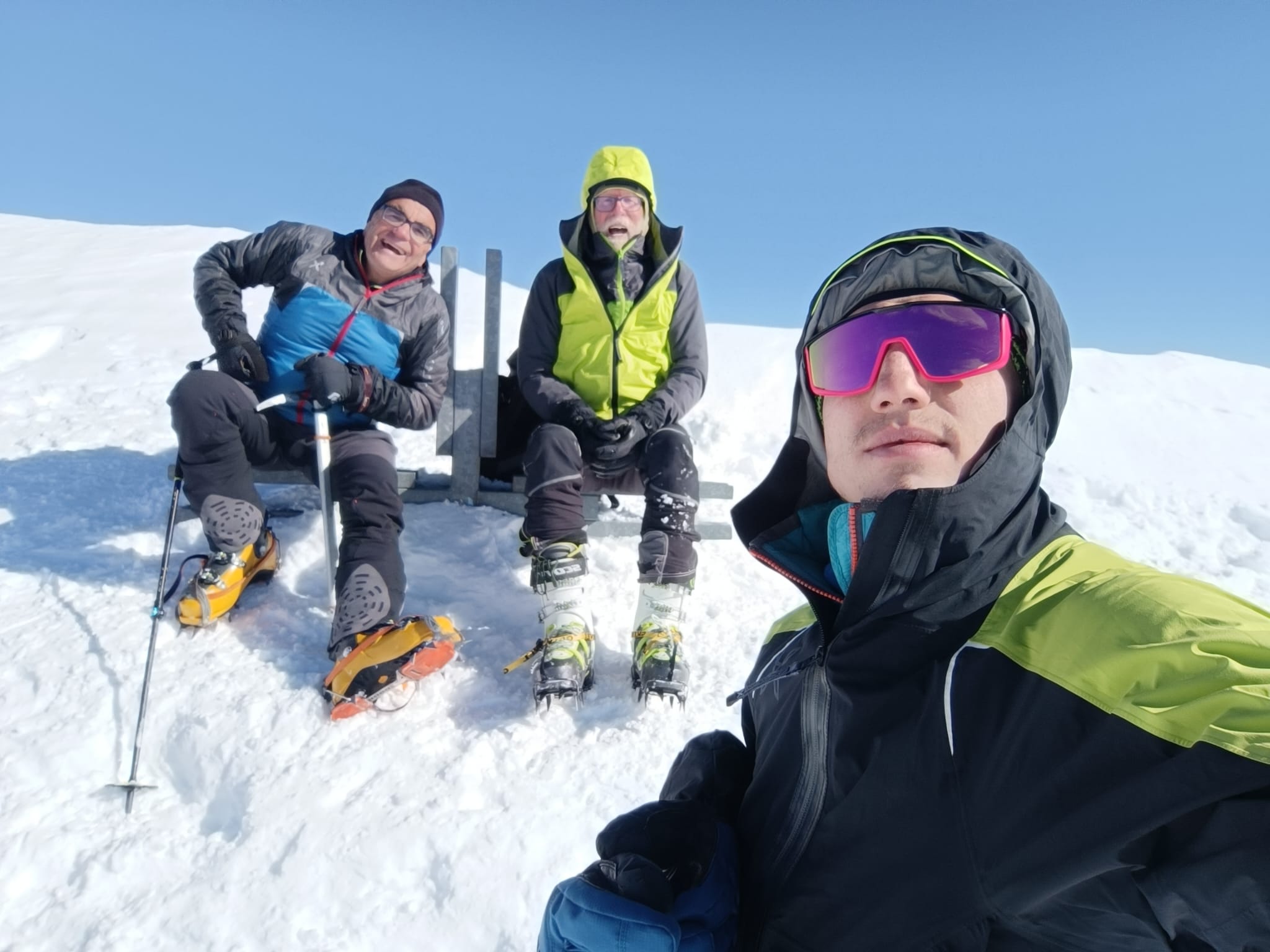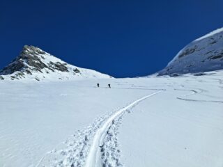 Non c’è molta neve, ma si fan una bella sciata. Solo un po’ di attenzione a qualche sasso nella parte finale al ritorno. Tracciata bene stamattina dai primi, abbiamo messo i coltelli al traverso, tolti giunti al sole a quota 2.700, rimessi per uscire dal colle e poi fino in cima. Sci lasciati sotto e poi gli ultimi 20 metri per la cima con picozza e ramponi. Dal colle in su neve molto dura con una spruzzata di fresca; da 2.500 bella neve fresca, 20/30 cm. Complessivamente una bella sciata in un ambiente fantastico, come al solito. Una ventina di persone in giro oggi. Con Roby e Jack.
