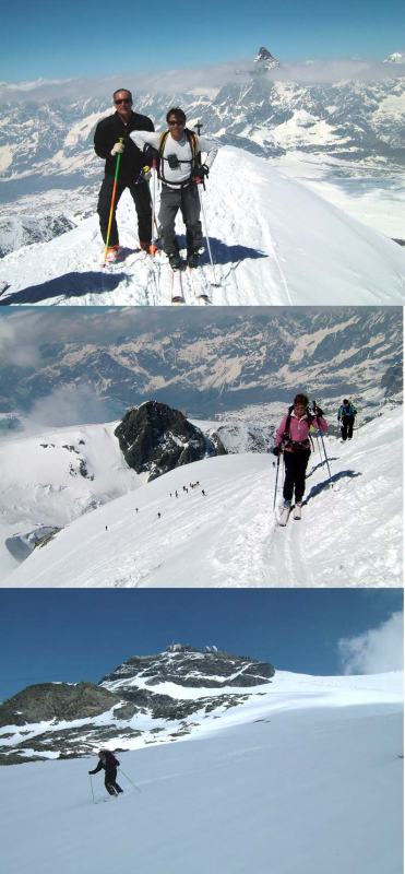 Giornata bella senza vento, in alto una spanna di neve recente farinosa che si è mantenuta tale fino a quota 3000, infatti abbiamo fatto un fuoripista tagliando appena sotto il pendio ripido del ventina per poi ricollegarci di nuovo alle piste. Sotto i 2900 m la neve è passata a firn e poi via via più marcia ma scabile fino a Cervinia. Domani c’è il trofeo mezzalama ed oggi c’erano tanti che provavano il percorso. un terzetto di Cervinia mi han detto che hanno impiegato da cervinia al colle del Breithorn h 1.50 (auguri).