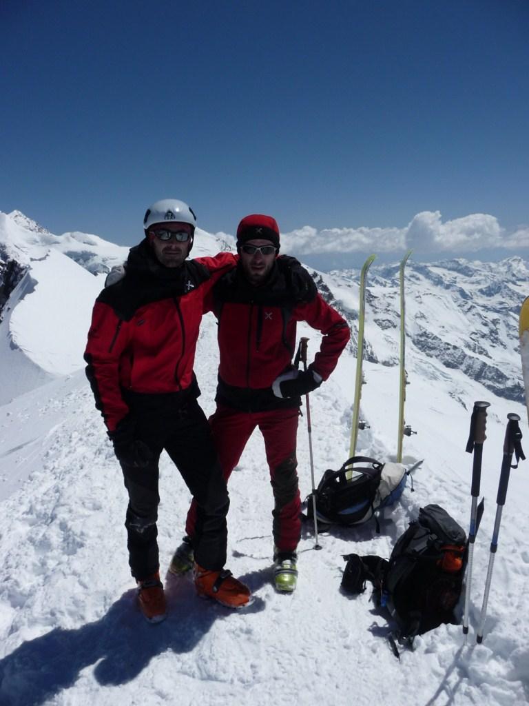 Rampant, ramponi e picozza utili solo a fare peso nello zaino. In tutto circa una 40ina di persone sul Breithorn. Prima parte della discesa (ecco la stella in meno), per circa 150 metri di disl. una crosta non sempre portante. Poi lo sballo! Neve trasformata ma non marcia fino agli ultimi 200 metri dove chiaramente era cotta. Tutte le piste vuote per una serie infinita di curve…peccato le gambe belle stanche per la salita. L’idea iniziale era la cresta verso il centrale e discesa da quest’ultimo ma non c’erano tracce e noi eravamo troppo stanchi.