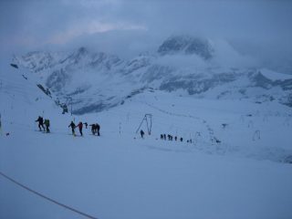 Siamo andati a vedere il Trofeo Mezzalama che era stato rinviato ad oggi, molto freddo e vento appena arrivati a Plateau (con gli impianti), poi salendo ci siamo scaldati un po’ ma il clima non cambiava e al Colle anche un bel pò di nebbia..