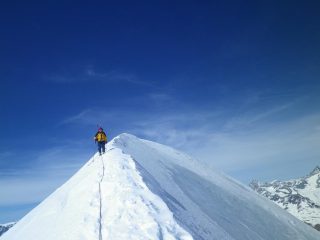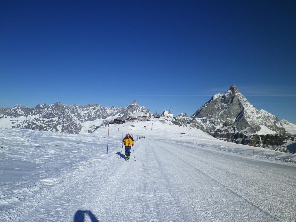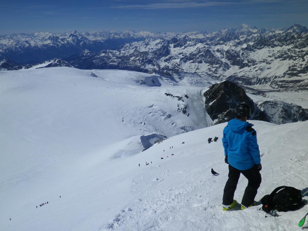 Breithorn occidentale e traversata al Centrale.Partiti da Plateau Rosa,molti sci-alpinisti, soprattutto dal Piccolo Cervino, tempo bellissimo. Nessuno ha fatto come noi la traversata al B.Centrale(due sono tornati indietro), la cresta non aveva traccia battuta, vento forte in cresta. Dal colle al B.Centrale tracce di sci in salita e in discesa. Dal colle a scendere al plateau neve crostosa non portante.