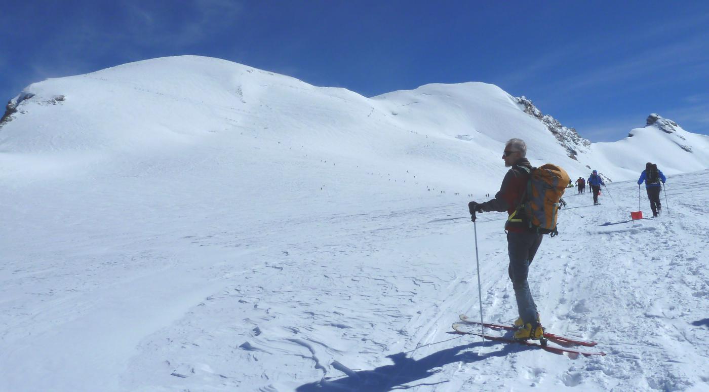 Partiti da cervinia alle 8.00 con funivie gratuite. Alle 9.00 partiti dal plateau con vento impetuoso ma salendo si attenuava. Dopo aver visto passare le prime cinque squadre del trofeo mezzalama siamo saliti al Breithorn ed in punta vento accettabile, tanta gente ancora che saliva. Discesa con circa 20 cm di neve fresca ben sciabile anche se già abbastanza tritata. Al colle abbiamo ancora atteso alcuni altri passaggi della gara e poi giù fino a Cervinia dove sul finale la neve risultava parecchi bagnata con caldo significativo. Una bella occasione per fare un quattromila anche se tanto inflazionato!