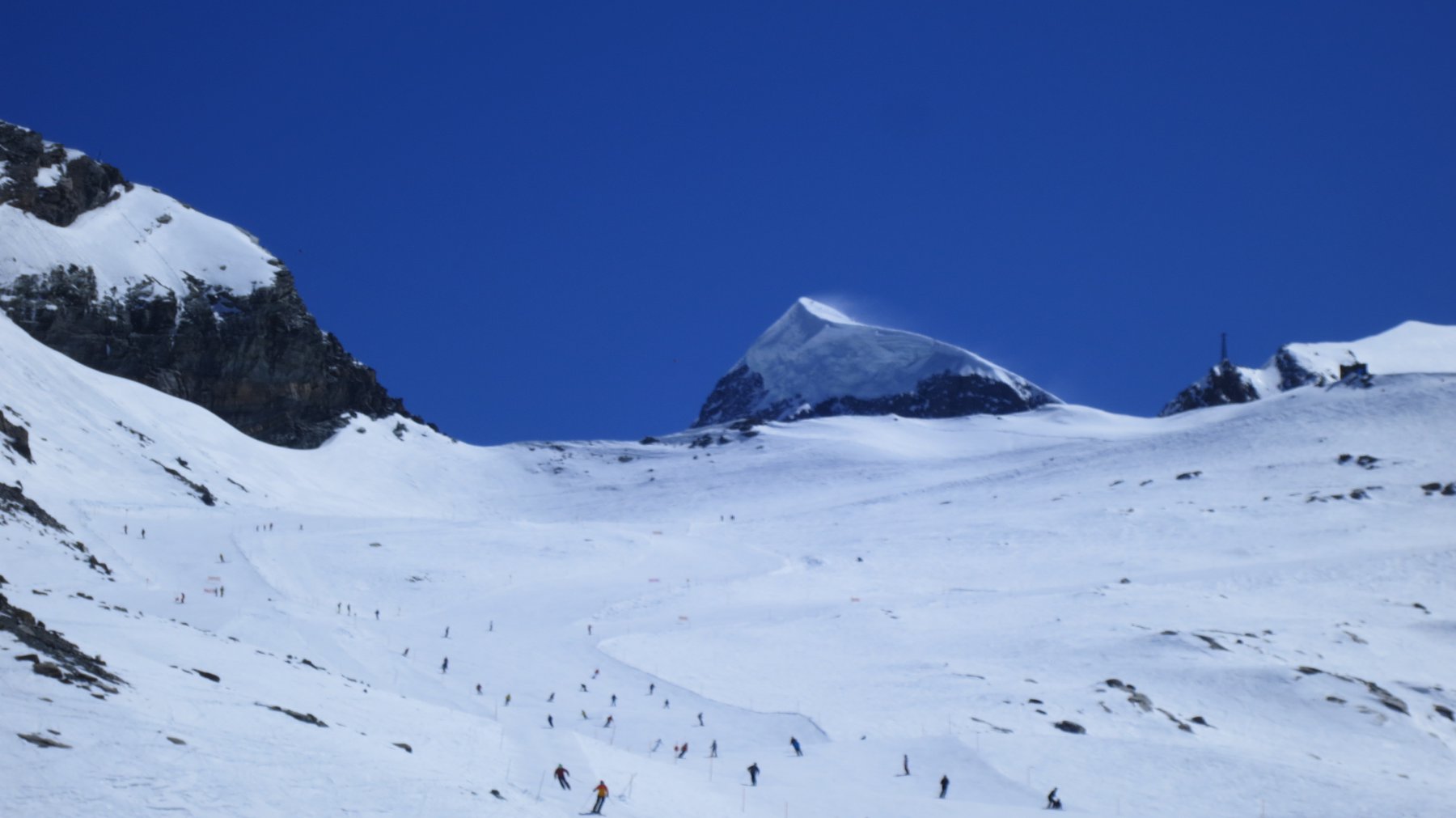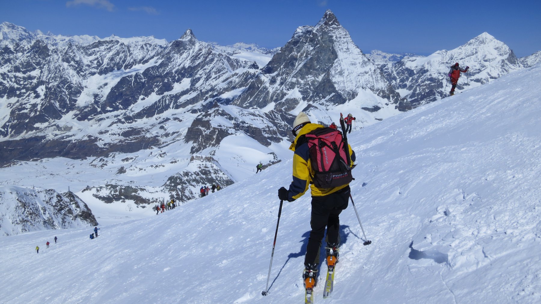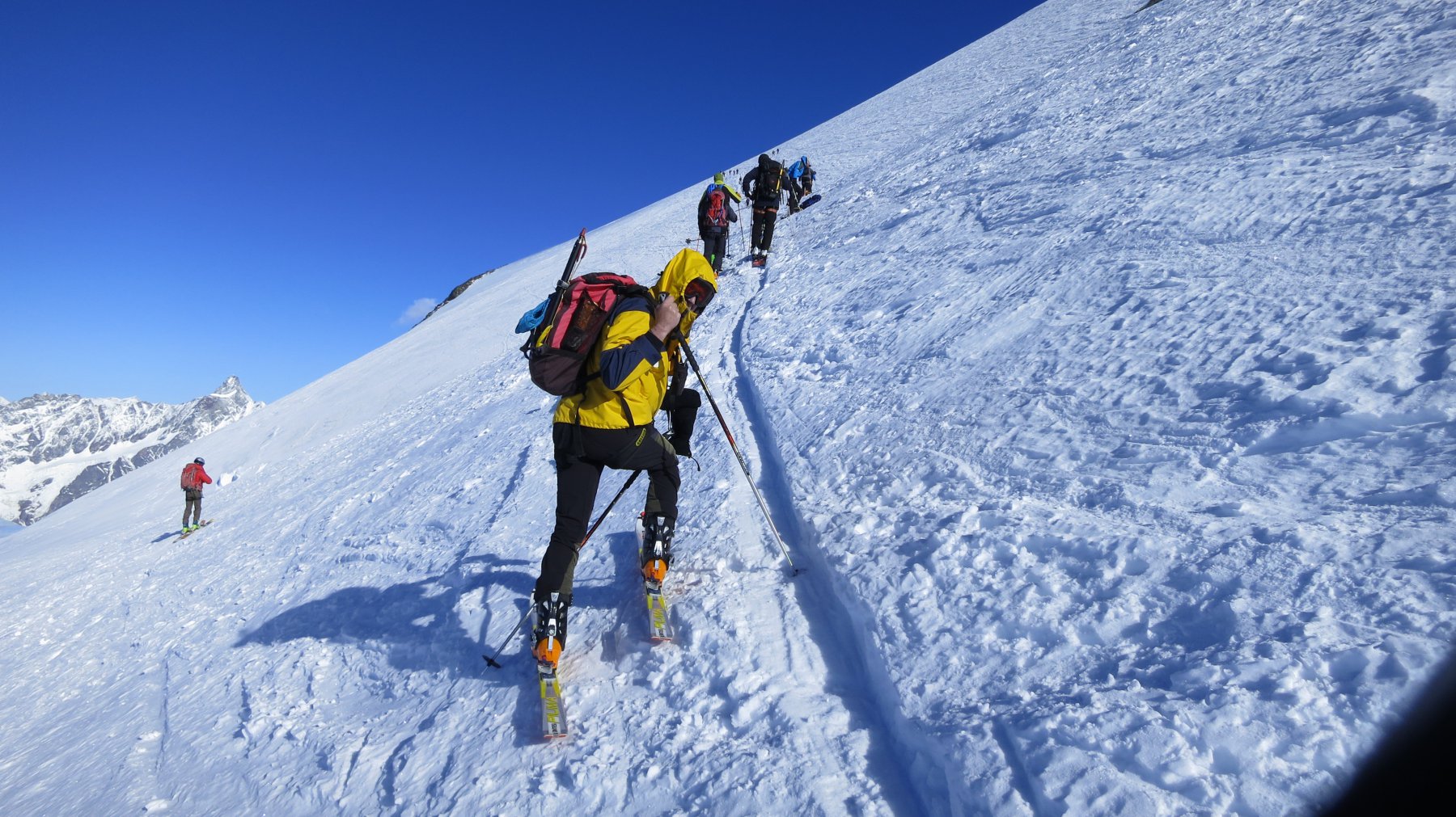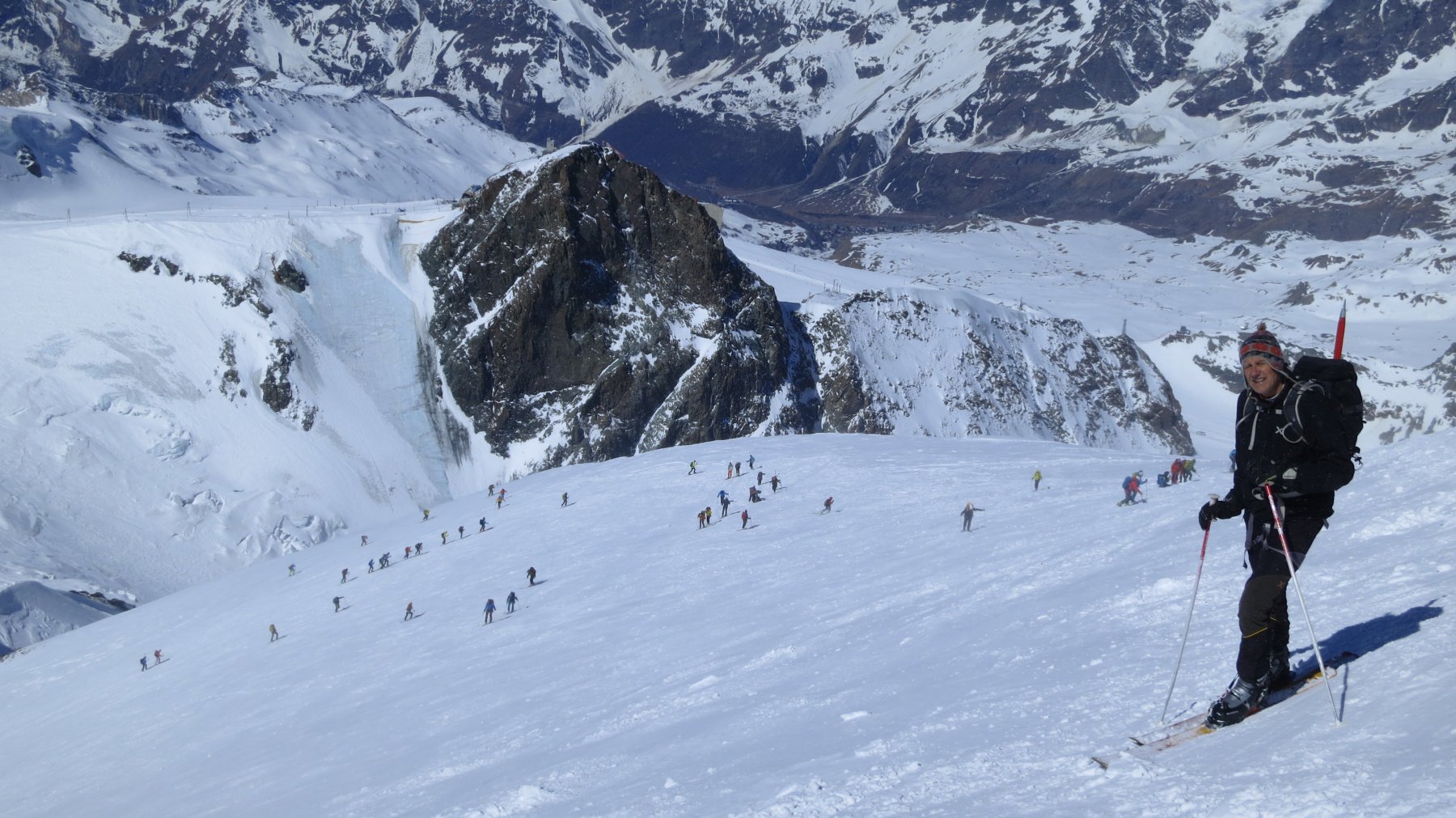 Festa biennale dello skialp a Cervinia. Quest’anno non c’era bisogno come nel 2015 delle previsioni del guru Mercalli per imbroccare al minuto la finestra di bel tempo per la gara: il tempo, già magnifico, è stato cristallizzato da un’ondata di gelo da Nord-est, con vento. Perciò, tutti saliti prima dell’alba al colle del Breithorn a prender freddo e dare tifo ai fortissimi garisti saliti lì da 1h 40′ alle 3h da Cervinia! Poi salita in punta, affollata come non mai. Con big Sergio.