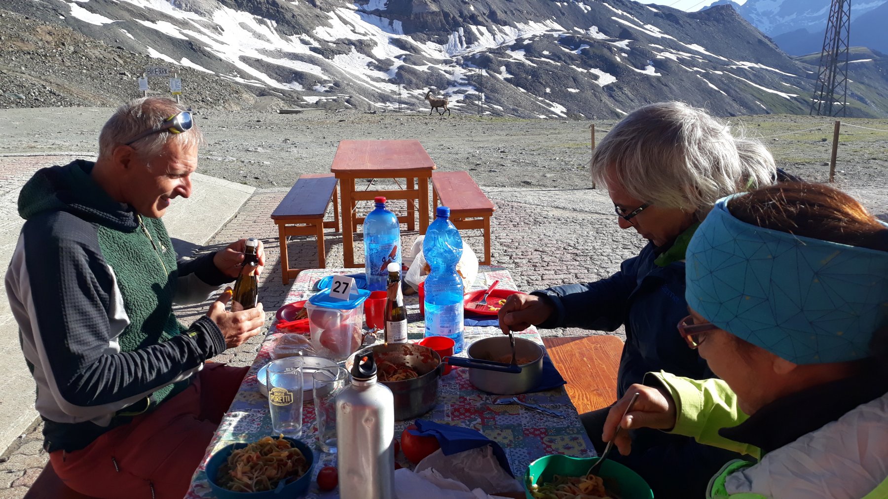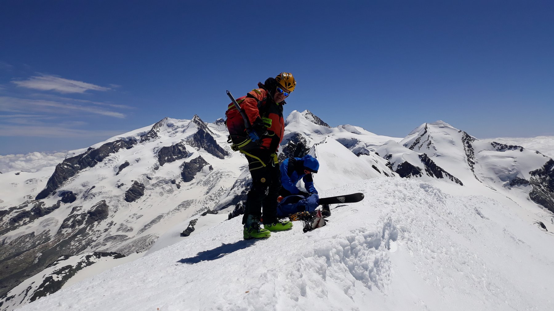 Bivacco in tenda a cime bianche…bellissimo (a parte il cantiere orrendo sul lago). La vetta del Breithorn quest’anno è particolarmente…appuntita! (tutta la neve di giugno). Vento da nord forte in vetta, che ha mantenuto la neve, un po’ dura in alto ma perfetta per tutta la discesa. Discesa sulla gobba di Rollin su velluto; io l’ho fatta tutta, fino a cime bianche (piccolo traverso su sfasciumi senza neve a 3000 circa, al fondo del muro); gli altri, risaliti fino agli impianti e poi per pista.
