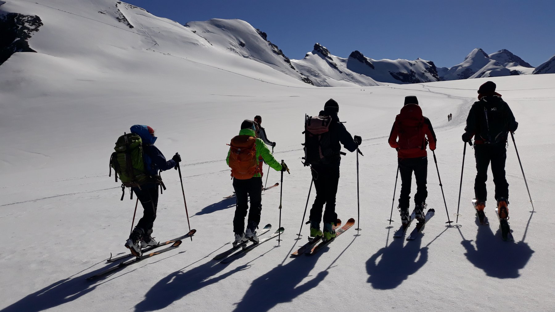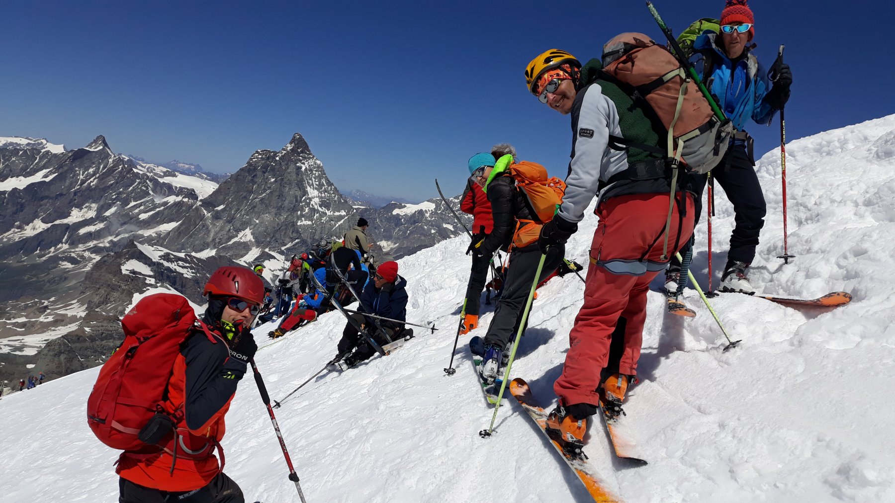 Gruppo top dei liberi, siamo saliti molto lenti…ma è stato un bene, vista la temperatura bassa. Io, Clara, Sergio, Estella, Enzo guru, Claudio, Luca ( l’ha fatto 2 vote) ! Se qualcuno si perde nelle seraccate sotto il Briethorn e trova due Dynastar Cham Alti89 …..mi scriva in privato!!!!! Sono di uno di noi!!!!!! Giornata splendida, con neve anni ’90!!