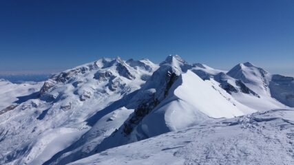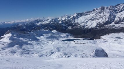 Bella discesa dal Breithorn su neve farinosa con fondo duro a tratti irregulare. Poi su pista con neve perfetta fino a 2700 circa.