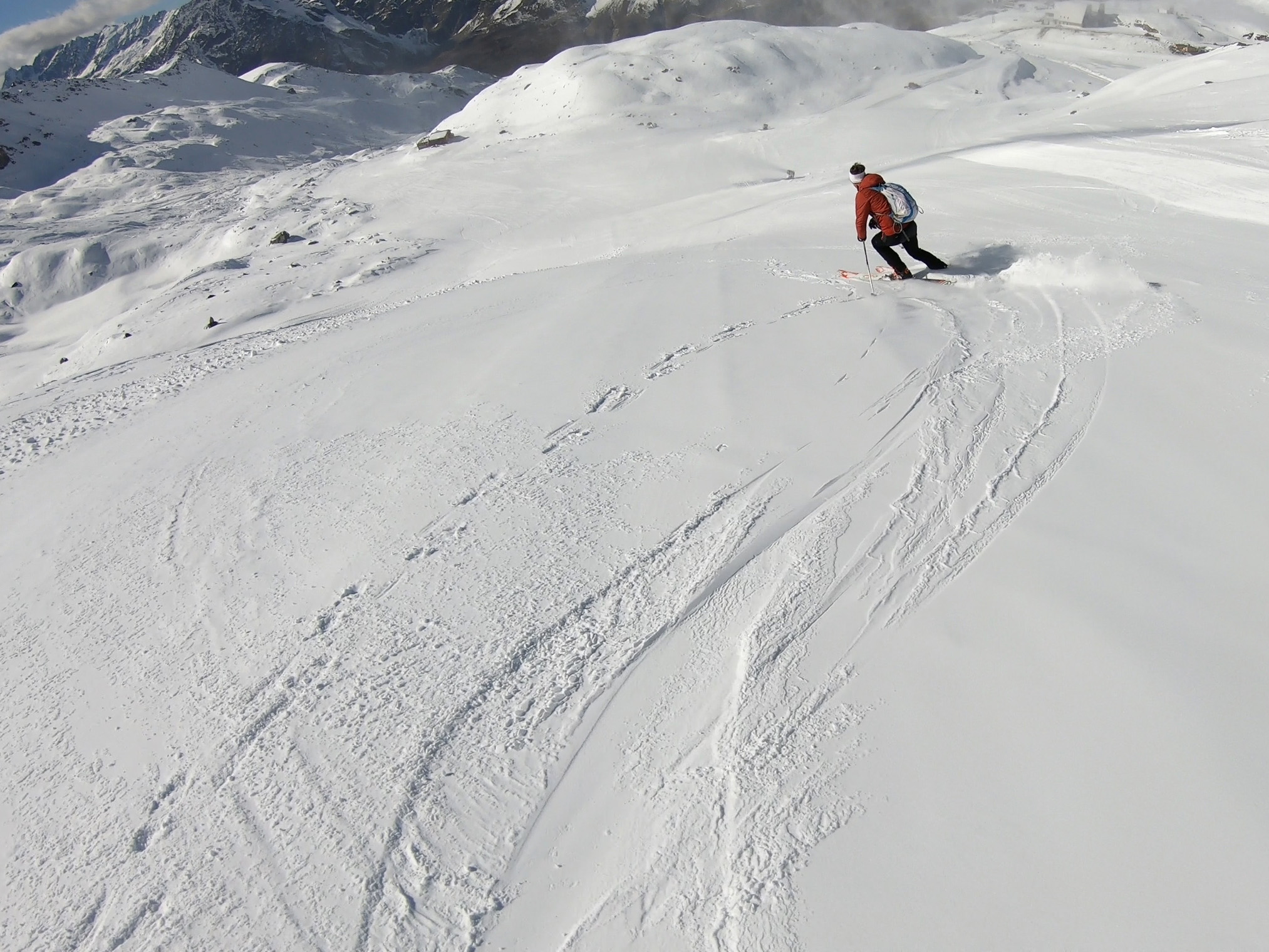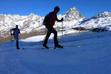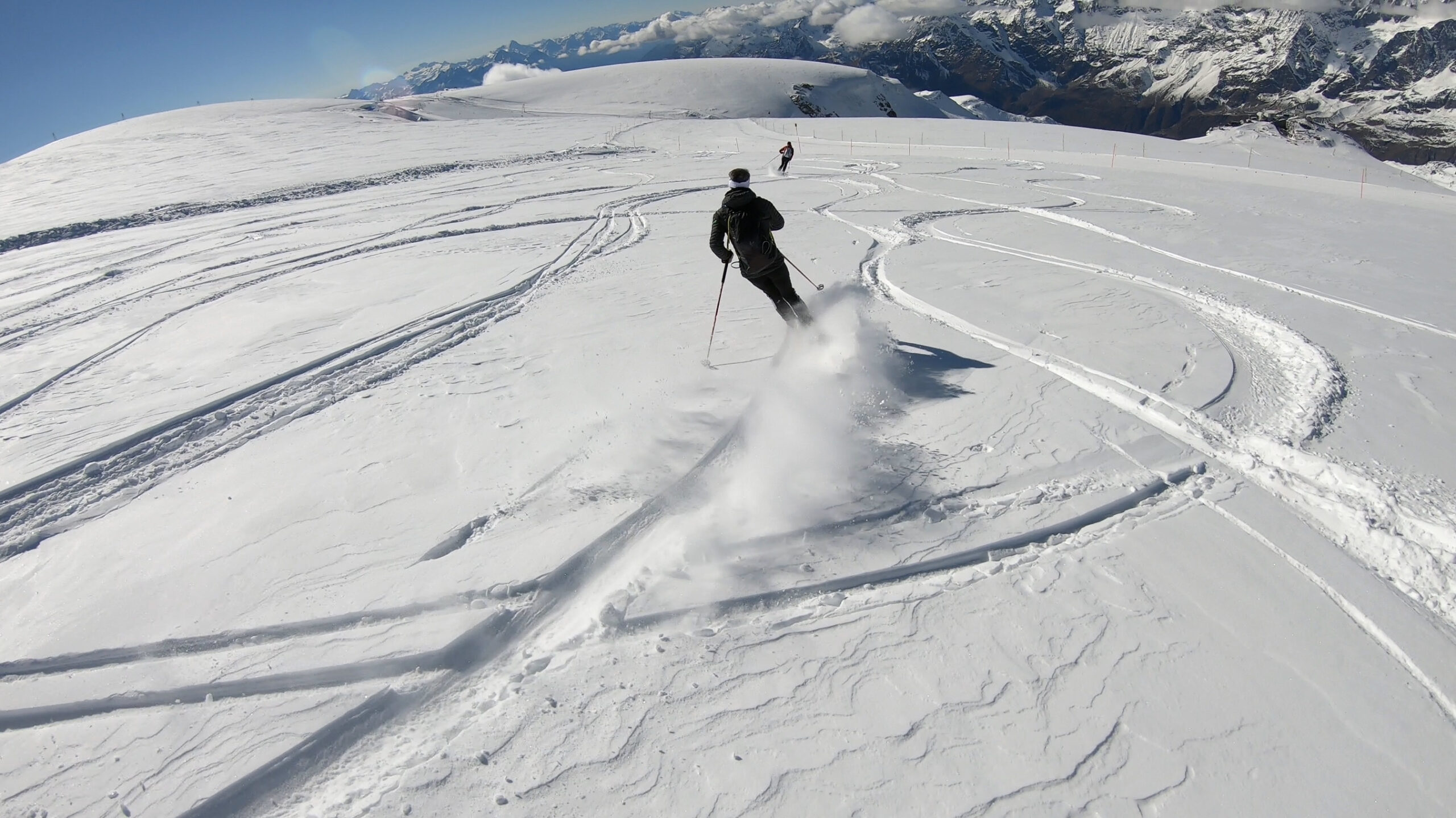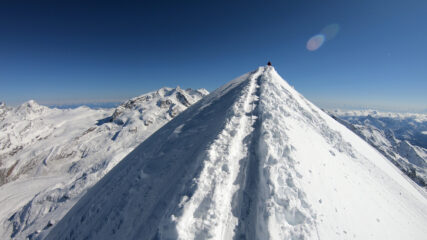 Ottime condizioni, in basso si spallano circa 350m e si mettono gli sci su un manto esiguo ma duro e compatto, parte mediana pista del Ventina che troveremo bella fresata al ritorno, dal colle del Breithorn alla vetta 20cm di farina su fondo duro e traccia presente. Nel pendio finale la traccia era fatta a piedi, ma si sale nella stessa anche sci ai piedi. Sereno senza vento, piuttosto freddo solo nei pressi della vetta.