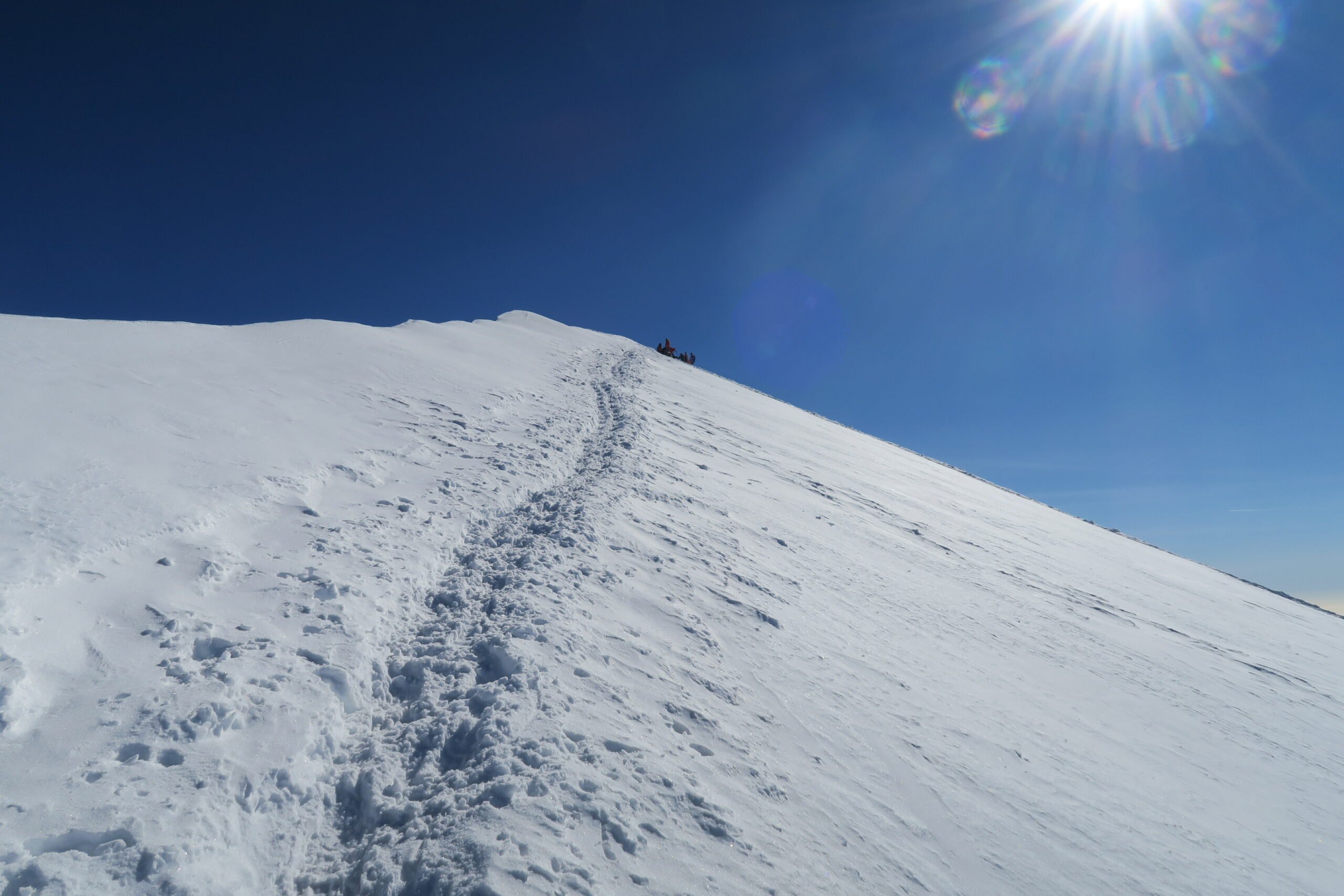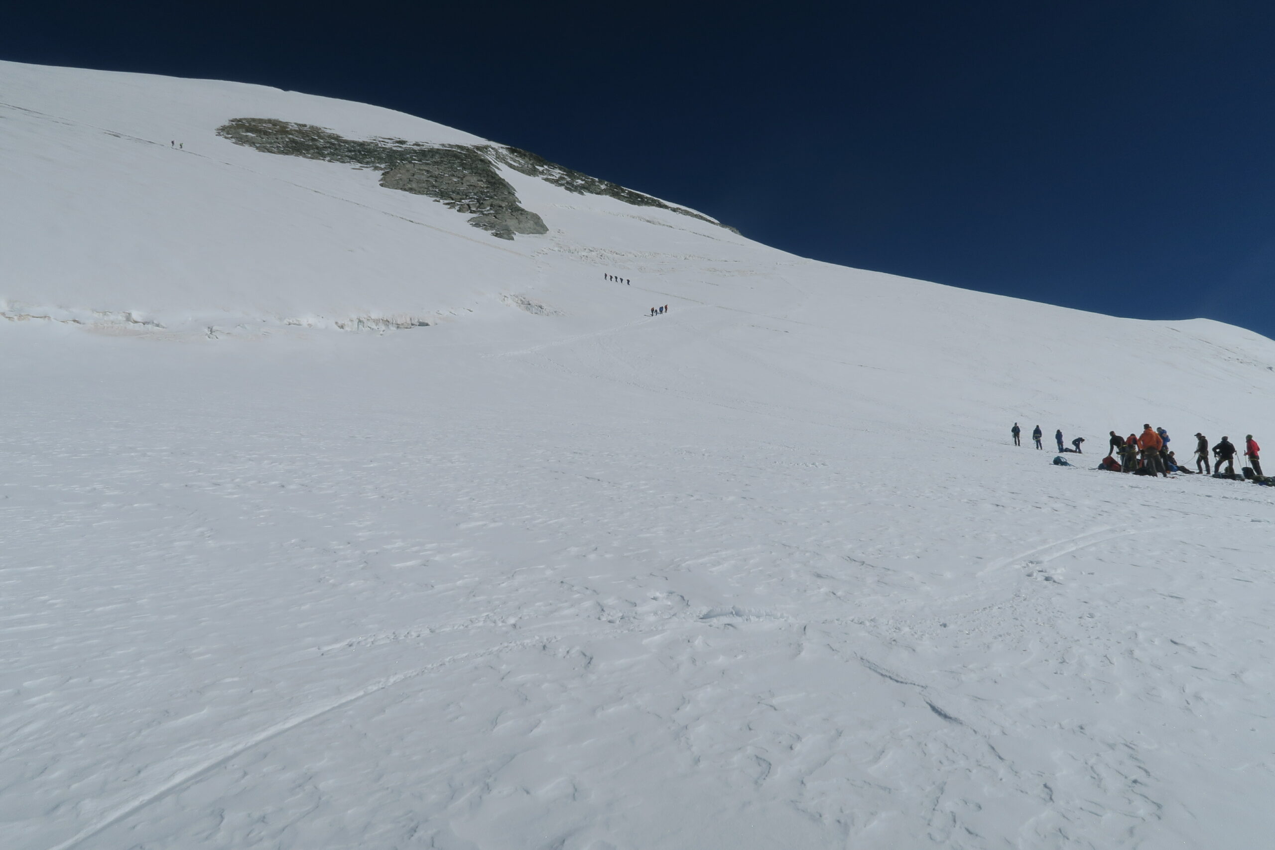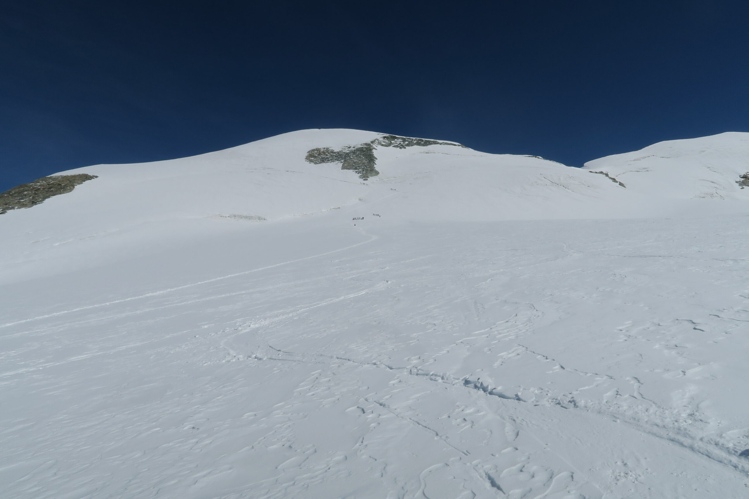 Ho lasciato gli sci sotto l’ultima rampa per timore dei crepacci coperti dalla neve fresca ed ho seguito la comoda traccia