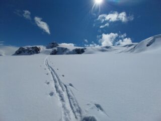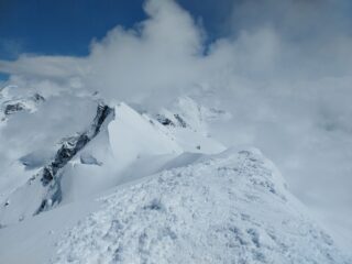 Prima volta per me a Cervinia, partiti da Cime Bianche. Brutto ovunque ma sopra di noi un oasi di sole, una bella botta di culo. La salita è stata tracciata la mattina da una guida poichè nella notte aveva messo giù un po’ di neve fresca.