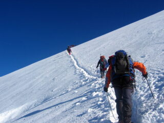 Gita effettuata in due giorni, dormendo al Rifugio delle Guide del Cervino. Prima parte a bordo pista ben poco interessante, meglio lungo la traccia che attraversa il plateau dei Breithorn. La parete sud ben innevata facilita la salita finale alla vetta.