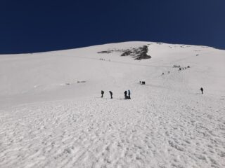 Condizioni eccezionali lassù. Si attraversano velocemente le piste e poi su traccia comoda e larga si arriva sotto il pendio finale.Ottima traccia per la salita alla vetta occidentale e ottima la continuazione per il centrale. Niente freddo purtroppo.