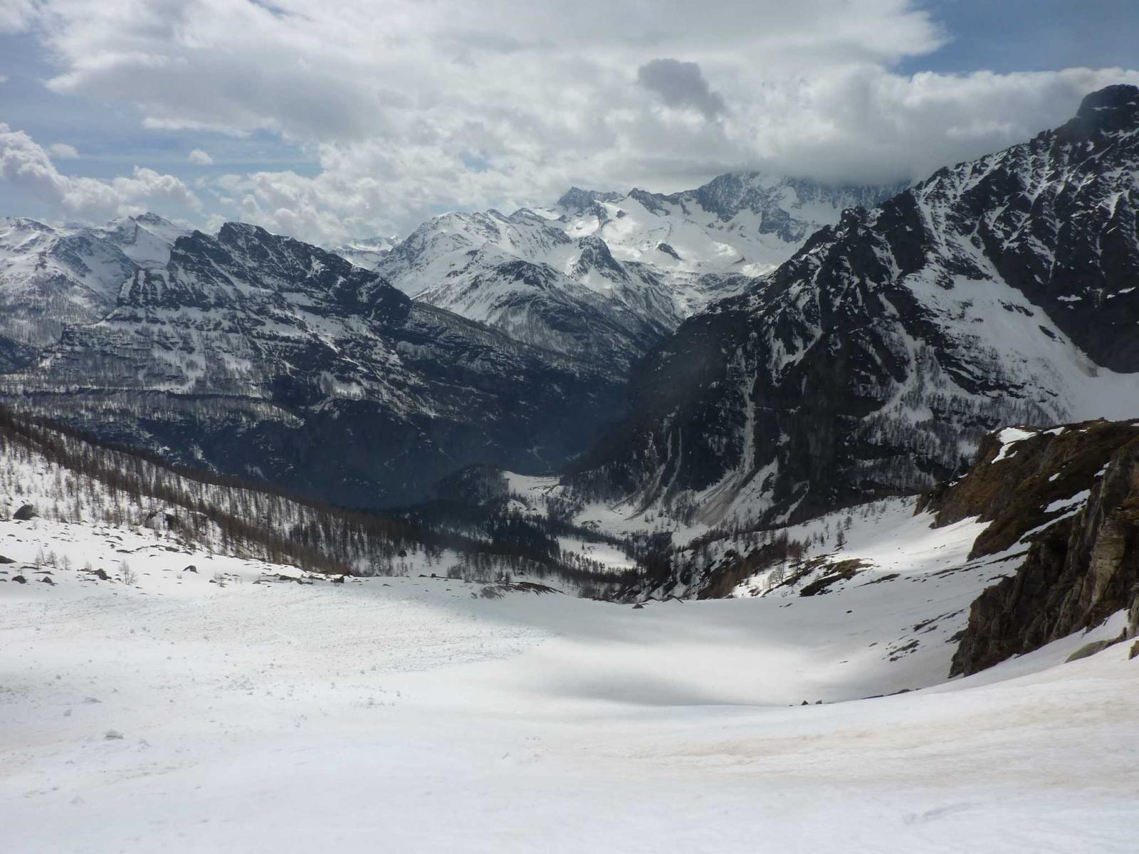 Riportarsi sul Breithornpass e scndere in direzione E l’Alpjergletscher portandosi ai piedi della Stichelgrat, quindi scendere in direzione S portandosi fino alla quota 2878m, scendere il pendio esposto a SW tra le rocce fino a quota 2650m in modo da pervenire ad un pendio tra due salti di roccia, seguirlo diagonalmente in direzione NE fino ad un laghetto (è quello mediano dei tre segnati sulla carta, ZIe Seene 2610m). Risalire pochi metri in direzione del Pizzo Fne e traversarne il pendio SW in direzione SE fino a superare una costa e scendere i ripidi pendii S sotto il Passo Carnera (pericolo valanghe) puntando alle baite di Erblatte (1959m), senza raggiungere le baite spostarsi progressivamente a sinistra per rimanere sul dosso in direzione S passando per Gise (2030m), Piäneza (1862m) girando progressivamente verso SW fino a Chemi (1857m), superare il ponte ed arrivare sulla strada. E’ anche possibile da Erblatte rimanere un po’ più a W seguendo il tracciato del sentiero e scendere il ripido bosco su Inri Alpa ed Inri Biela, e prendere la strada fino a Egga (solo con innevamento abbondante). Seguire la strada fino al suo termine passando per Egga (1588m), Wälshimatta (1530m), Sistulmatta (1460m) facendo attenzione ai colatoi di valanga che la attraversano.