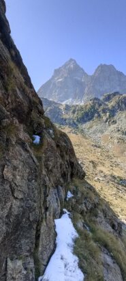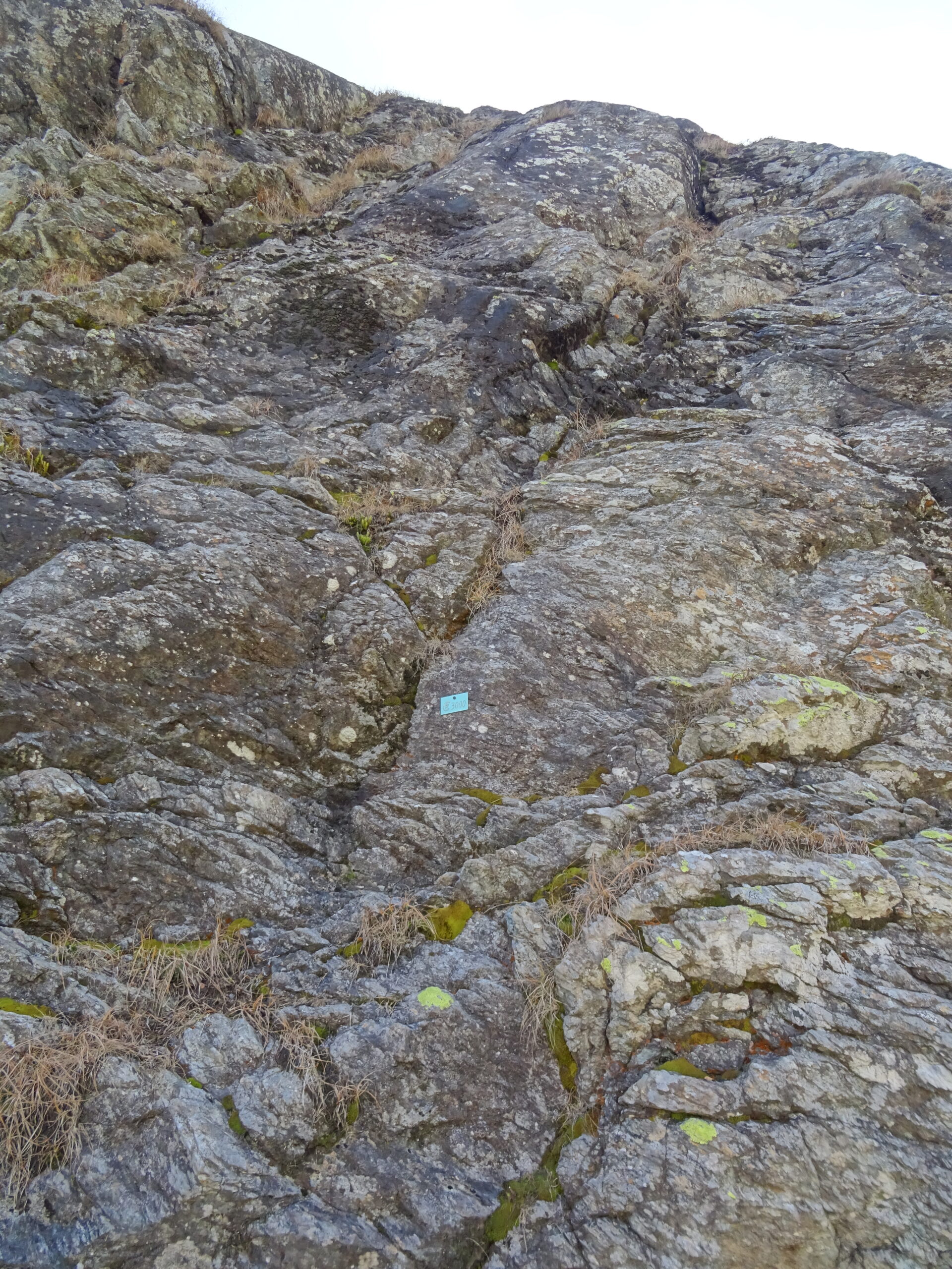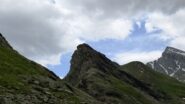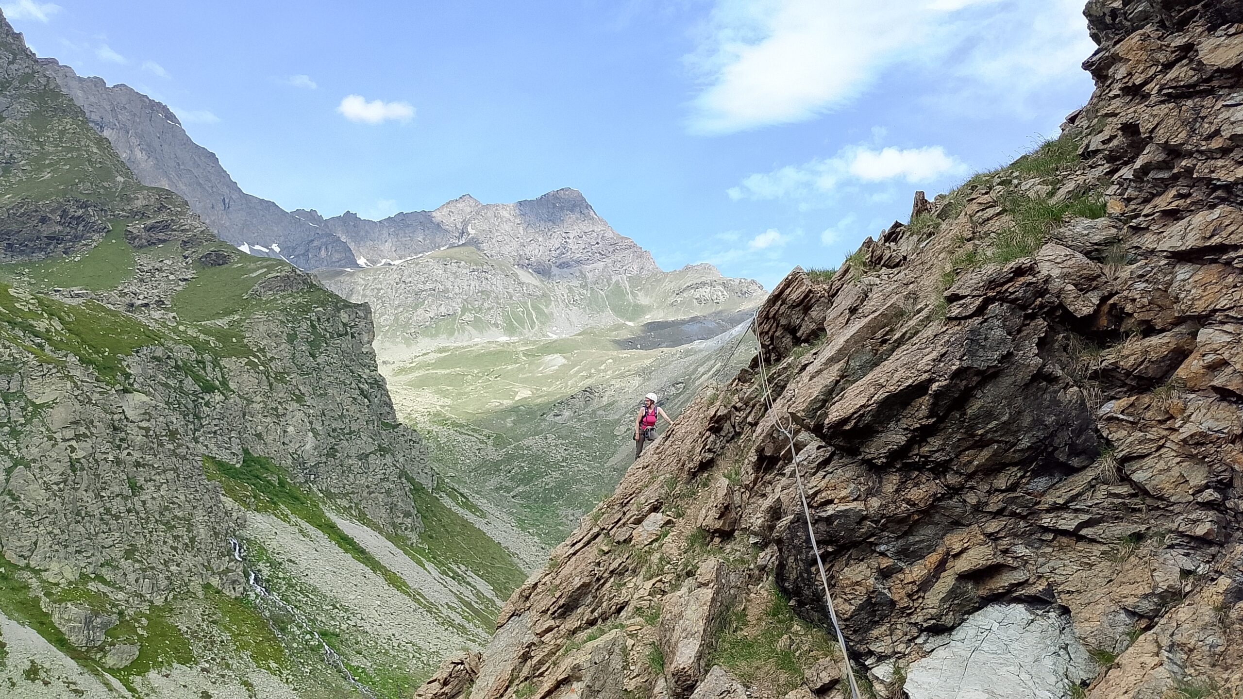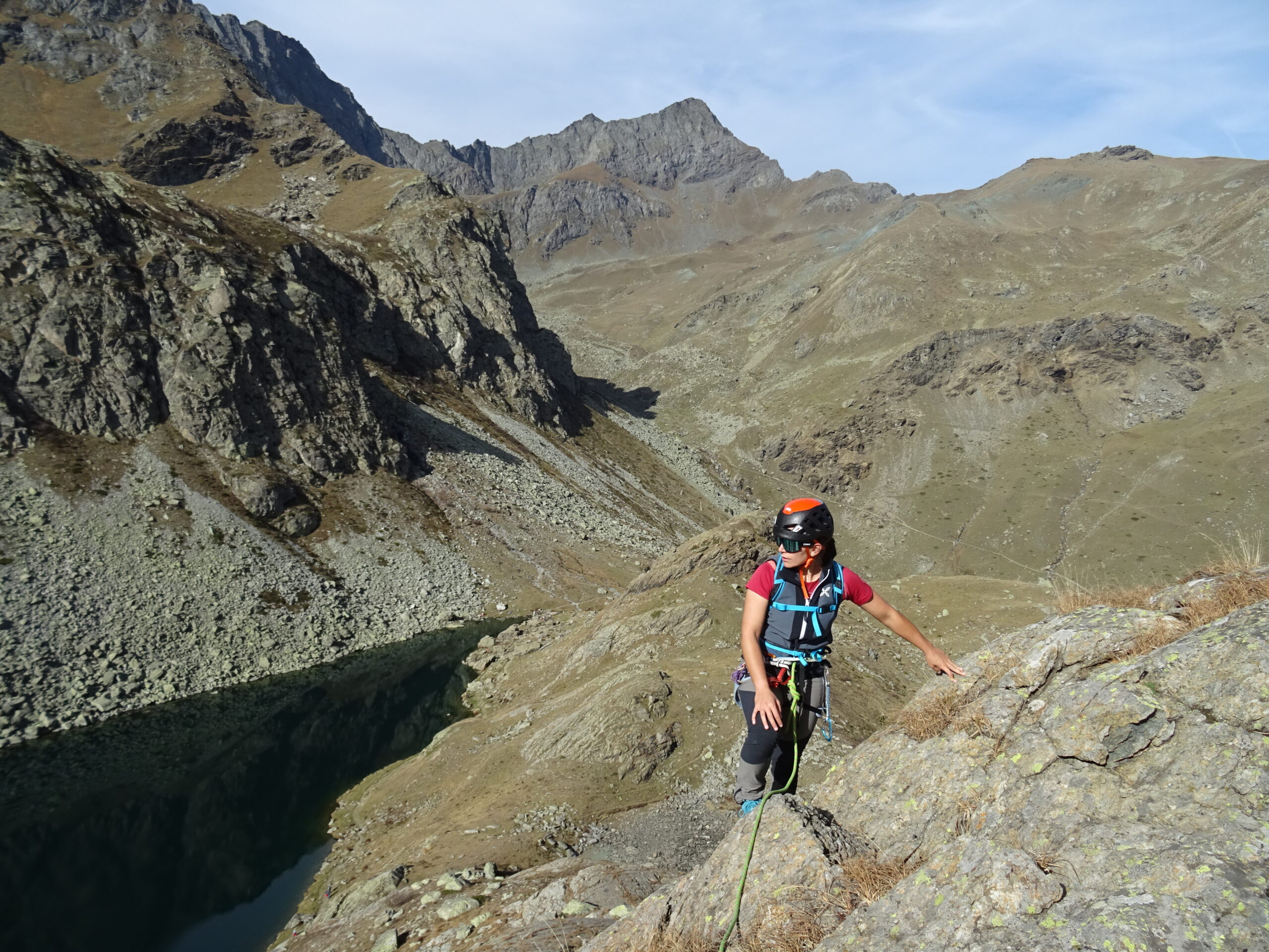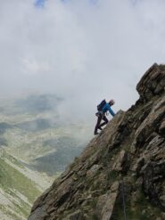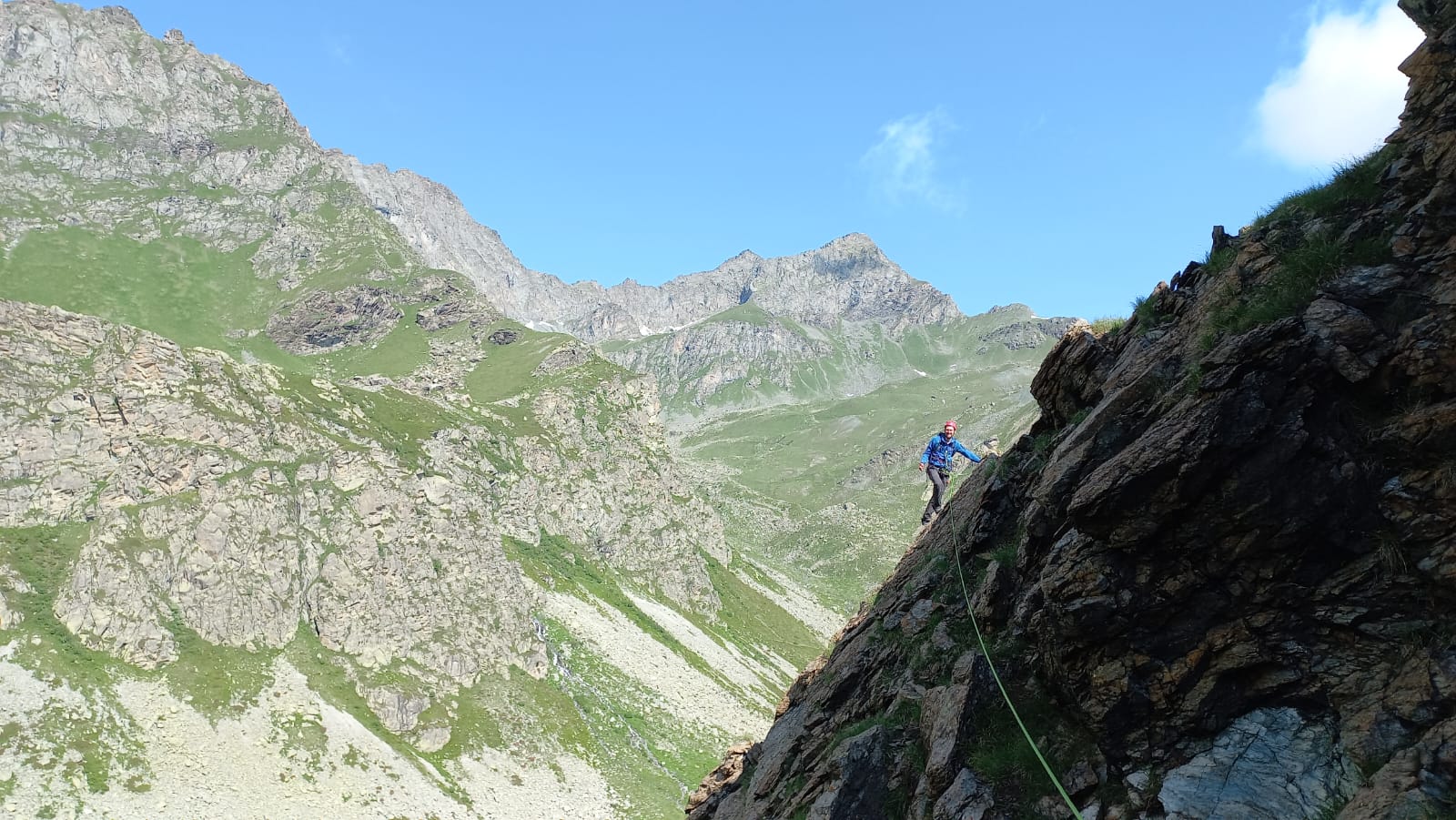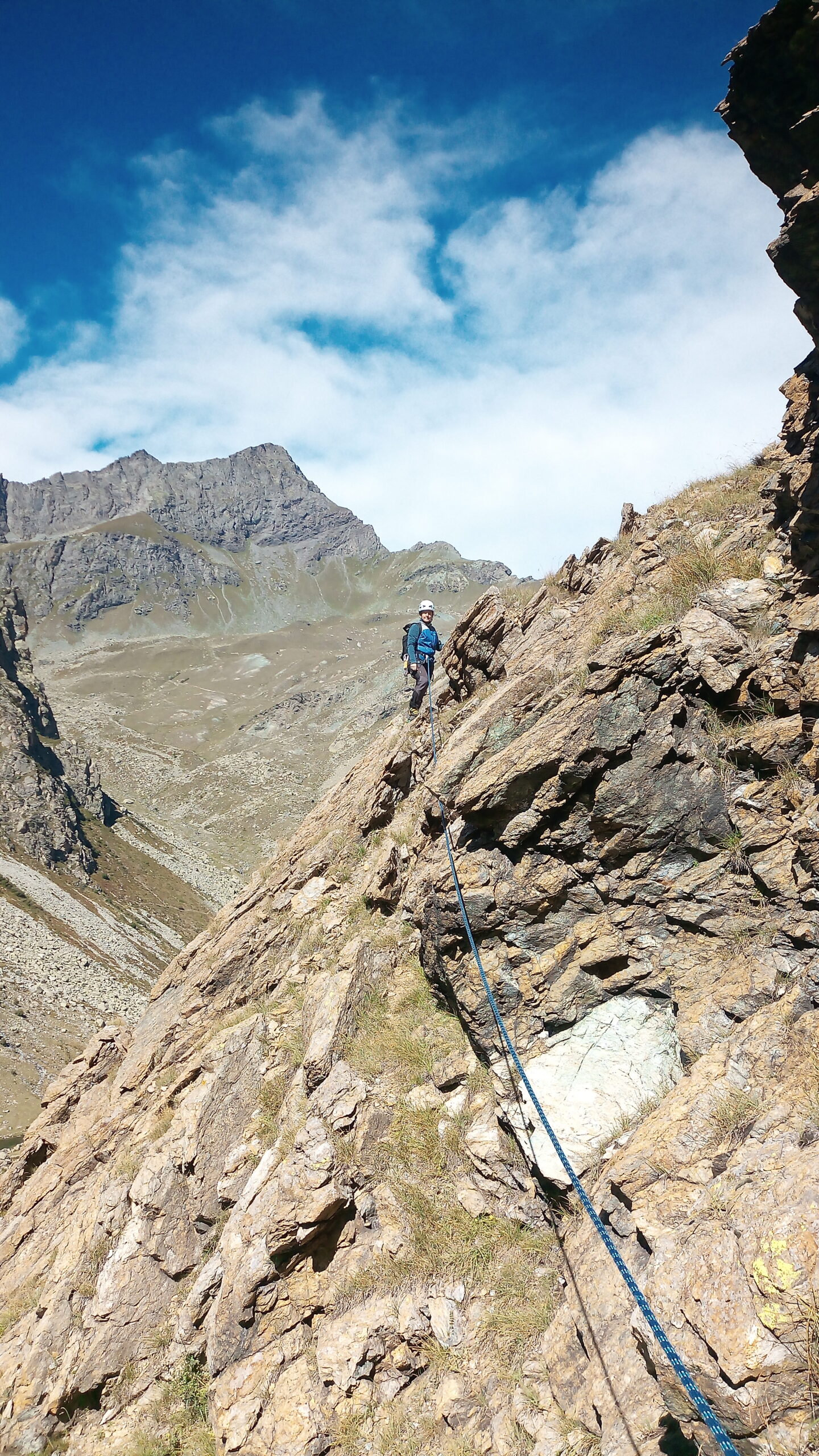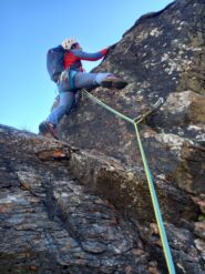 - L3: superare sulla dx la breve placca liscia (III+) o evitarla facilmente sulla sx, quindi proseguire senza difficoltà fino alla base della cresta vera e propria