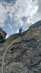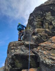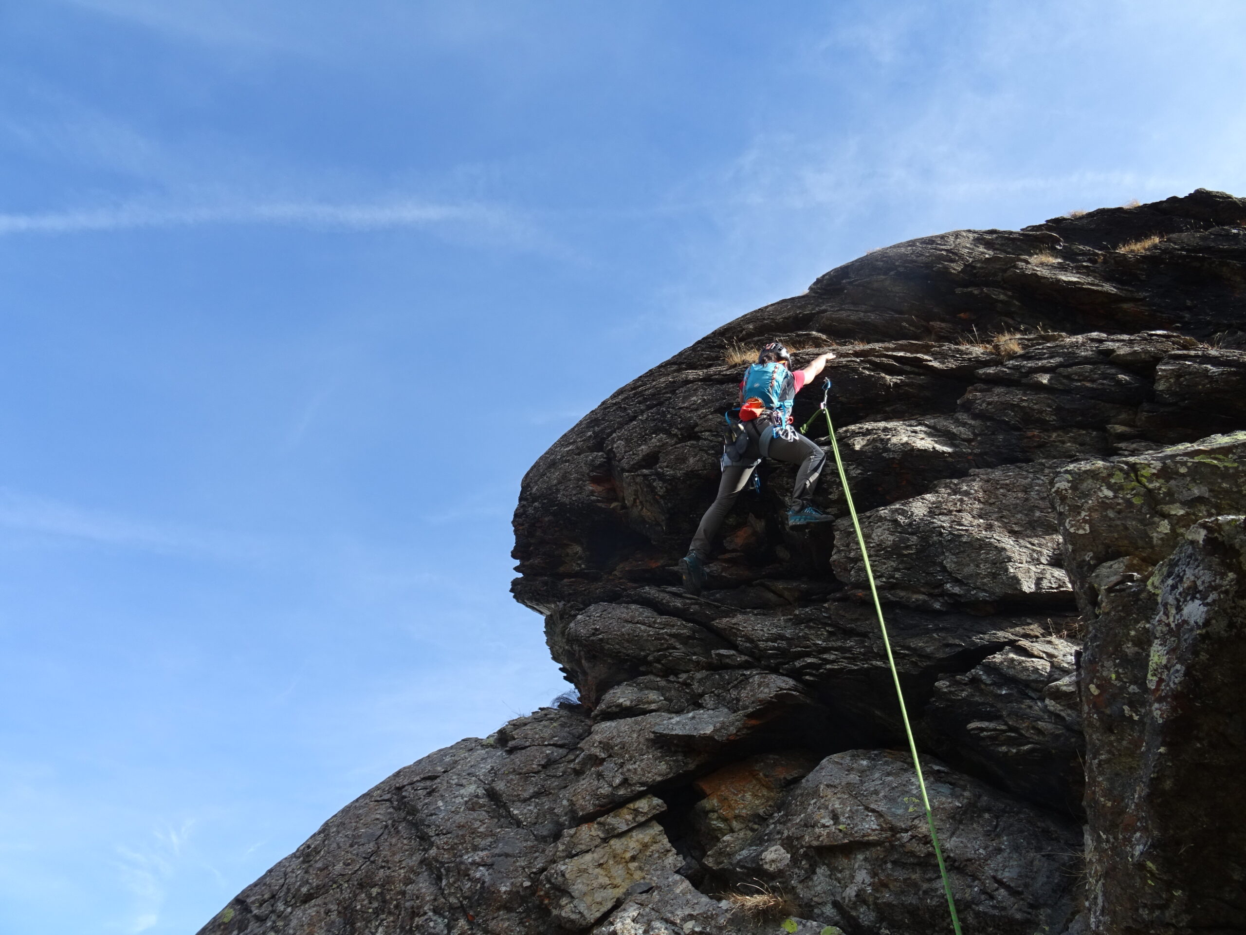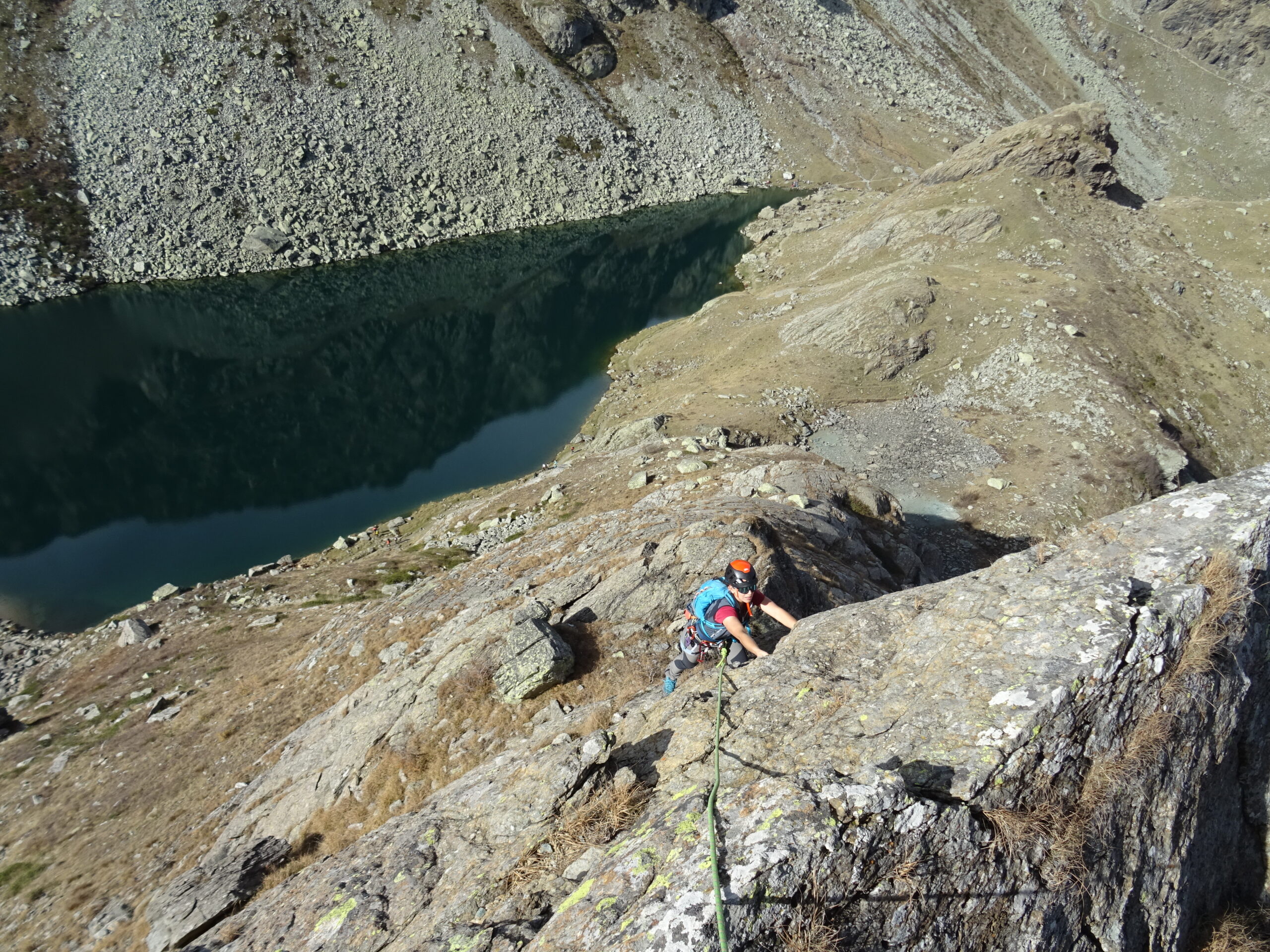 - L7: salire il tettino con un passo iniziale più delicato (IV), quindi riprendere il filo di cresta (breve tratto esposto) e tramite un ultimo saltino (III+) si raggiunge la cima.