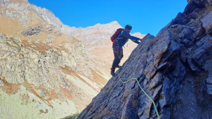 - L5: dalla sosta salire verticalmente per alcuni metri (IV-, 2 fix), quindi non proseguire sul filo ma traversare a dx abbassandosi su sfasciumi per alcuni metri. La sosta è nella placca di fronte (2 fix da collegare).