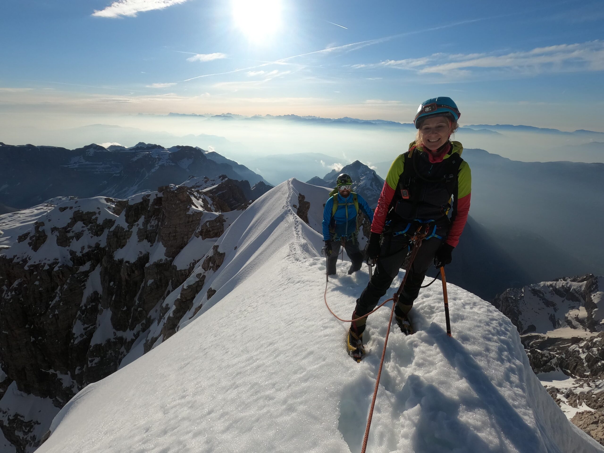 Partenza alle ore 2 con le torce frontali prima per il sentiero estivo e poi nel vallone in direzione della bocca di Tuckett fino a raggiungere la base dello scivolo sulla destra. Cominciare a risalire il canale, nella prima parte ampio, con un’inclinazione di circa 35° con le attuali condizioni. La neve sfonda un pò ma non troppo, si riesce ad arrivare sotto alle prime rocce a sinistra solo con gli scarponi. Indossati poi i ramponi si comincia a risalire la parte più ripida, piccolo tratto ghiacciato al centro, ma la salita procede agevolmente. Nella parte più alta dello scivolo superati alcuni metri piuttosto ripidi, fino a 55°, si arriva a una sella nevosa, abbastanza instabile da risalire per la neve che sfonda. Dalla sella si sale a destra in direzione della cresta, con alcuni passaggi un pò poco agevoli, sempre per le condizioni della neve che offre poco sostegno ed è abbondante per tutto il tracciato, nascondendo completamente anche eventuali protezioni esistenti. Arrivo alla cima superando un tratto esposto ma ben tracciato. Discesa dalla via di salita disarrampicando, con cautela nella prima parte del canale sfruttando bene le tracce di salita, poi faccia a valle fino all’imbocco del canale dove inizia il tratto di rientro al rifugio, decisamente sfondante alle ore 9, si sfonda fino alla vita, la parte più faticosa dell’intero percorso.