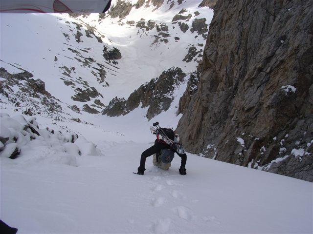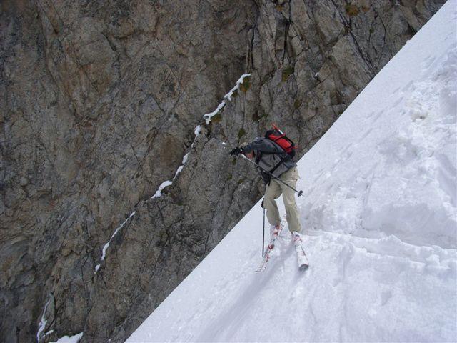 la parete si presenta bene di un bel colore bianco da neve fresca, ma la temperatura alta maffeggia il fondo. Parte alta limite e “sgoulottamento” nella parte bassa, discesa discreta considerando la stagione. Gita effettuata con Andrea Schenone. Risalito poi al Tablasses e sceso il canale classico verso il Valasco.