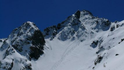 Salito con Swiffer venerdì sera alla Casa di Caccia… al mattino ci raggiunge Bonollo (ora con la famiglia non si può più far quel che si vuole!). La neve inizia al Pian del Valasco… ancora per un po’ se tengono le temperature. Nel conoide molta neve farinosa, fin troppa… proviamo comunque qualche metro nel canale e vediamo che la quantità di neve diminuisce, possiamo salire… affonda giusto lo scarpone, mentre la parte alta presenta solo più una decina di cm di fresca.