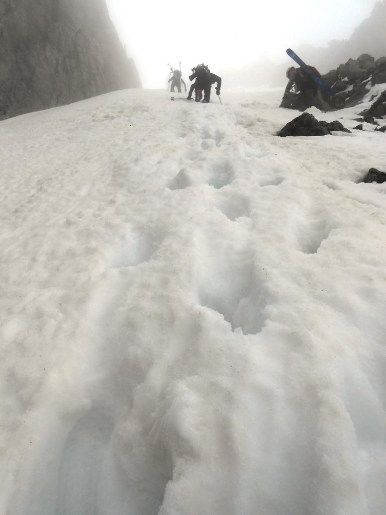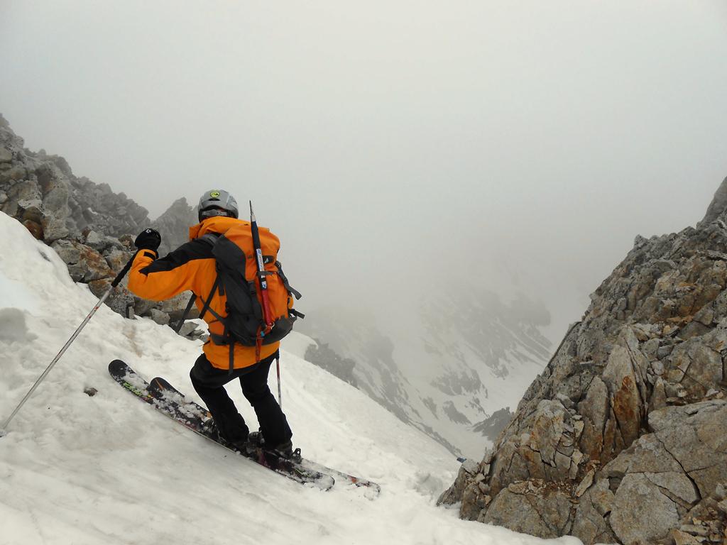 Portage sino a q.2000 (dal Valasco seguito il sentiero e calzati gli sci all’uscita del bosco, la gorgia è ormai impraticabile). La nebbia del 1° mattino ha inumidito la poca neve recente, che poggia cmq. su un fondo ormai consolidato, specie in basso. Canale con il tratto ripido e più stretto un pò sfondoso, saliti con cautela. Uscita comoda, poi una brevissima crestina rocciosa conduce alla cima nord. Primo tratto dalla sella su neve umida ma ben portante, strettoia (ormai è tale) non propriamente rilassante (x me…), poi il canale si allarga e consente una buona sciata: bello il lunghissimo conoide, anche se dopo il ns. passaggio oltre all’aratura generale si è formata una discreta rigola.
