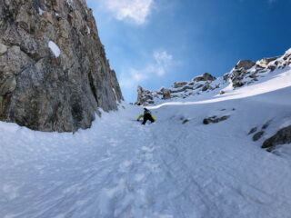 La parte più pendente è stretta, e ai lati, ci sono rocce affioranti, quindi curve saltate rimanendo dentro il canale, senza purtroppo andare sulla sinistra dove la parete pendio allettava molto, ma appunto, la neve appoggiava su rocce.