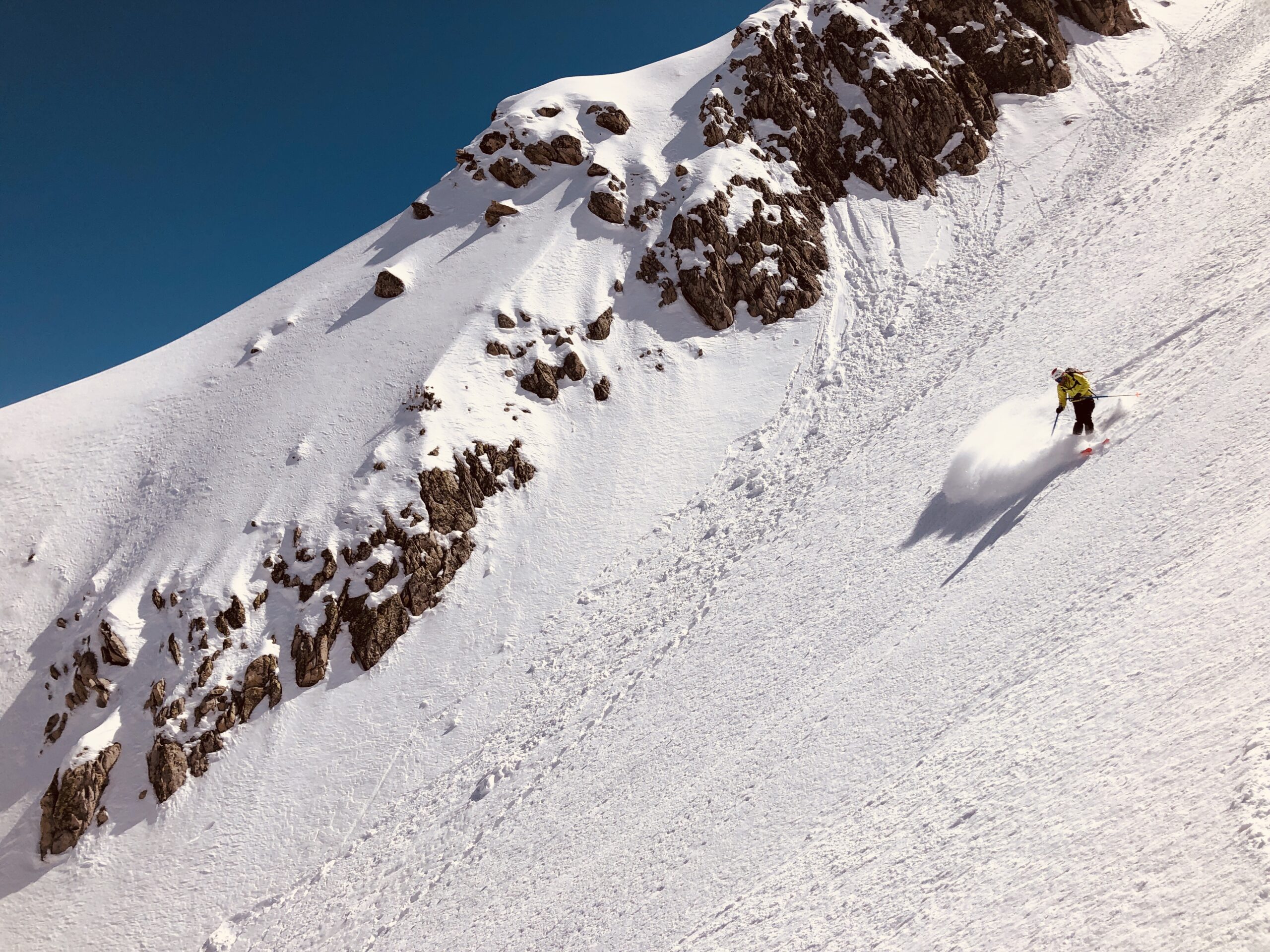 Tutto il pendio sotto il conoide con magnifica polverella densa. Dentro il canale sempre polvere vecchia densa che, nella parte finale più pendente, peggiorava un po’ di qualità.
