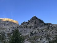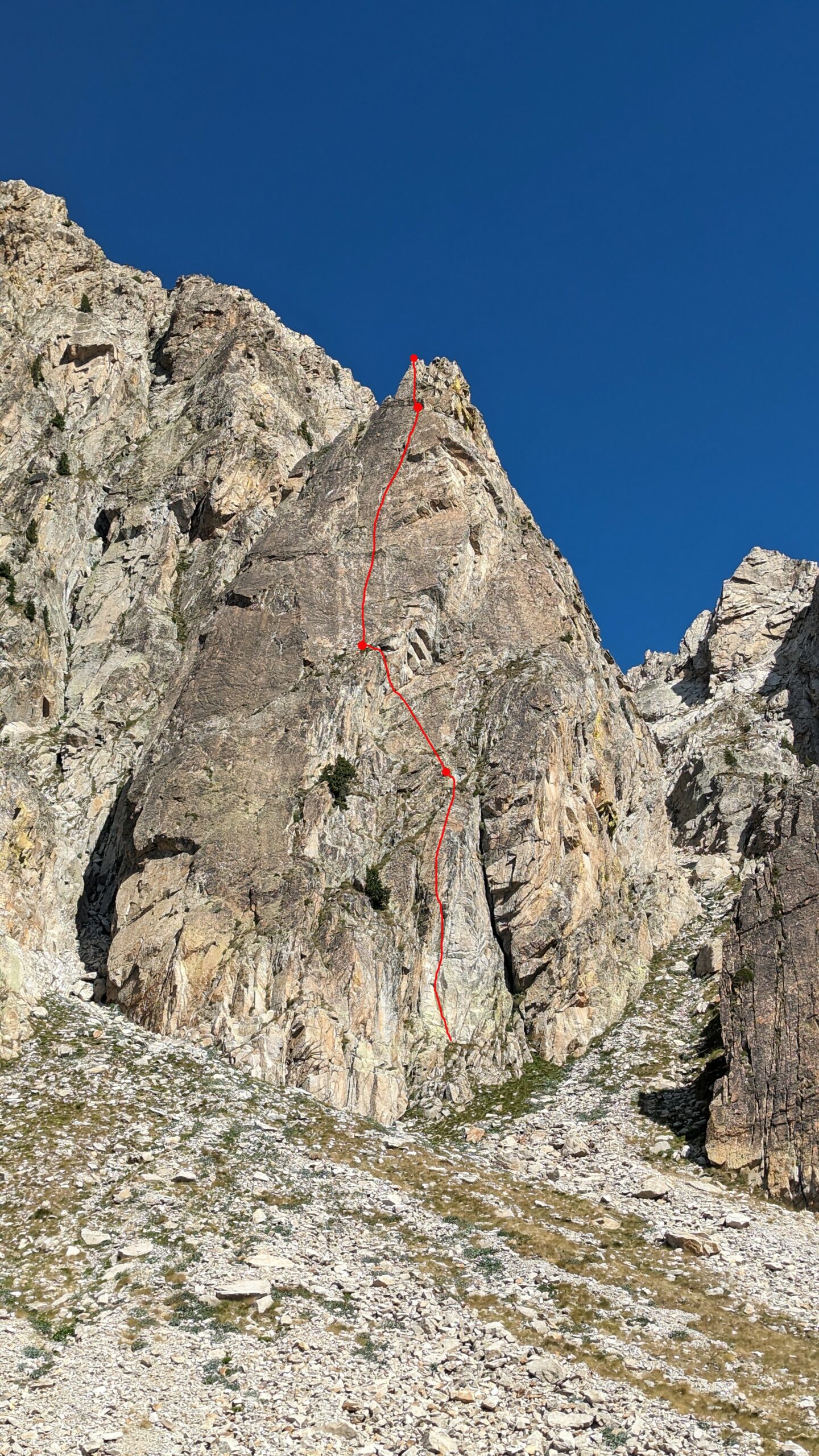 - 1) Scendere a piedi nel canale a destra del colletto faccia a valle (sfasciumi) fino a un blocco con cordino+maillon e per tracce di stambecchi attraversare su cengia erbosa verso destra fino a scollinare in un canale erboso, da qui agevolmente fino alla base della parete.